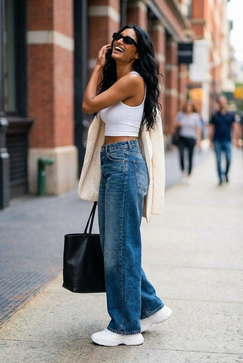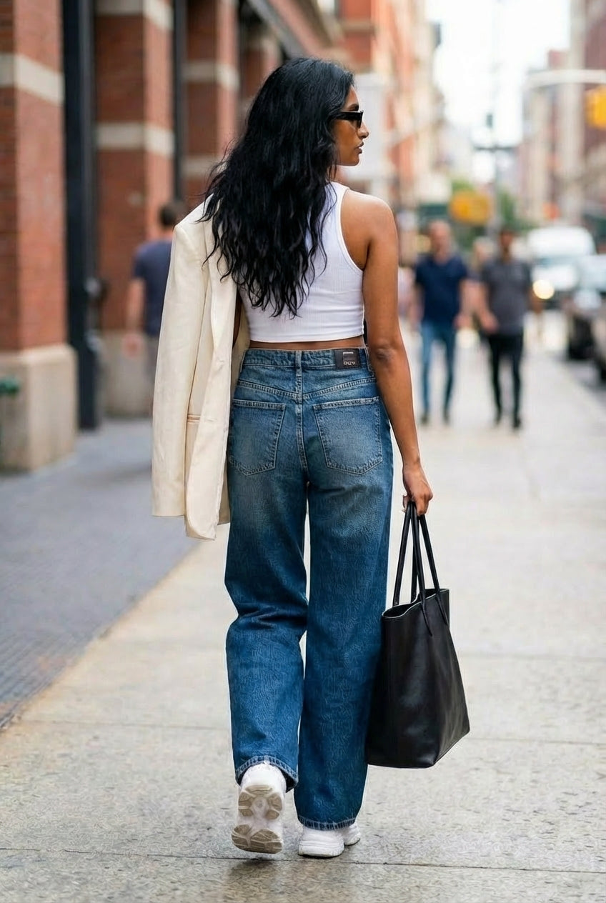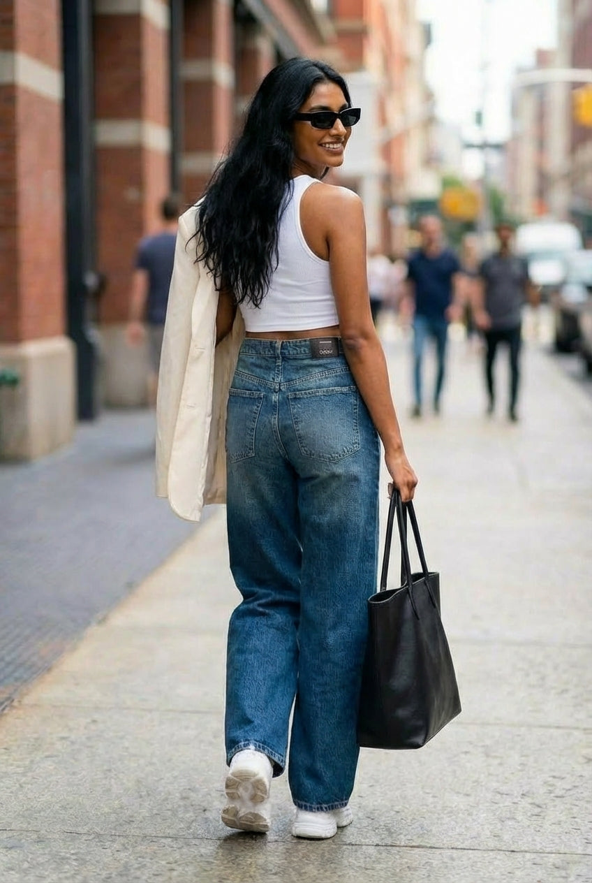 Calças wide leg em ganga com pernas largas desde a anca até à bainha, perfeitas para equilibrar proporções quando combinadas com peças superiores mais justas. Cinco bolsos funcionais. Tom de azul médio com efeito washed que confere um ar urbano e intemporal. Fecho frontal com fecho de correr e botão metálico.