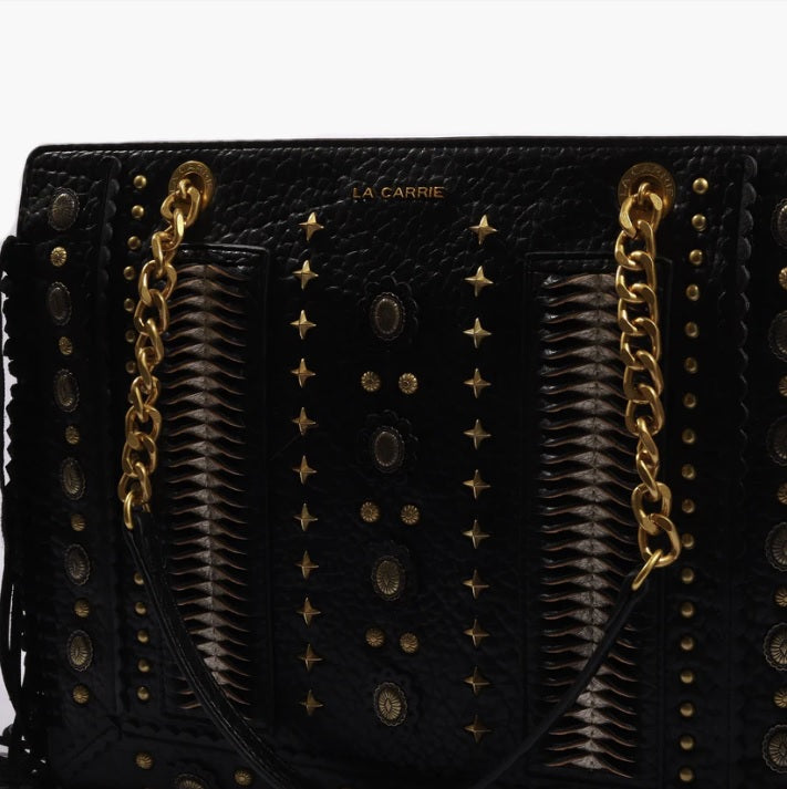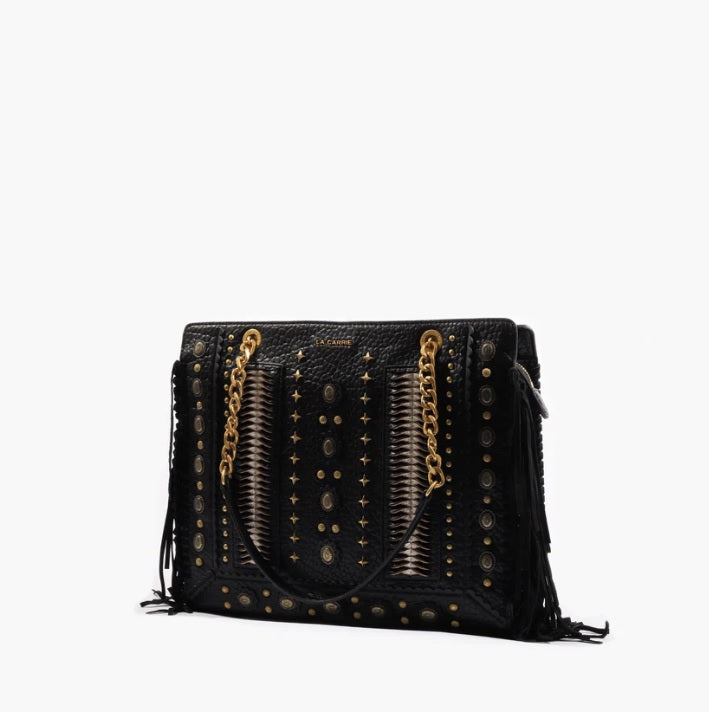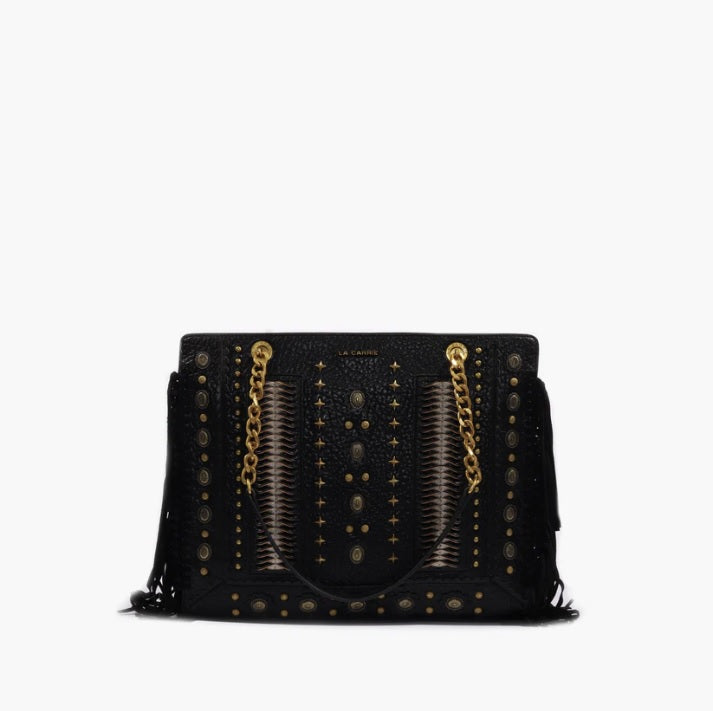 Mala de franjas e tachas aplicadas, com pega de mão e alça de ombro removível