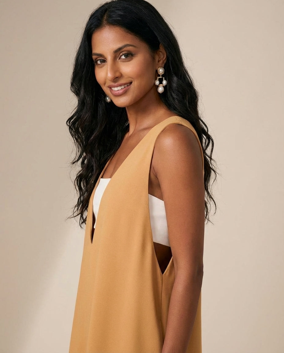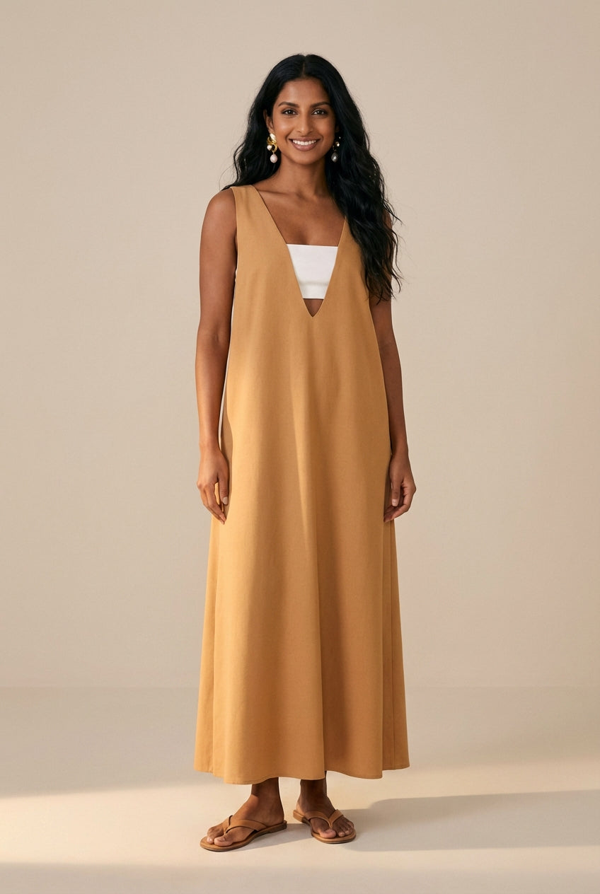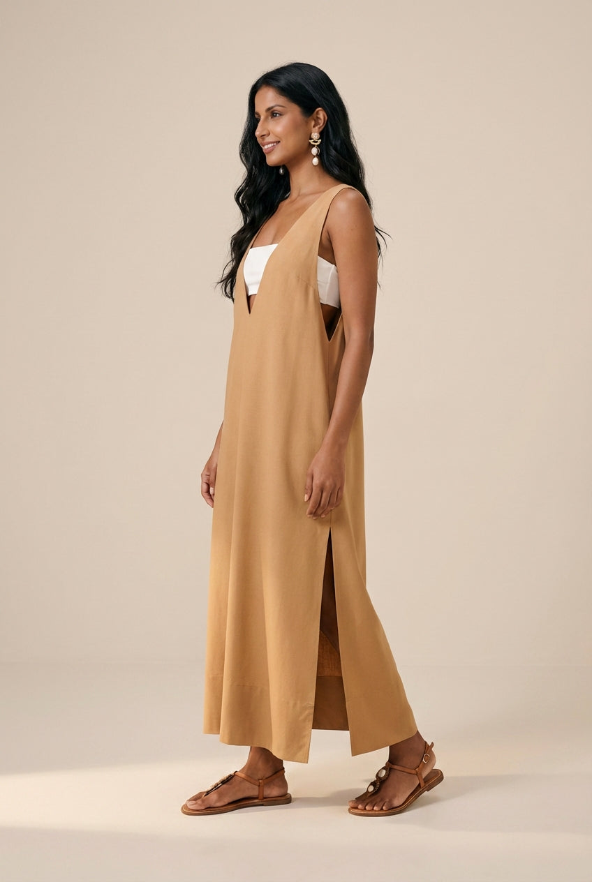 Vestido cropped em linho que combina elegância e conforto com detalhe off white no peito sob decote em V profundo, criando contraste sofisticado com o tom caramelo. Modelagem alongada com fendas laterais que facilitam o movimento e adicionam sensualidade discreta. Ideal para dias quentes, oferecendo liberdade sem comprometer o estilo.
