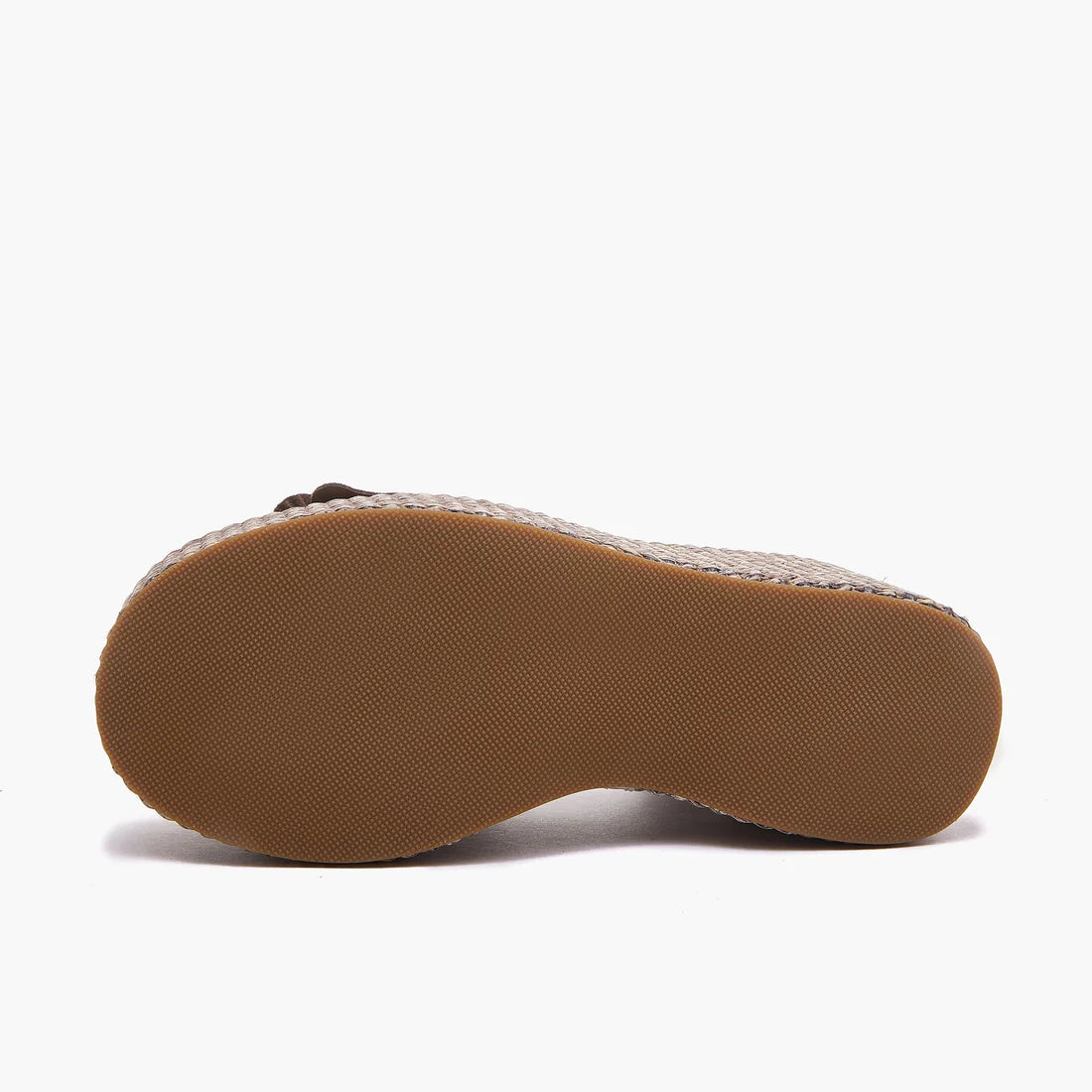 Sandálias de cunha em camurça castanha com detalhe tridimensional de flores artesanais na tira frontal, conferindo um toque romântico e feminino. A cunha é revestida em ráfia tecida com padrão bicolor, enquanto a tira ajustável no tornozelo com fivela metálica dourada garante maior segurança ao caminhar. Altura da Plataforma Frontal: Cerca de 45 mm (4,5 cm). Altura do Salto (Cunha): Aproximadamente 90 mm (9 cm).