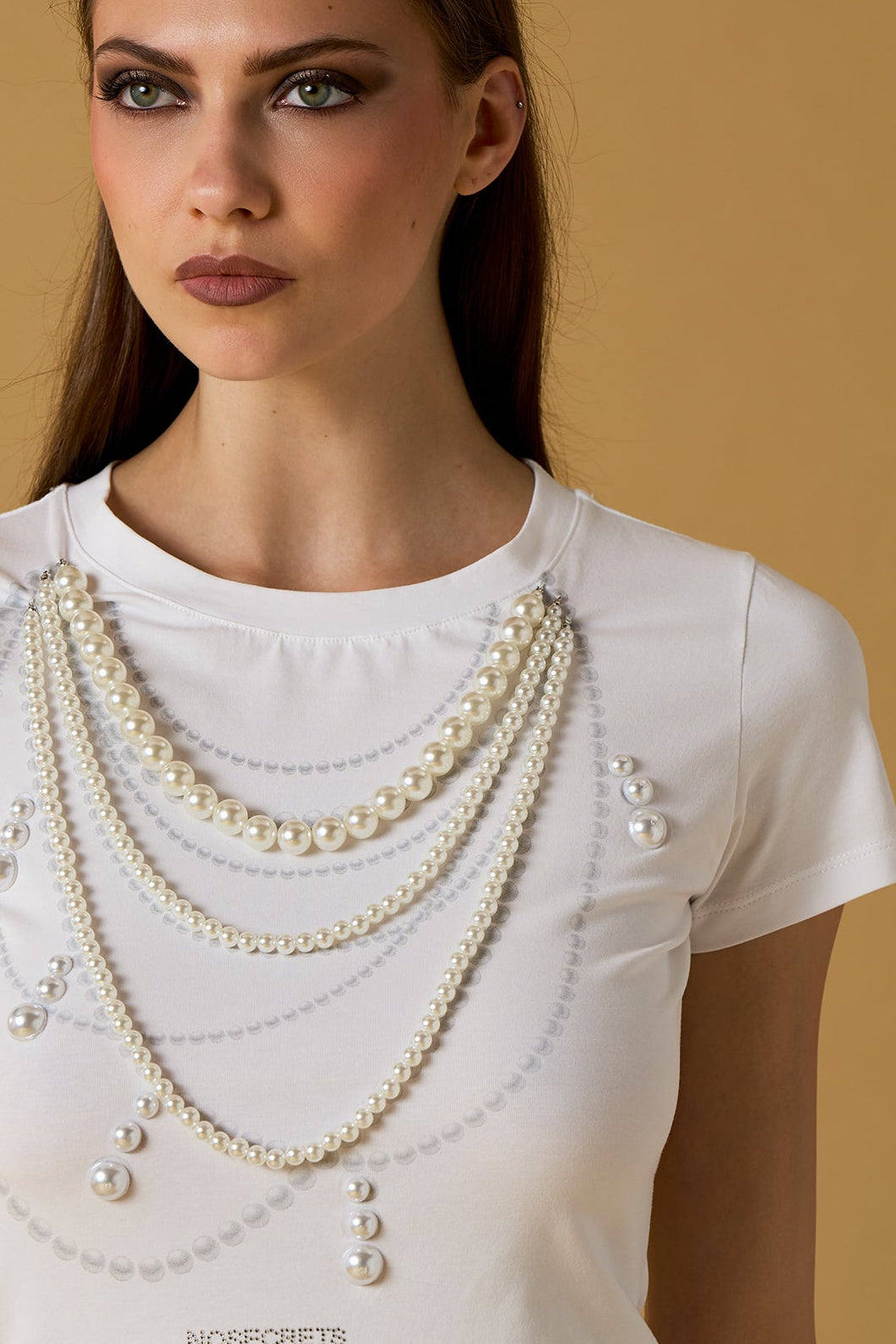 T-shirt em algodão com estampa exclusiva de pérolas no colar, criando um efeito visual sofisticado e elegante. Manga curta e decote redondo que combina com qualquer look. Peça versátil perfeita para o dia a dia, oferecendo estilo e conforto em uma única peça.