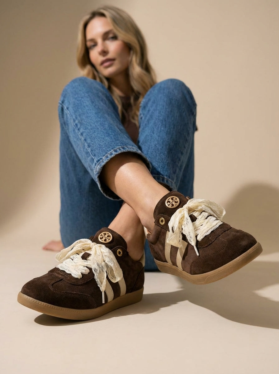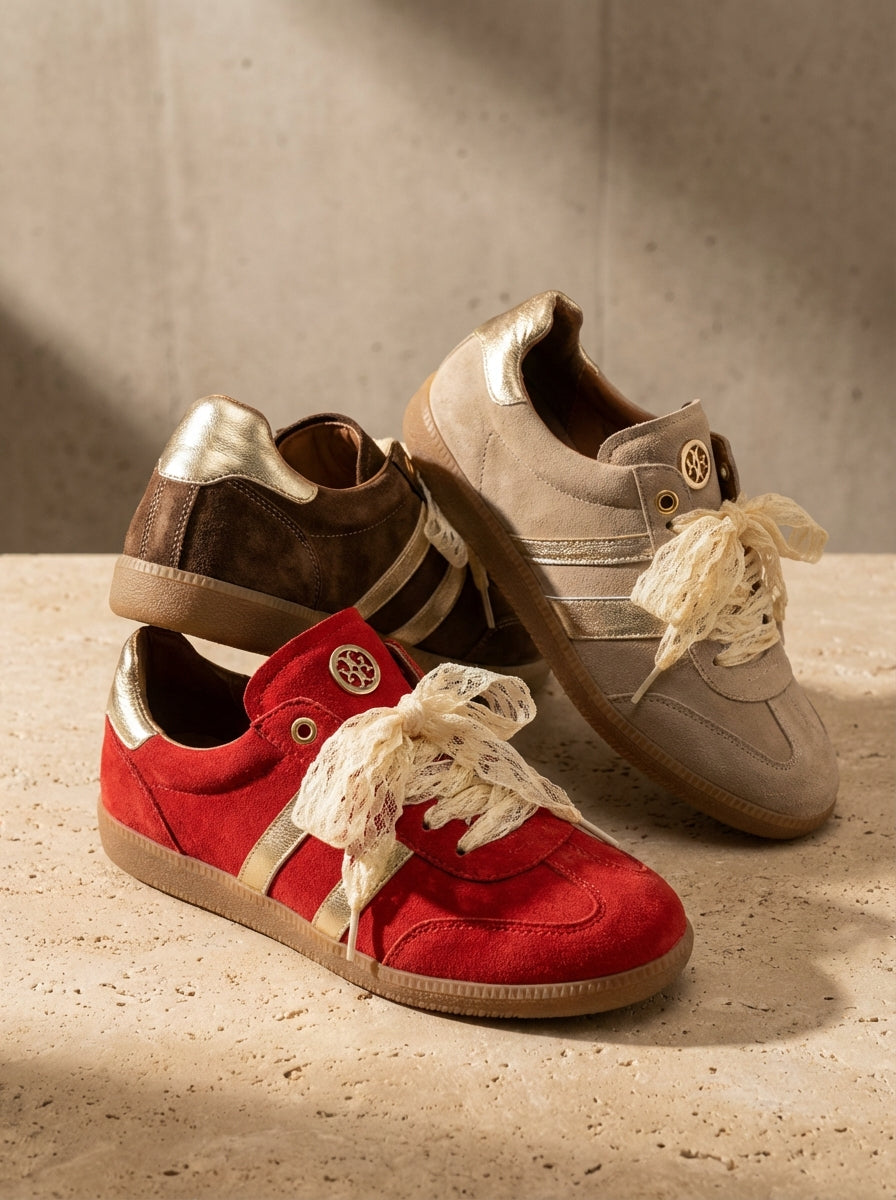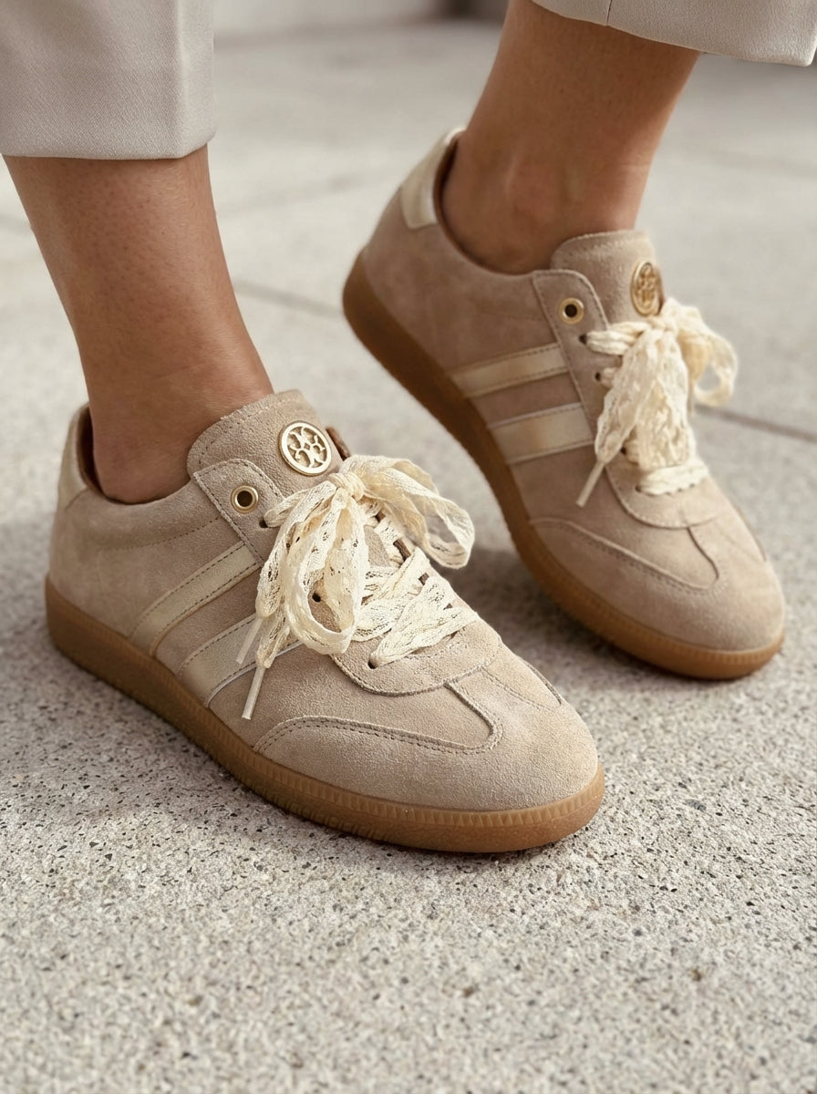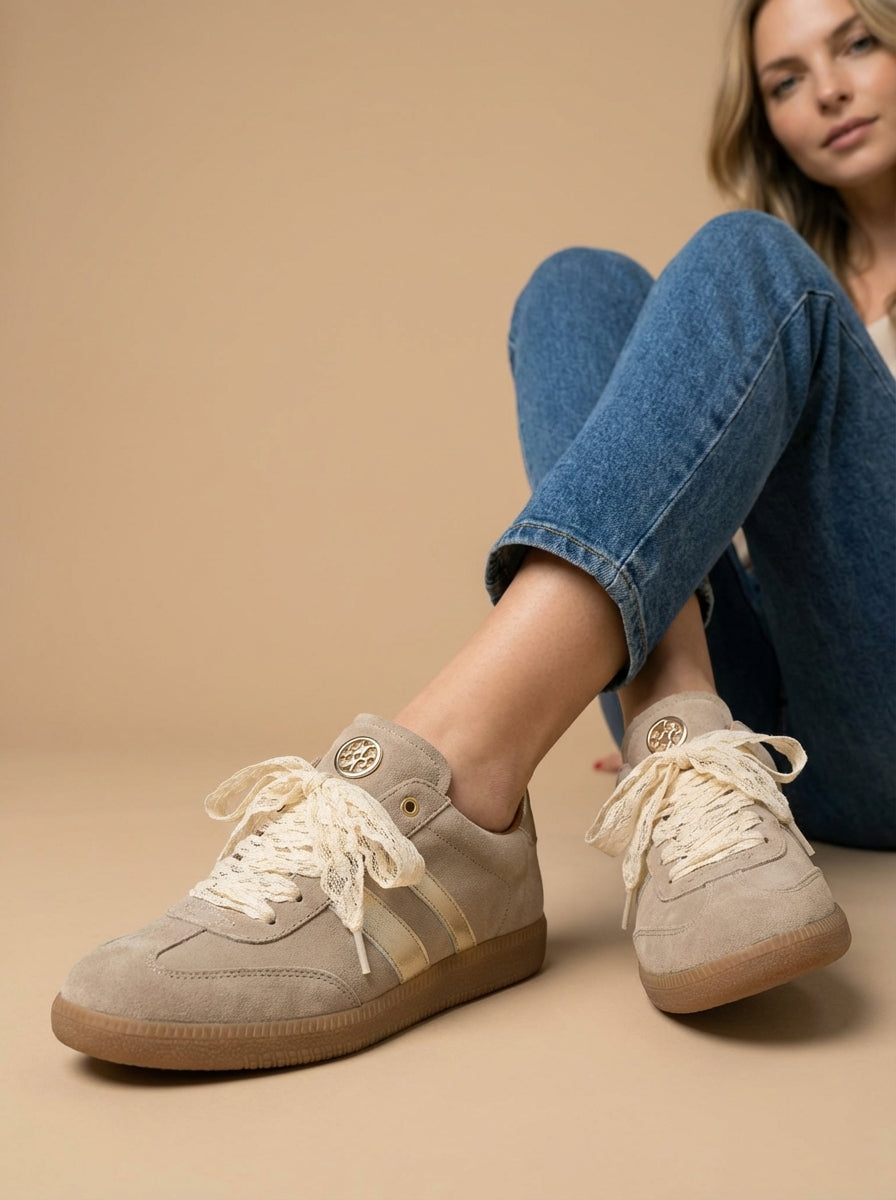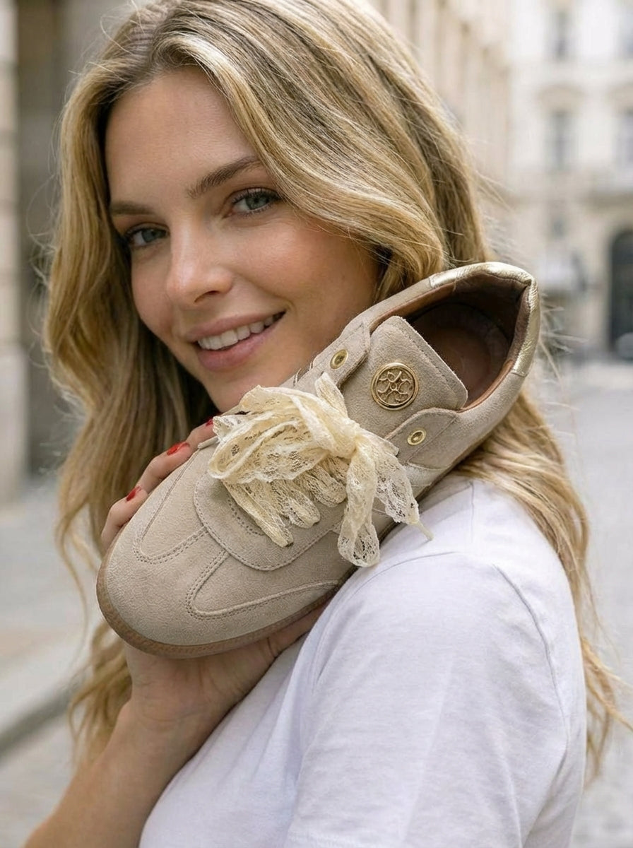 Ténis boho-chic devido à riqueza dos seus detalhes decorativos. Parte lateral e traseira em contraste de cor. O grande diferencial é a substituição dos atacadores padrão por fitas de renda largas em tom cru, que conferem um ar delicado e feminino à peça. Acabamento em ponta redonda. Altura da sola: 2 cm.