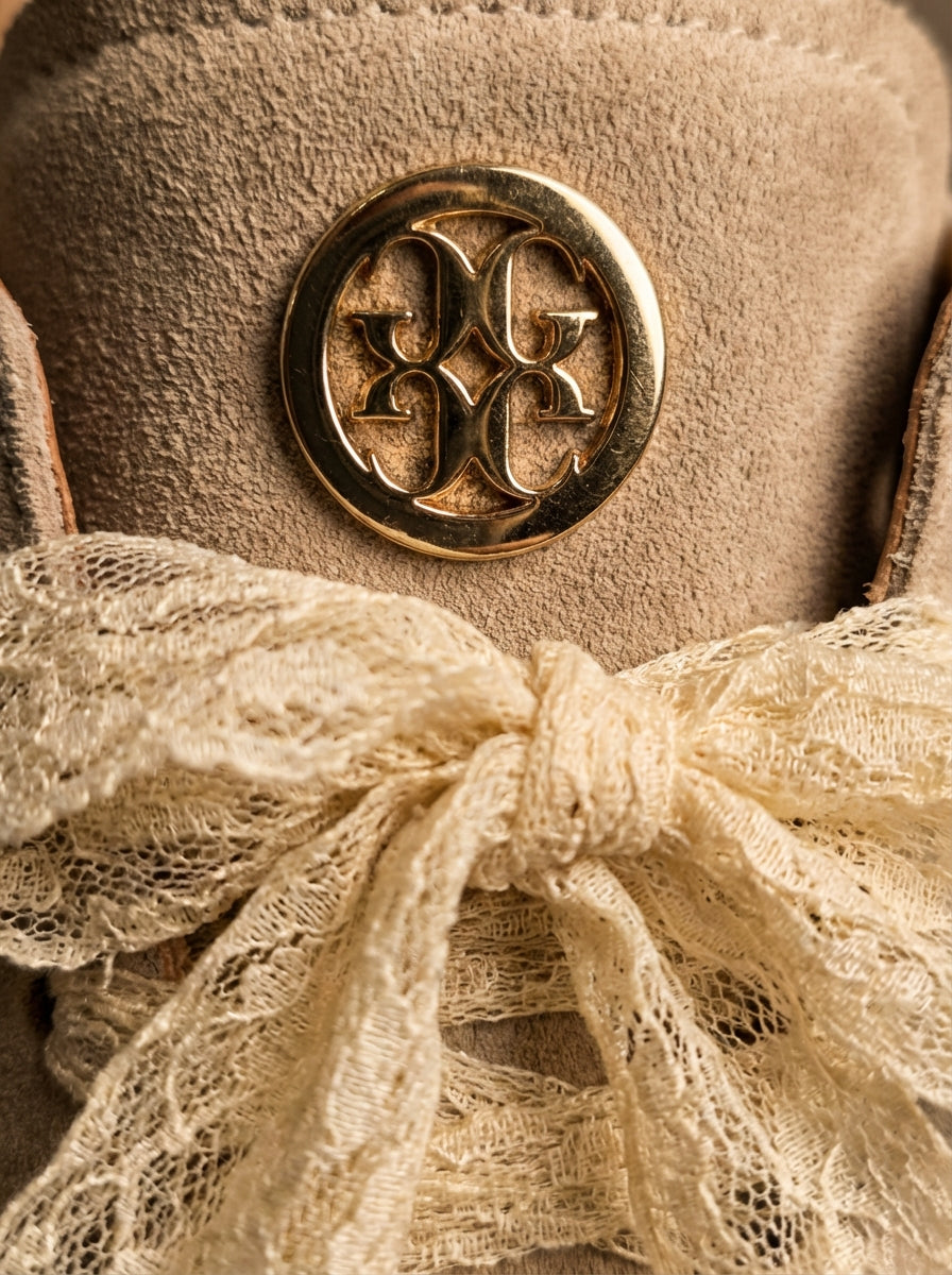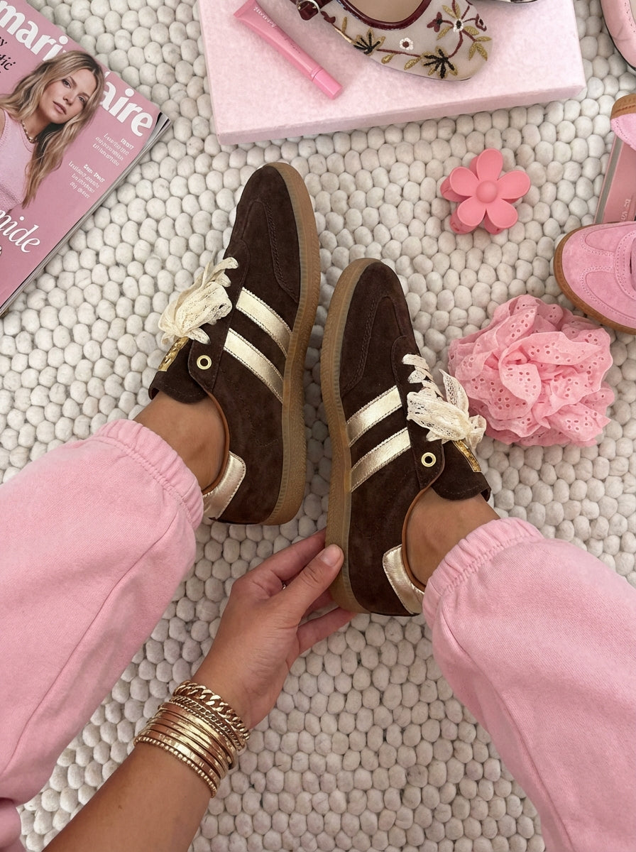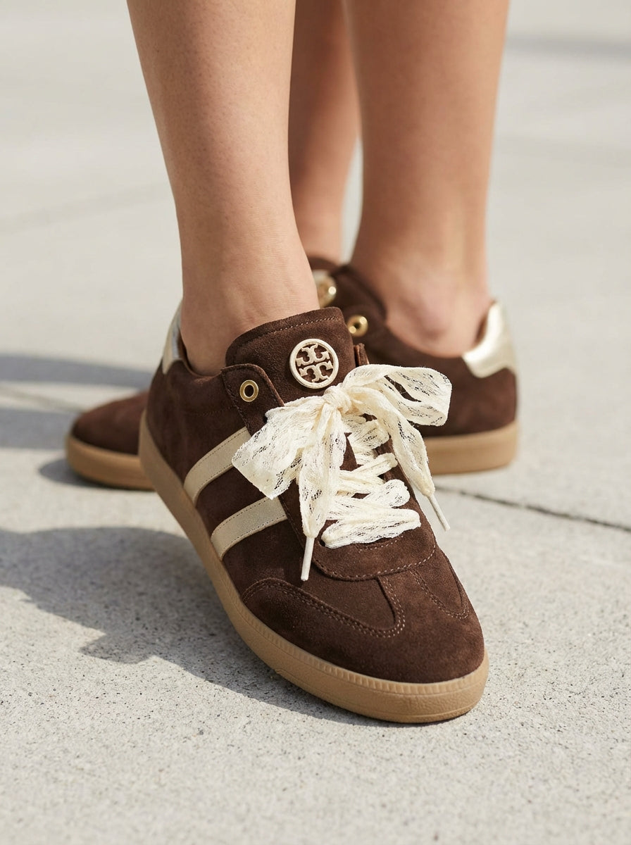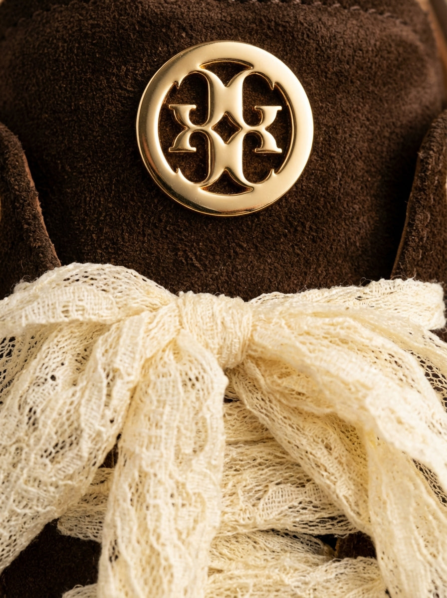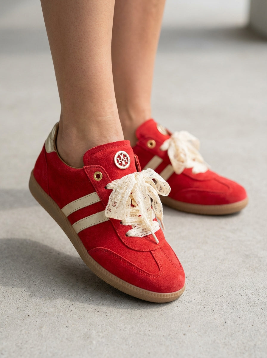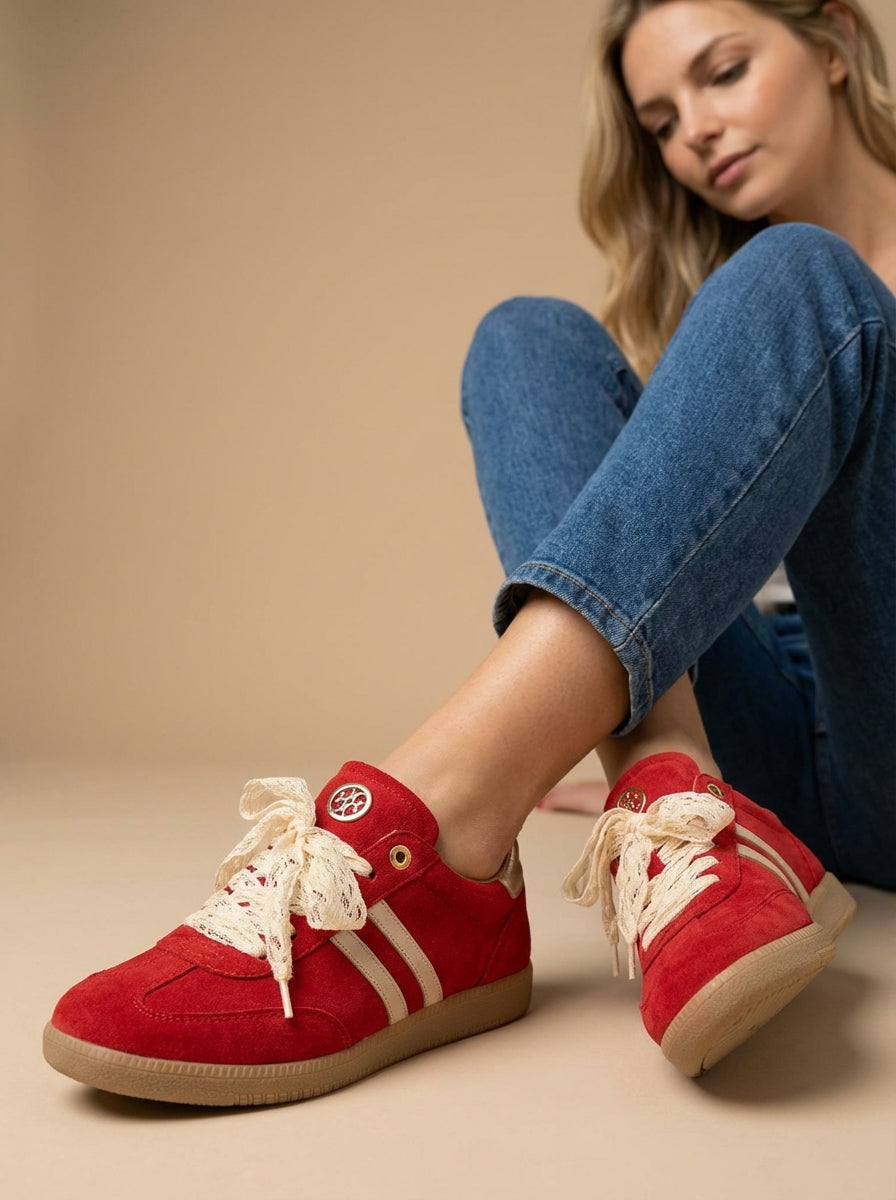 Ténis boho-chic devido à riqueza dos seus detalhes decorativos. Parte lateral e traseira em contraste de cor. O grande diferencial é a substituição dos atacadores padrão por fitas de renda largas em tom cru, que conferem um ar delicado e feminino à peça. Acabamento em ponta redonda. Altura da sola: 2 cm.