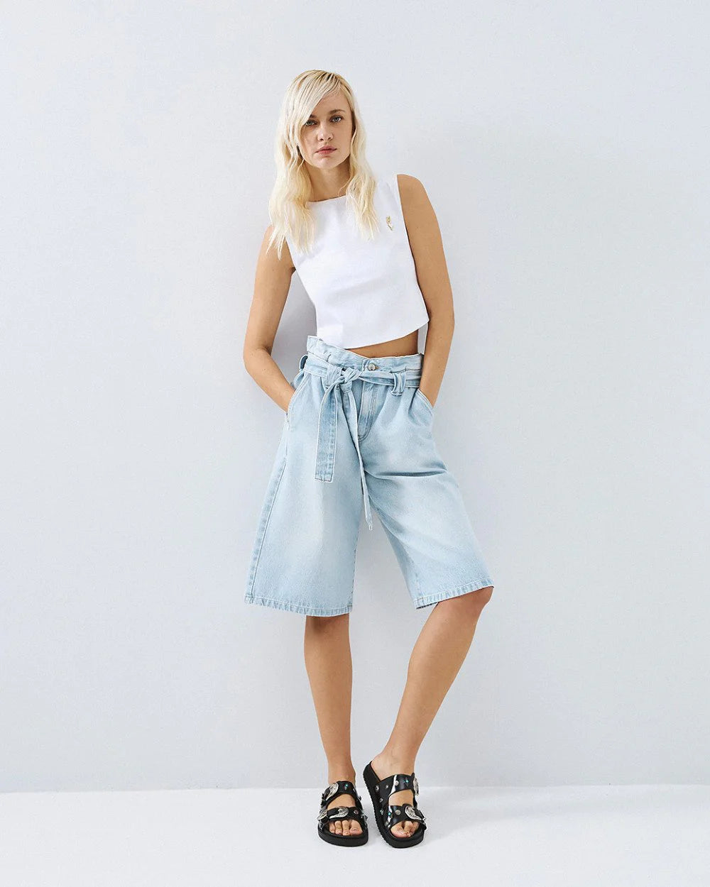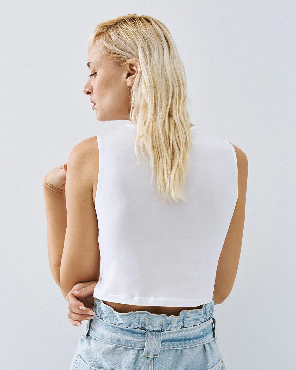 Top minimalista branco com decote redondo e manga cava, ideal para criar looks versáteis. O seu corte cropped e design simples tornam-no perfeito para combinar com calças de ganga num estilo casual ou com peças de alfaiataria para ocasiões mais sofisticadas.