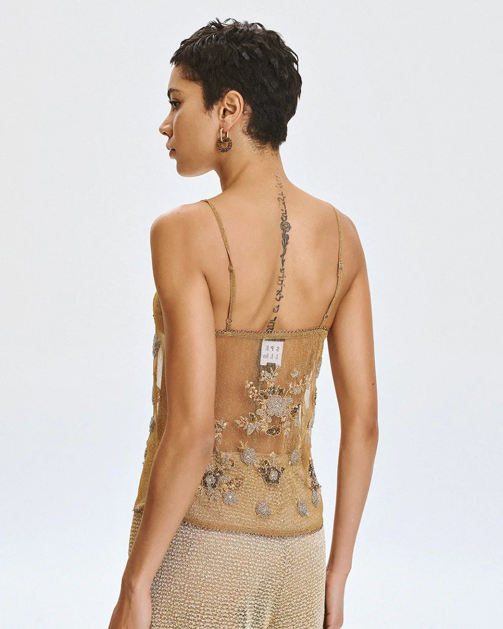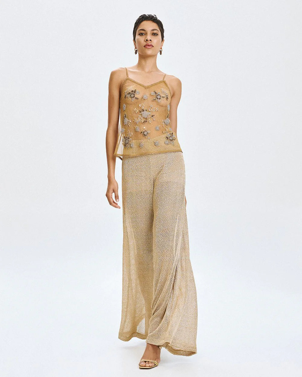 Top de alças com decote em V semitransparente com acabamento metálico e flores bordadas com miçangas. Perfeito para ocasiões especiais, oferece um toque de glamour e feminilidade com acabamento refinado.