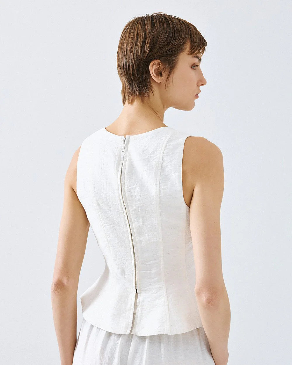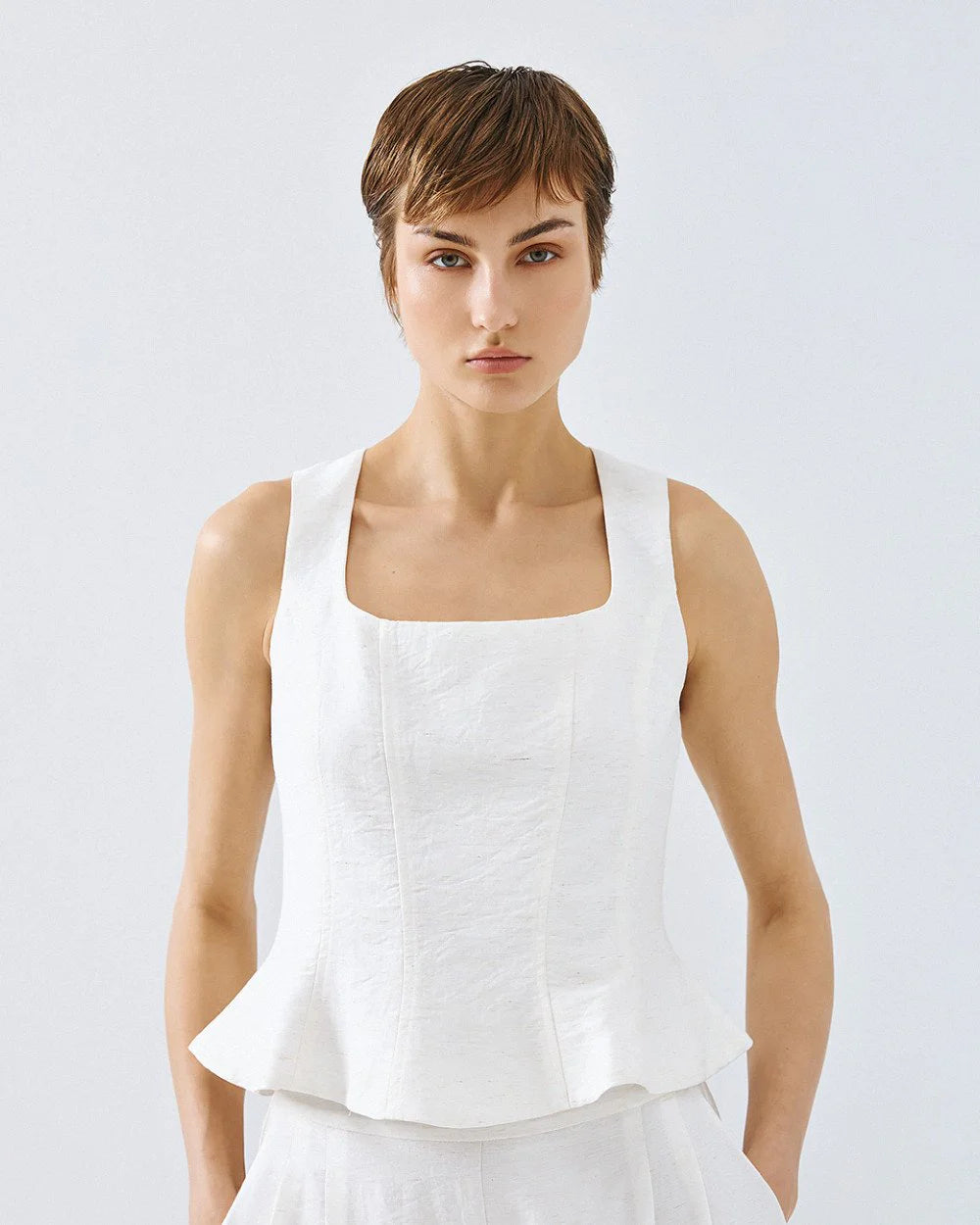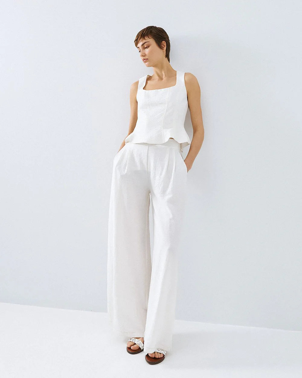 Top crop com decote reto elegante e alças. Cintura marcada com folho evasê na base que define a silhueta e adiciona movimento fluido à peça. Detalhe geométrico moderno no colo e ombros que valoriza e realça a zona superior do corpo. Corte ajustado que combina estilo contemporâneo.