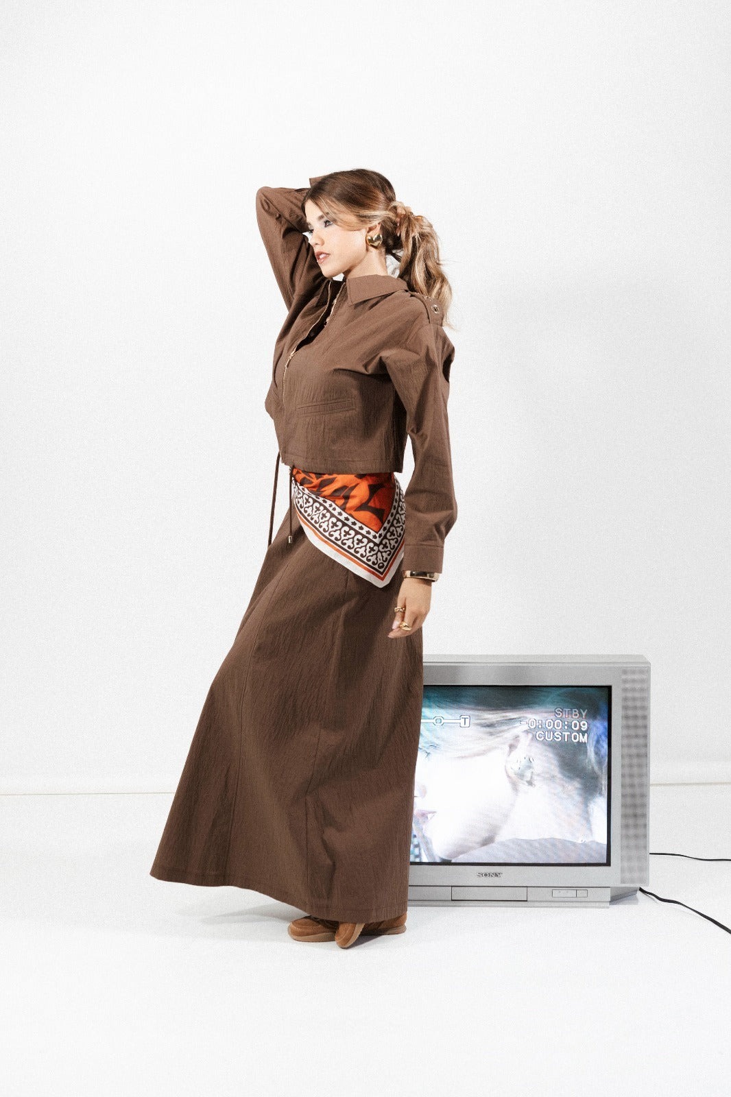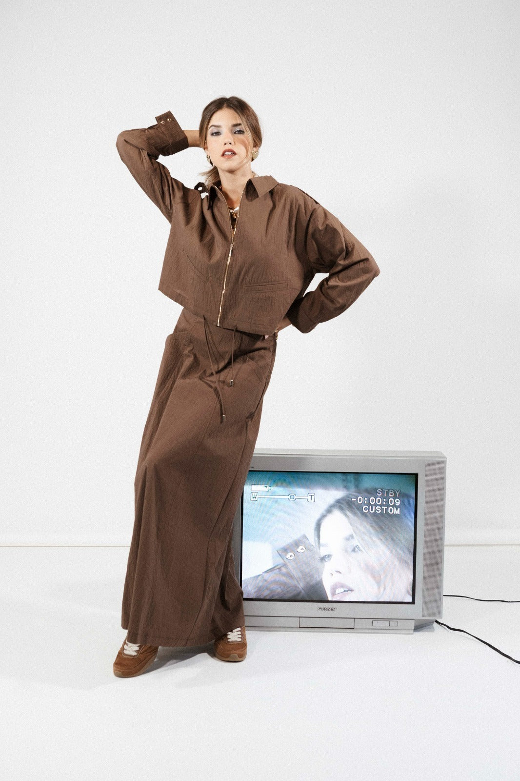 Blusão bomber. Gola com lapela e manga comprida comprida. Detalhe de acabamentos abalonados e cordão ajustavel. Fecho frontal com fecho de correr.