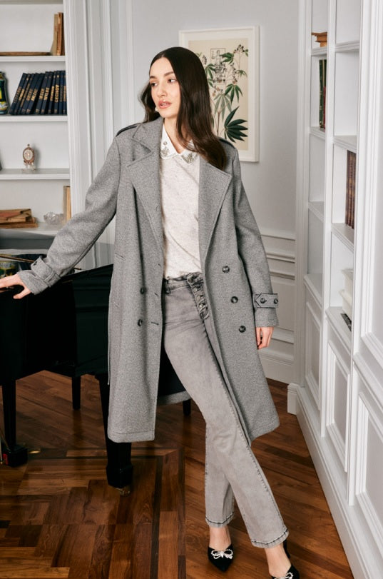 Calças de cintura subida com bolsos frontais brilhantes. Fecho frontal com botões.