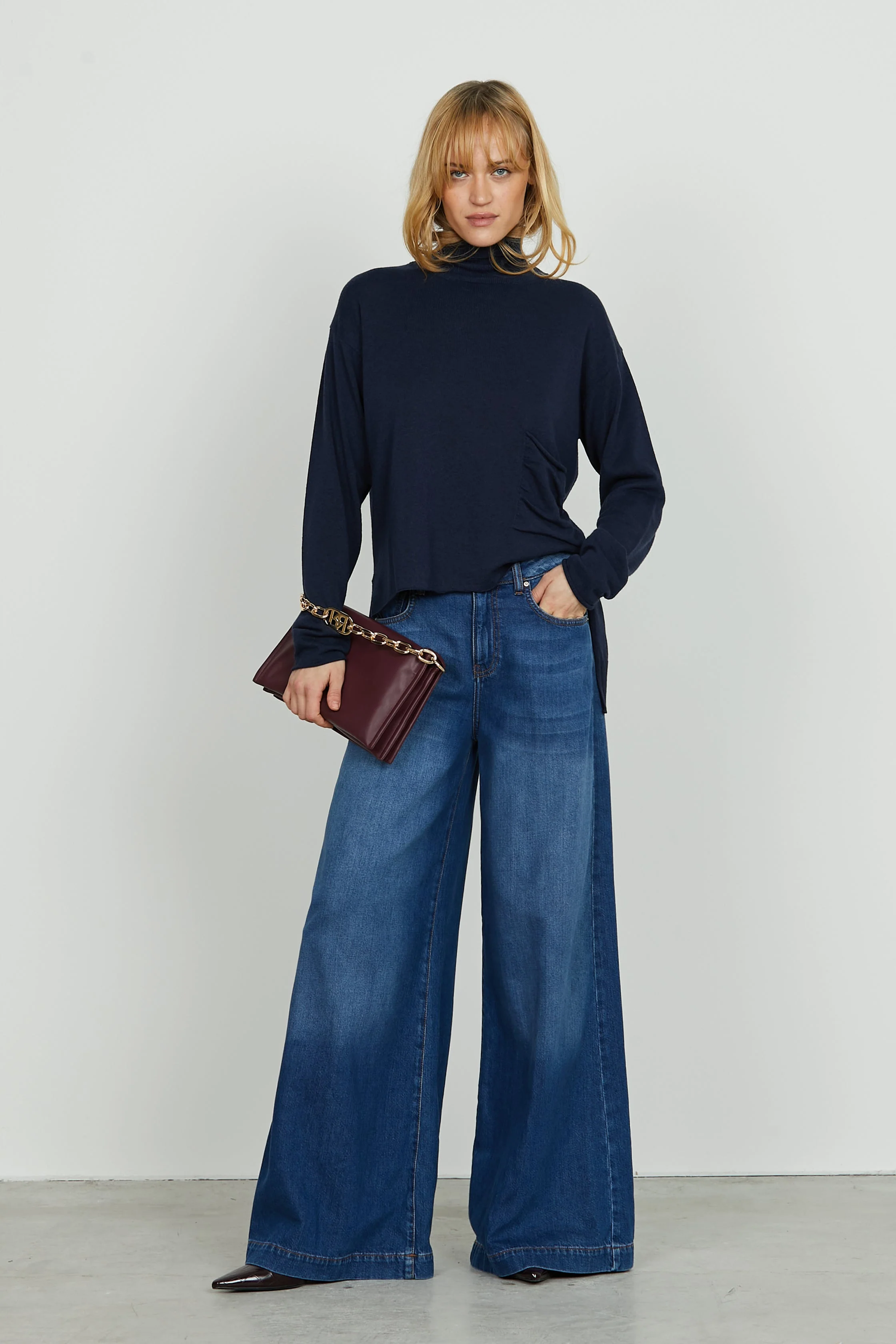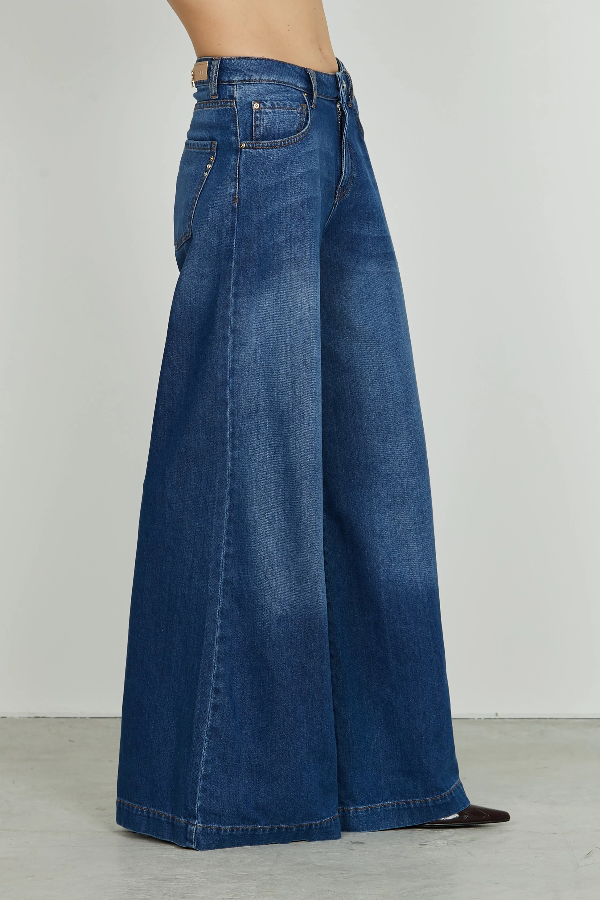 Jeans de cintura subida com cinco bolsos. Perna larga extra comprida. Fecho frontal com fecho de correr e botão metálico.