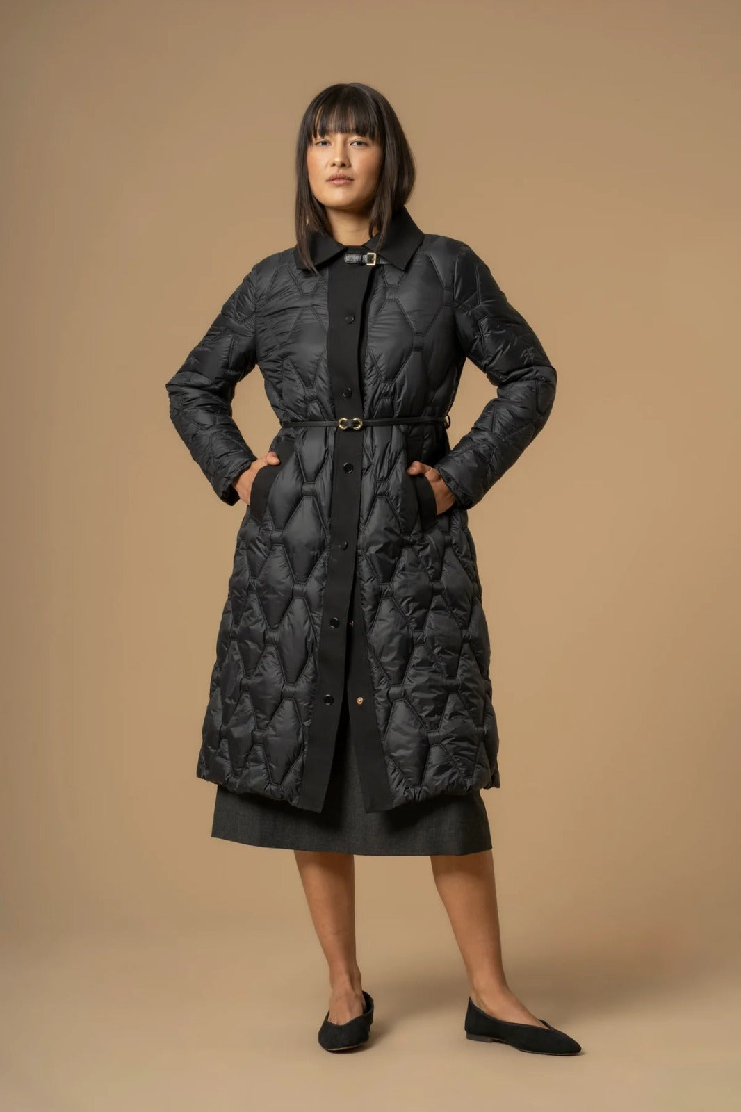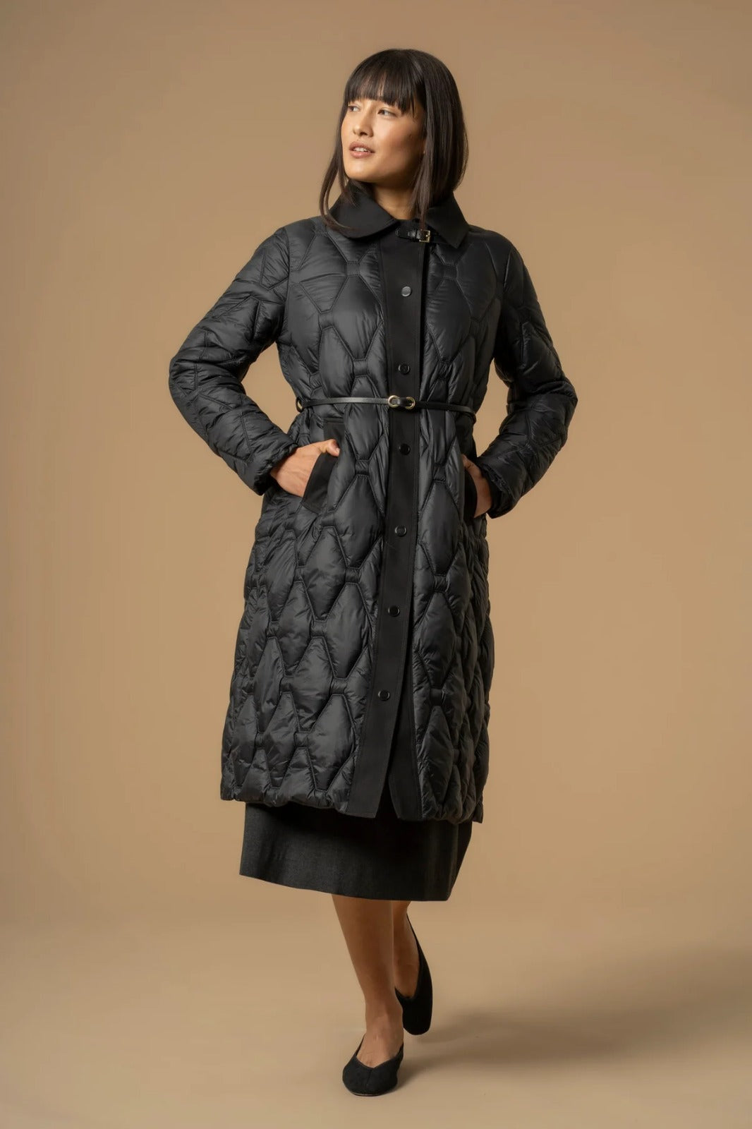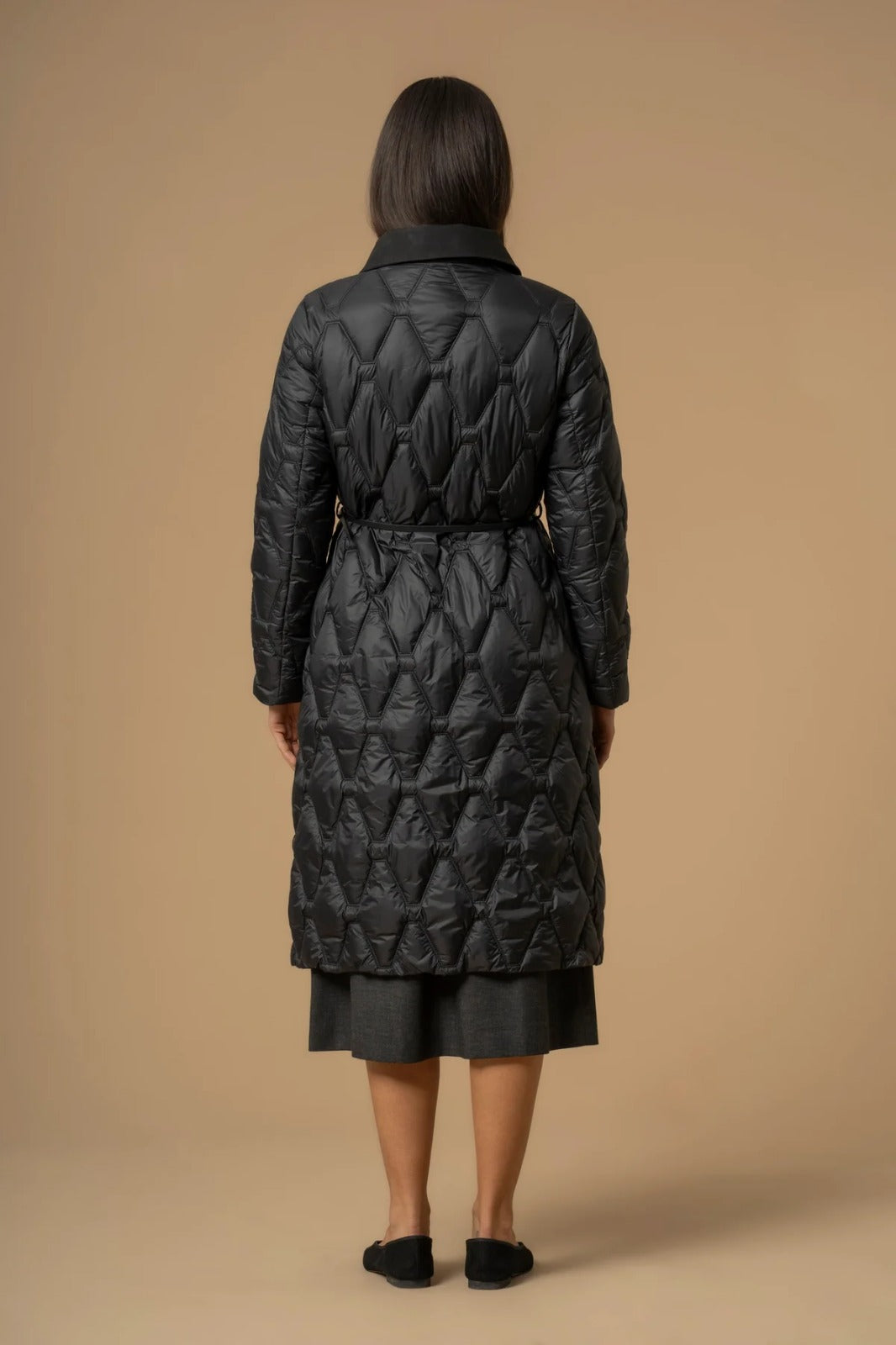 Casaco com comprimento três quartos. Bolsos laterais. Detalhe de fivela. Cinto incluído.