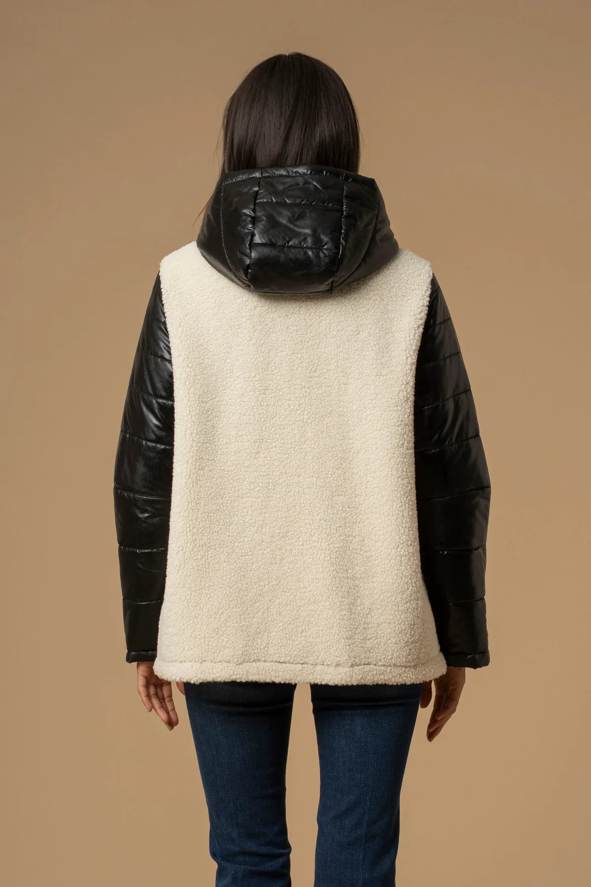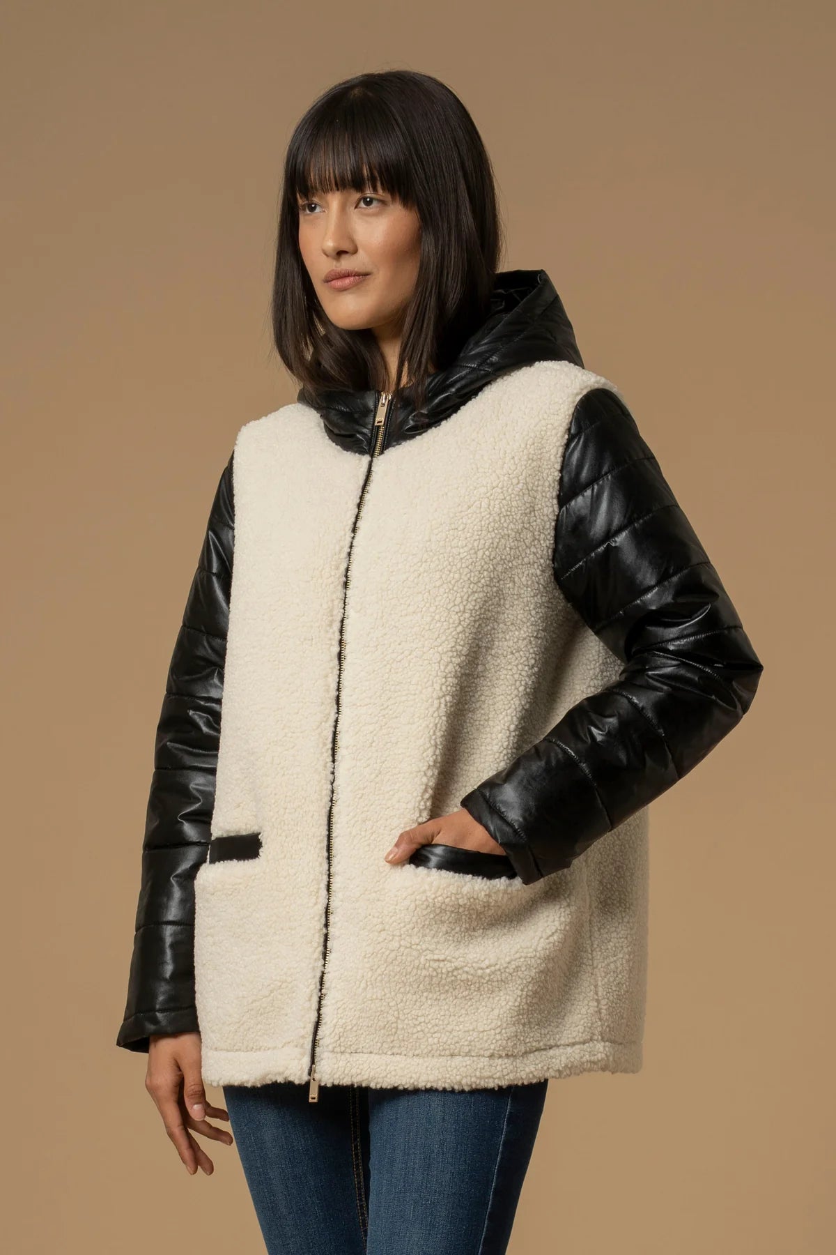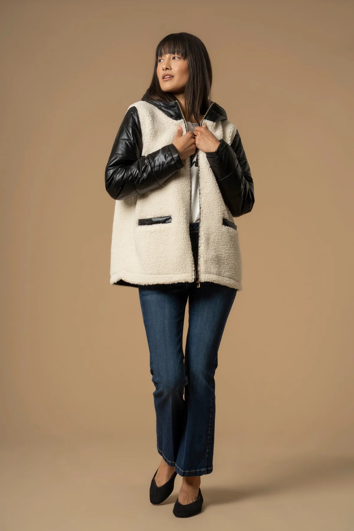 Casaco com efeito de pelinho com fecho. Detalhe de tecido em contraste. Possui gola com capuz e bolsos frontais embutidos.
