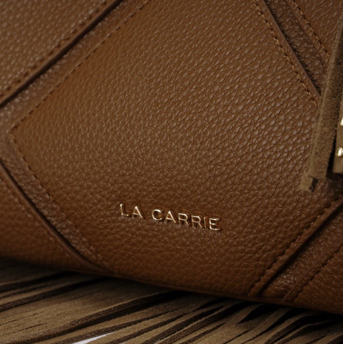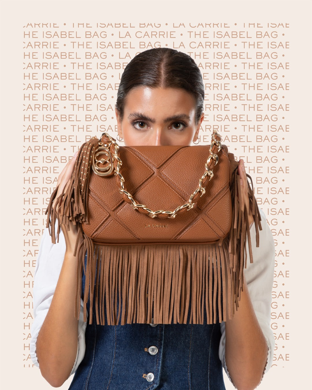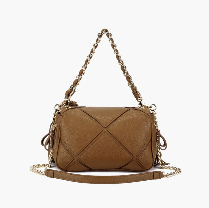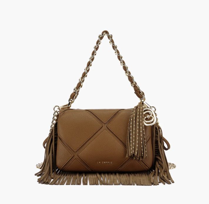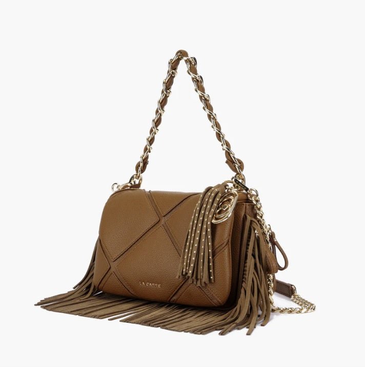 Mala de ombro em couro sintético com padrão de diamantes costurados e franjas, alça de corrente inserida no couro sintético e alça de ombro removível.