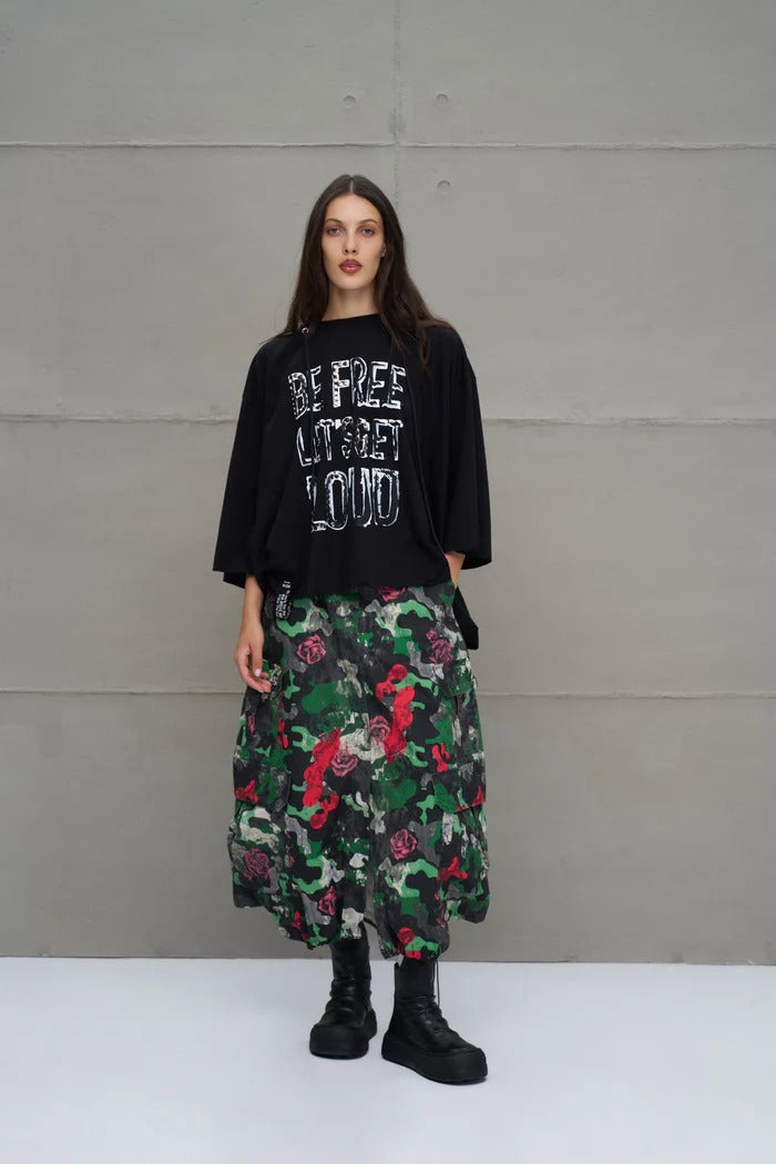 T-shirt assimétrica com lettring e detalhe de tachas.