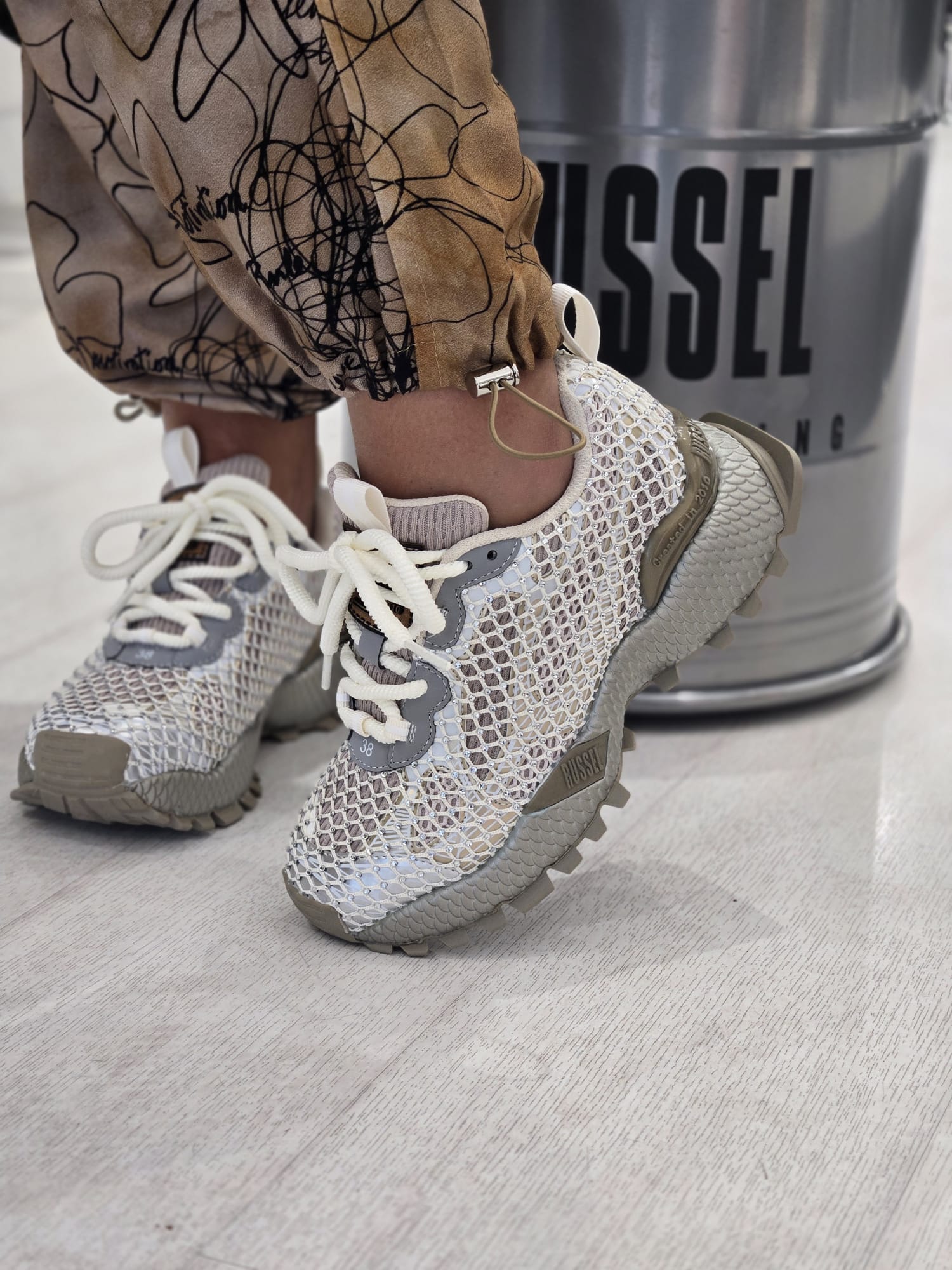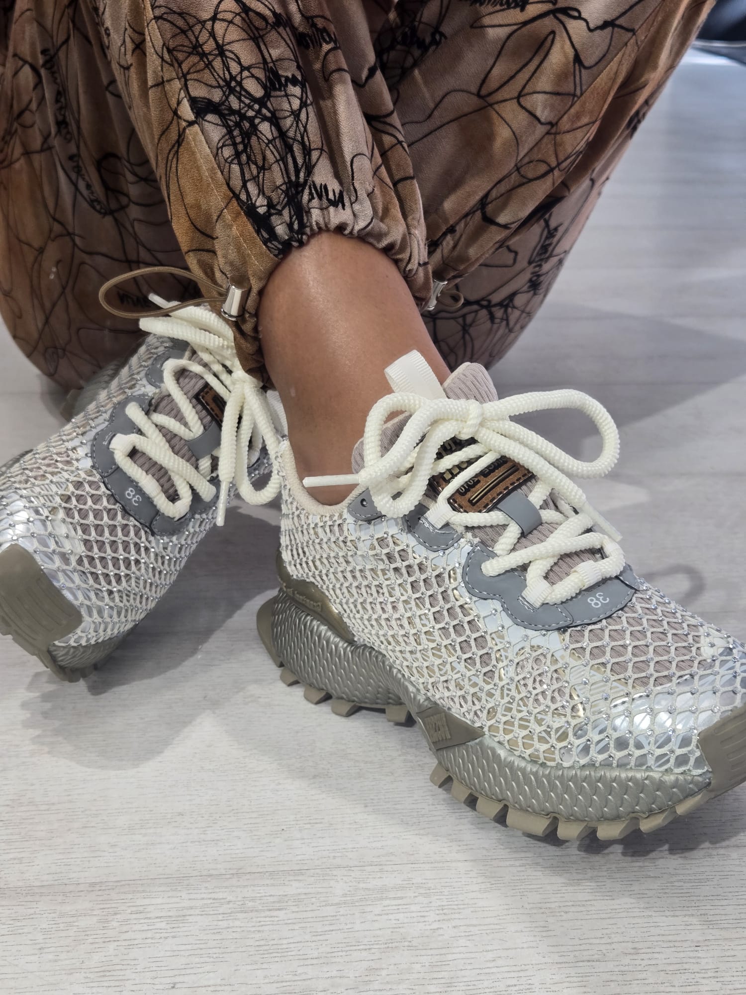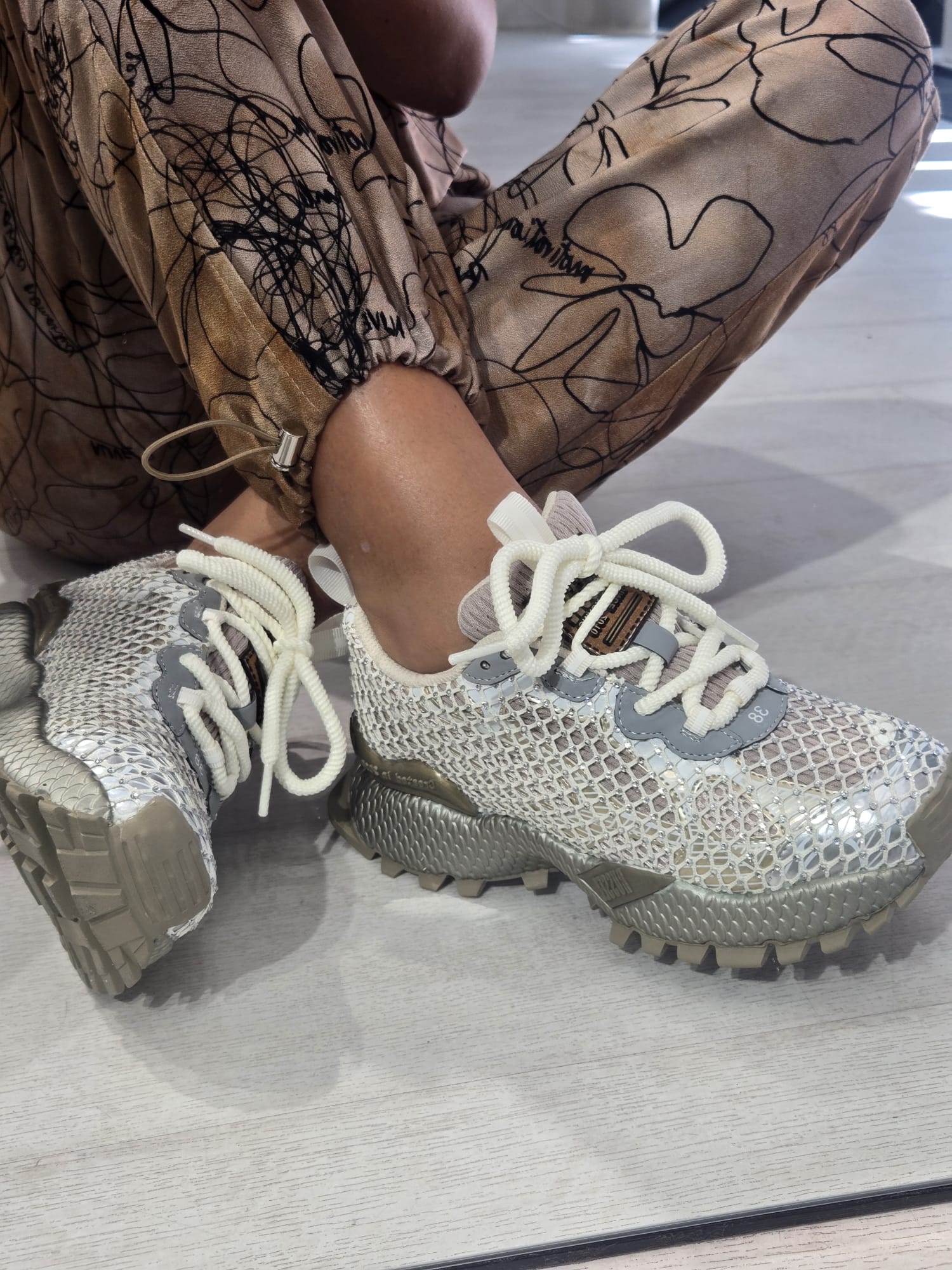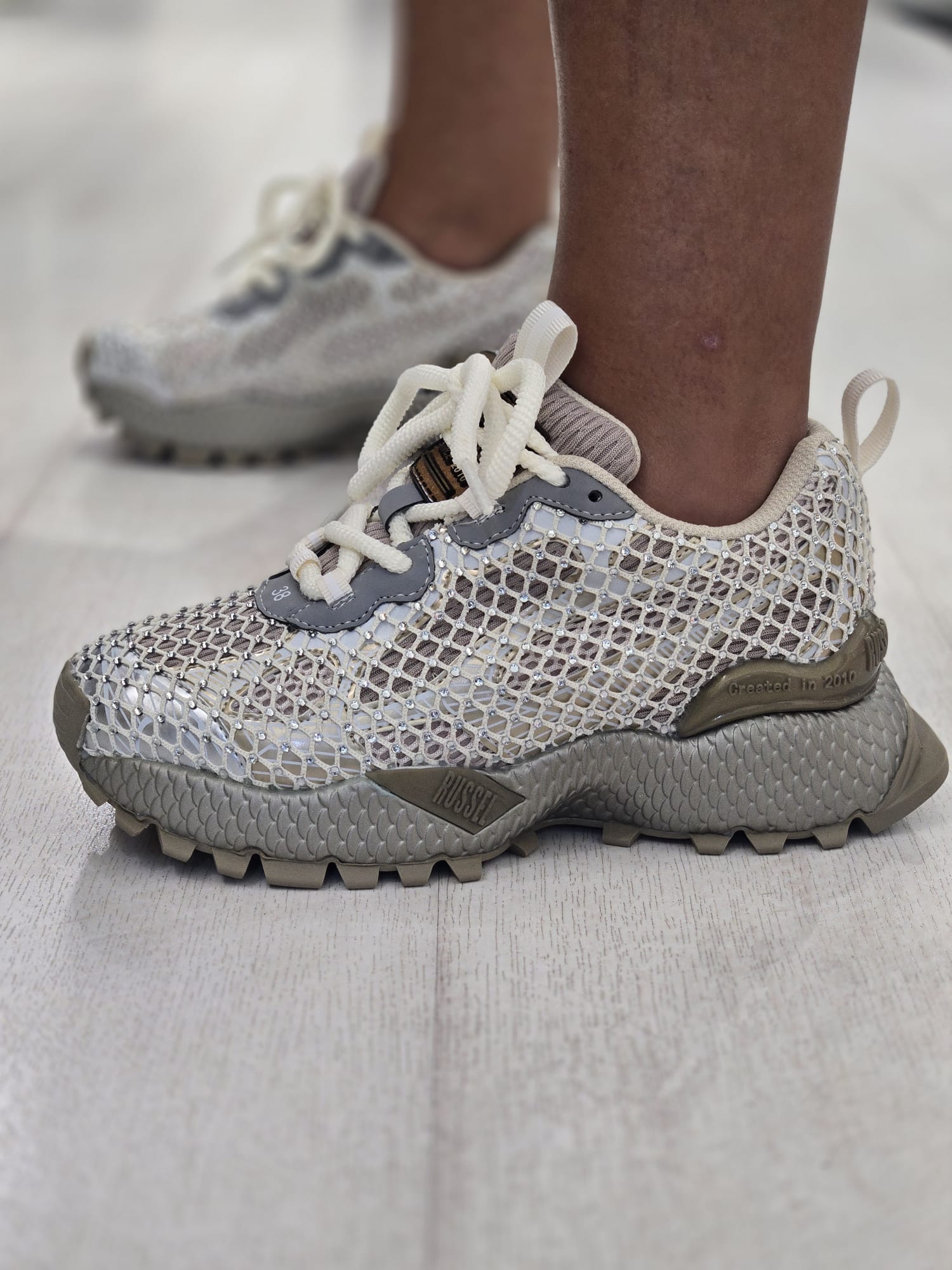 Ténis com detalhe em rede e brilhantes. Fecho com cordões. Altura da sola: 4 cm.