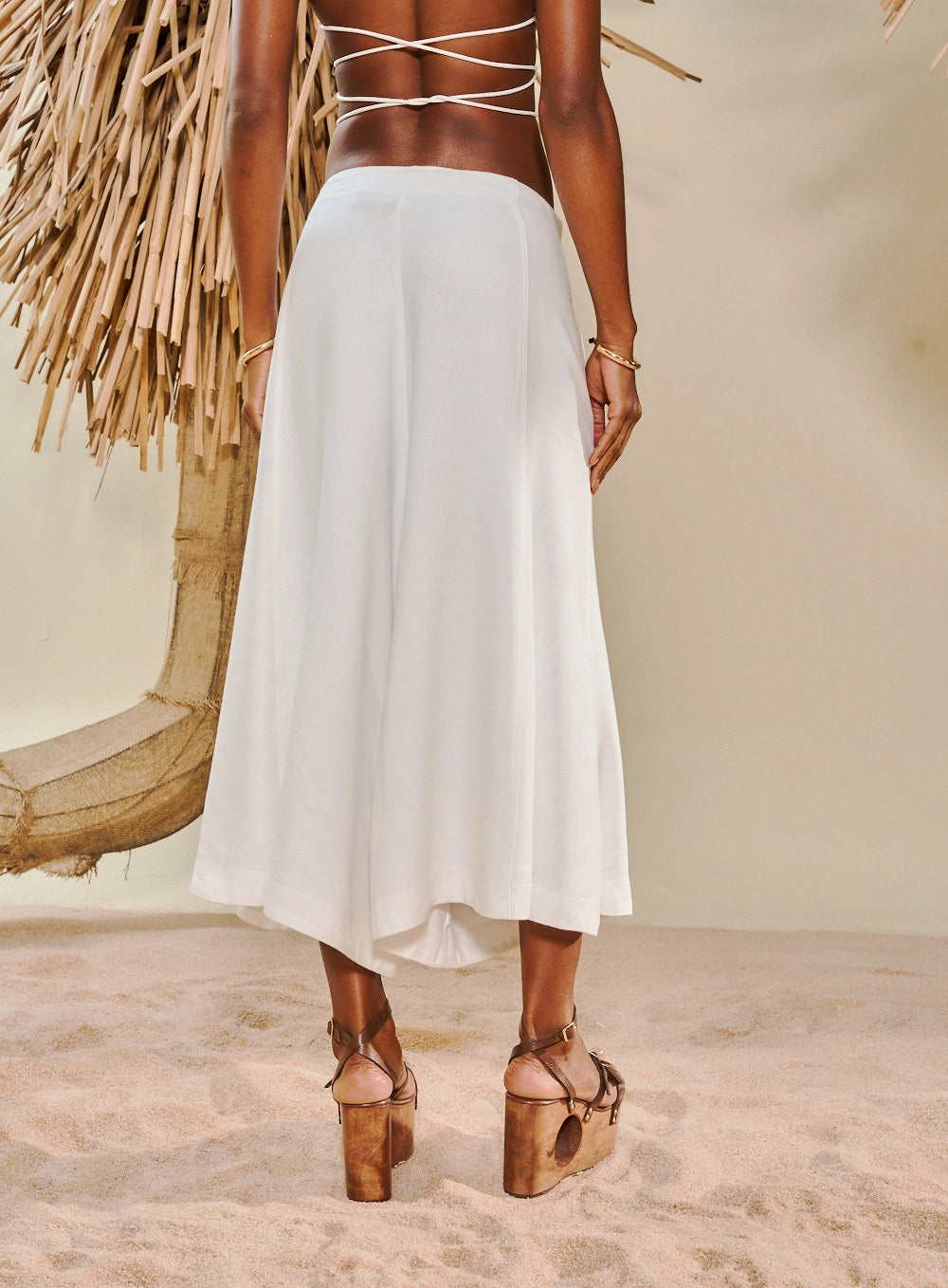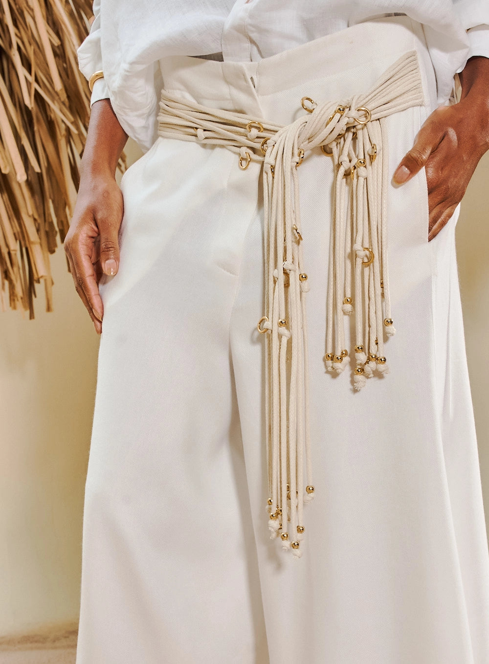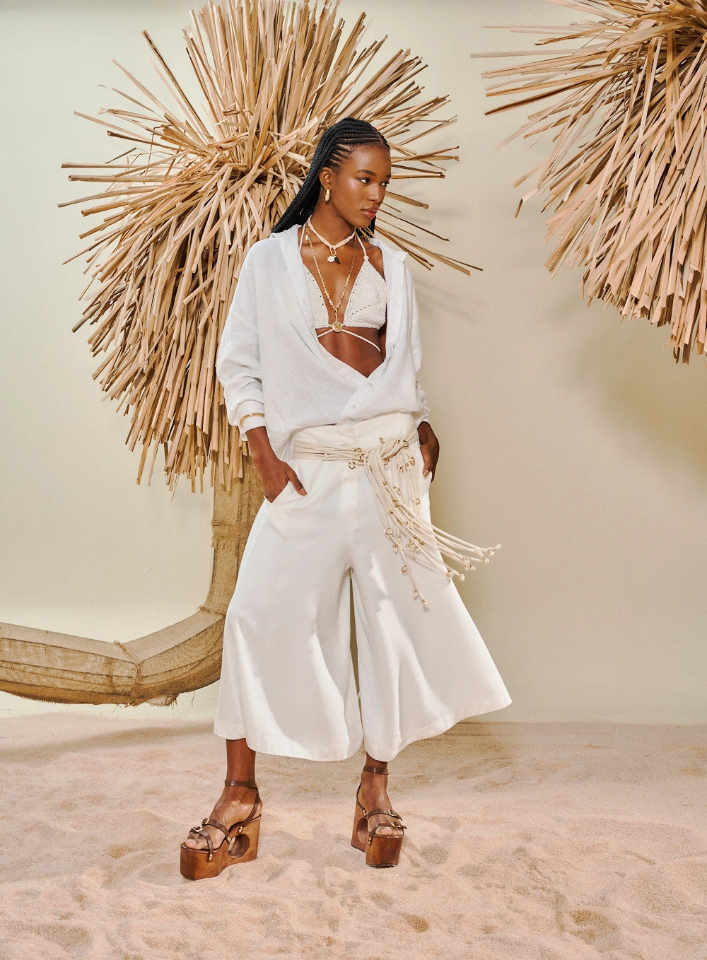 Calça feminina midi em linho com modelagem ampla e elegante. O design wide-leg remete a uma culotte sofisticada, com comprimento que termina abaixo do joelho mas acima do tornozelo. Destaque para a cintura alta com passadores e cinto de cordão ornamental artesanal, adornado com ponteiras, contas e barbicachos que reforçam a estética boho-chic.