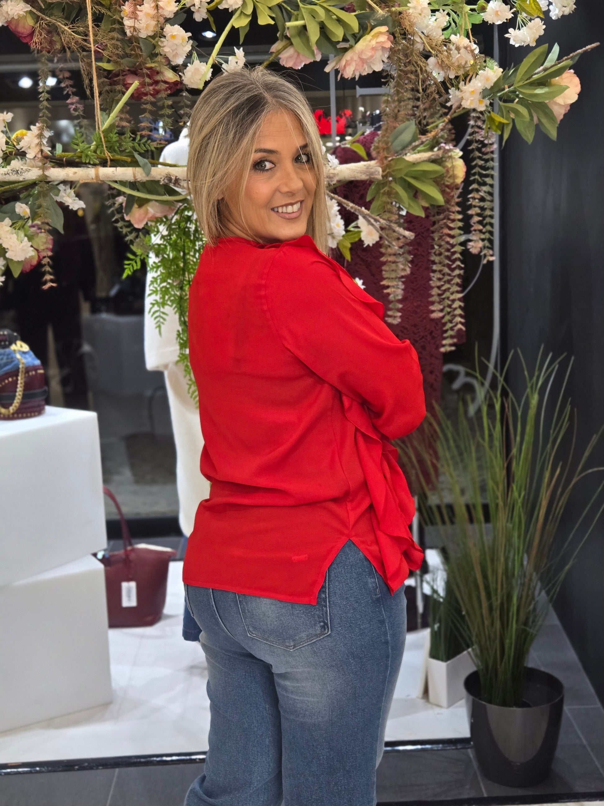 Blusa de decote em bico com folhos e manga comprida acabada em elástico.