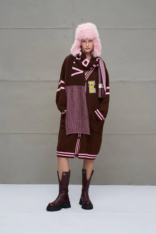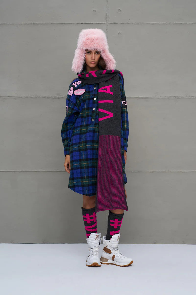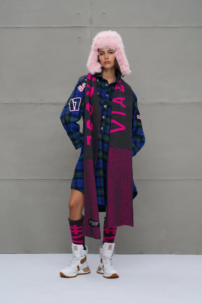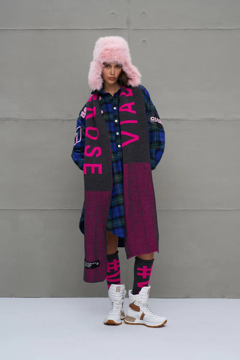 Cachecol longo de tricô com listas multicoloridas. Logo e patch tricotados.