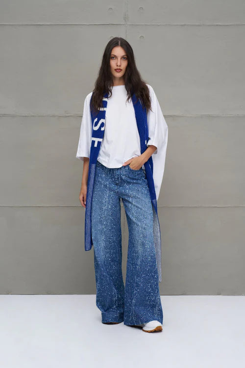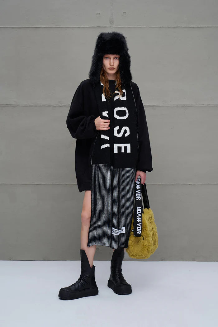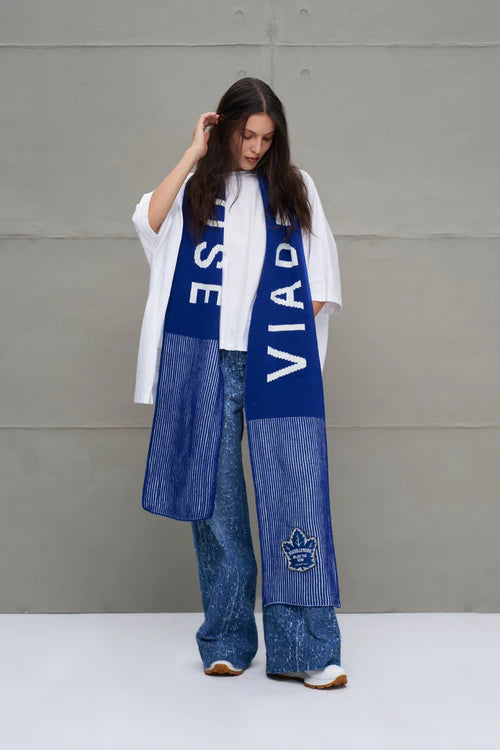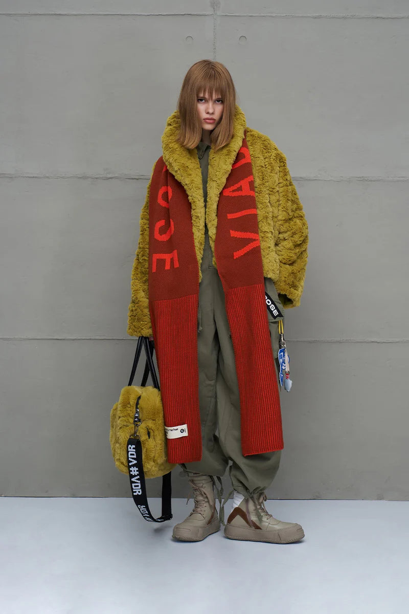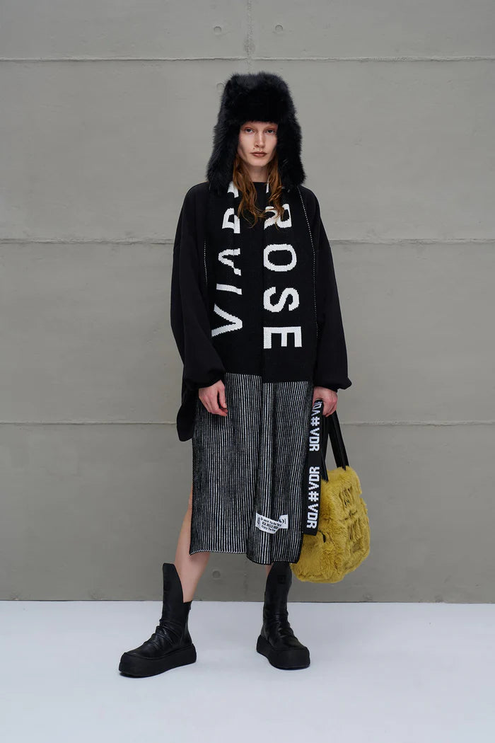 Cachecol longo de tricô com listas multicoloridas. Logo e patch tricotados.