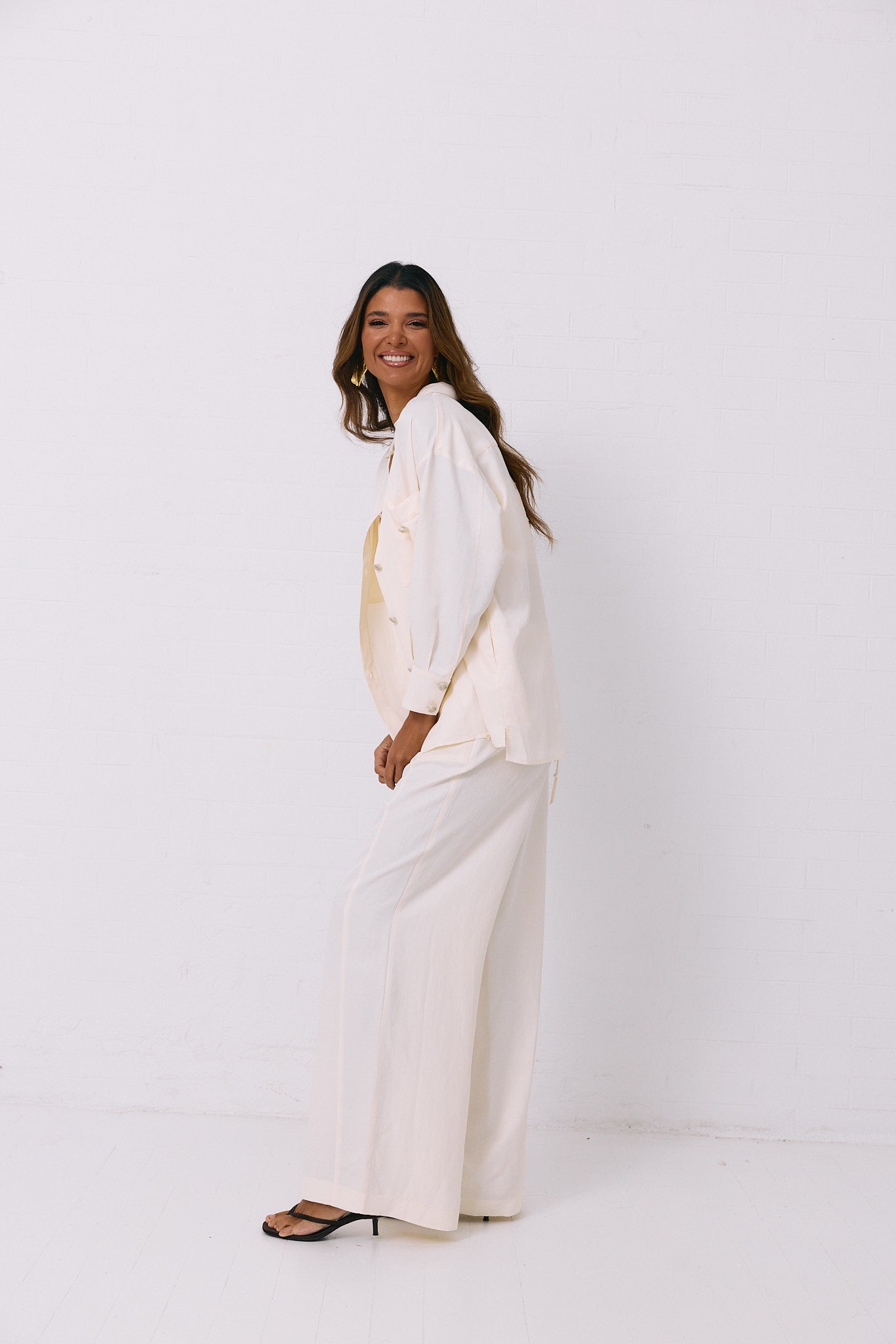 Calças fluídas com cintura subida que combina conforto e elegância. Apresenta fecho lateral oculto na costura para um acabamento limpo e discreto, além de bolsos laterais funcionais. O detalhe de atilhos frontais adiciona movimento e sofisticação ao design, enquanto a silhueta fluida oferece liberdade de movimento. Perfeitas para um look casual refinado ou ocasiões mais formais.