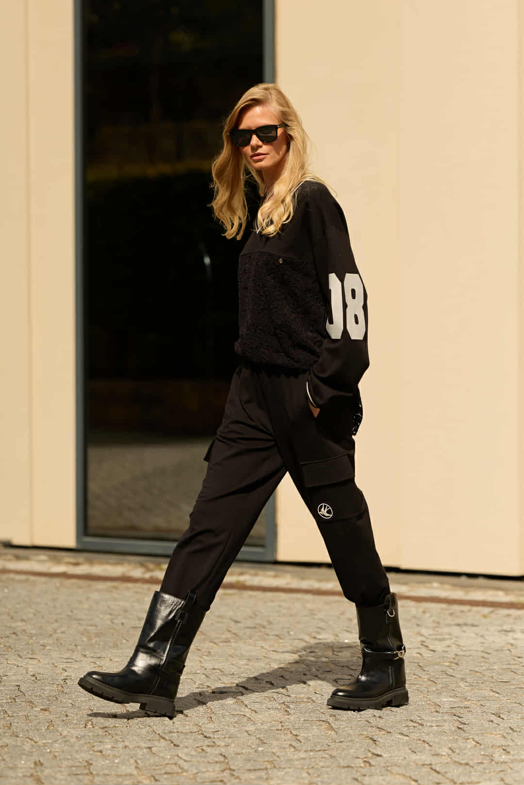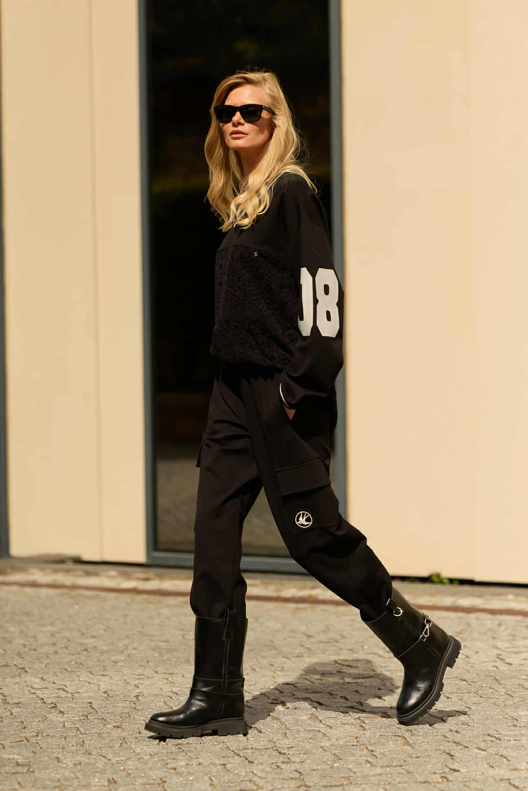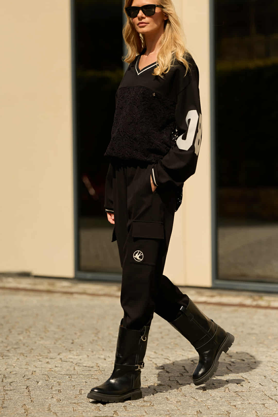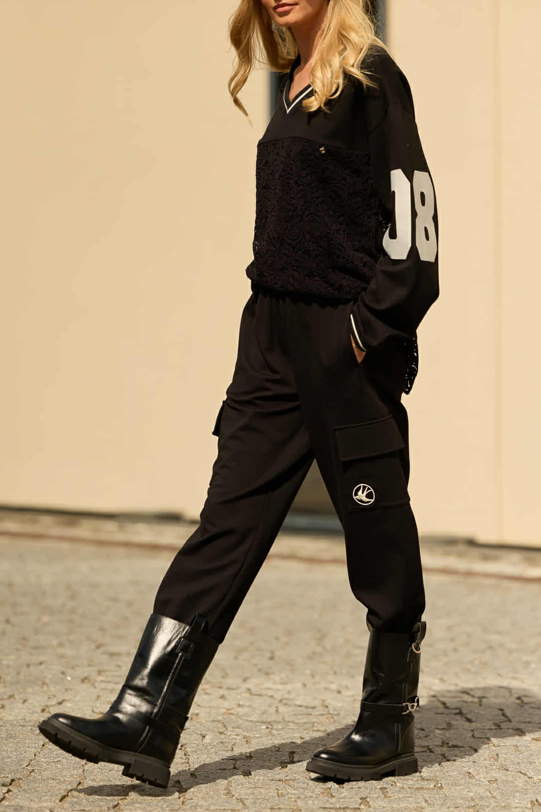 Calças de cintura média e cós elástico ccom puxadores. Bolsos dianteiros e bolso de chapa com aba na lateral. Perna reta. Bainha abalonada no punho.