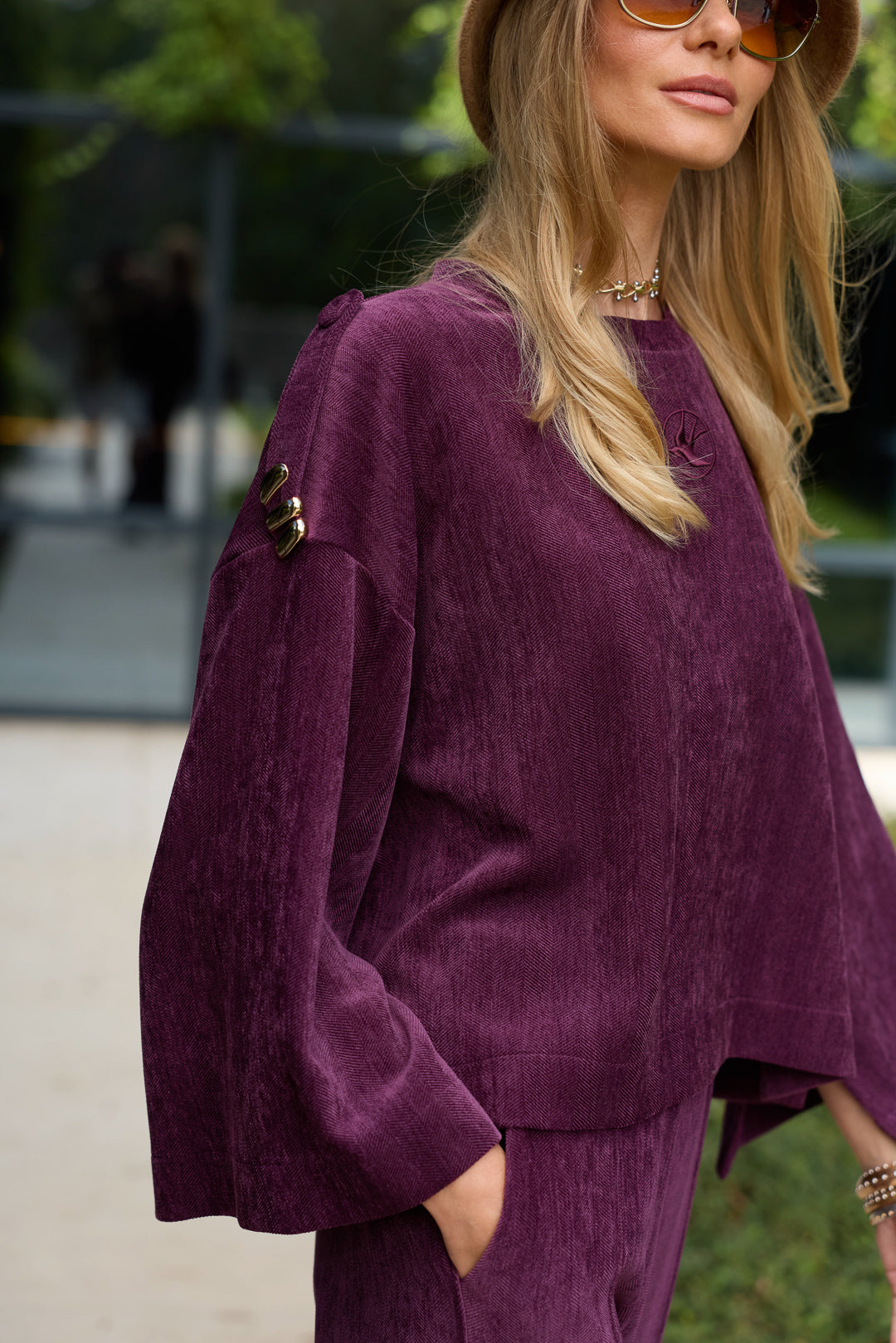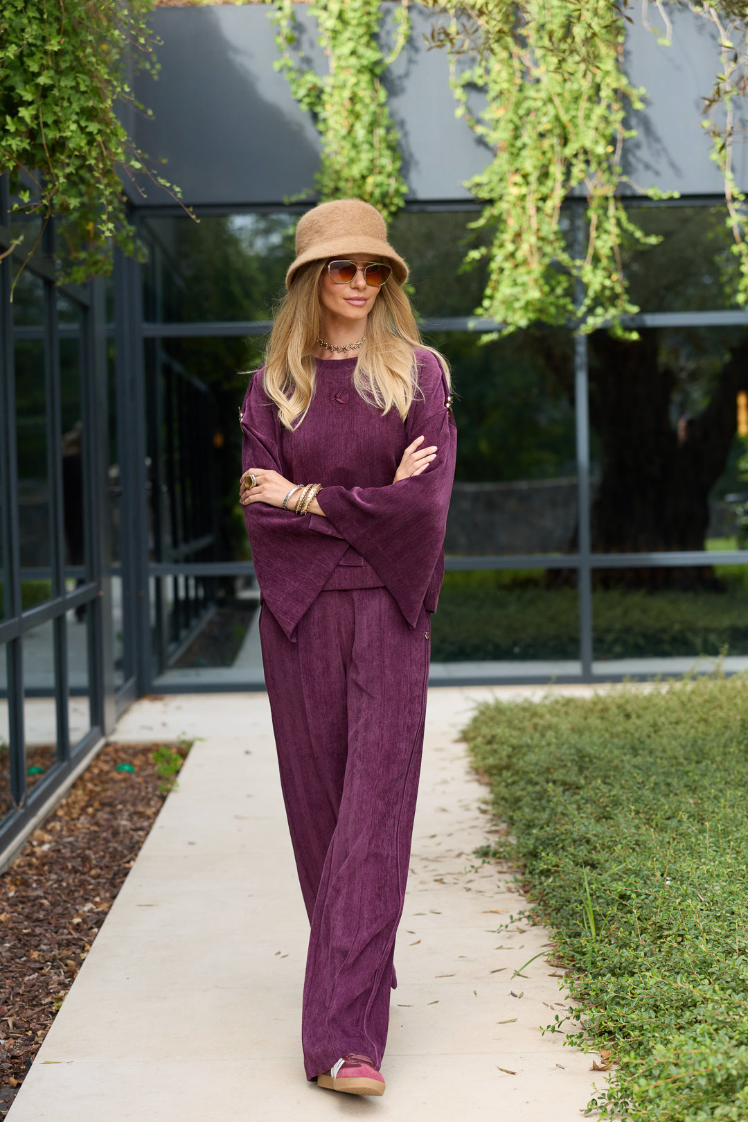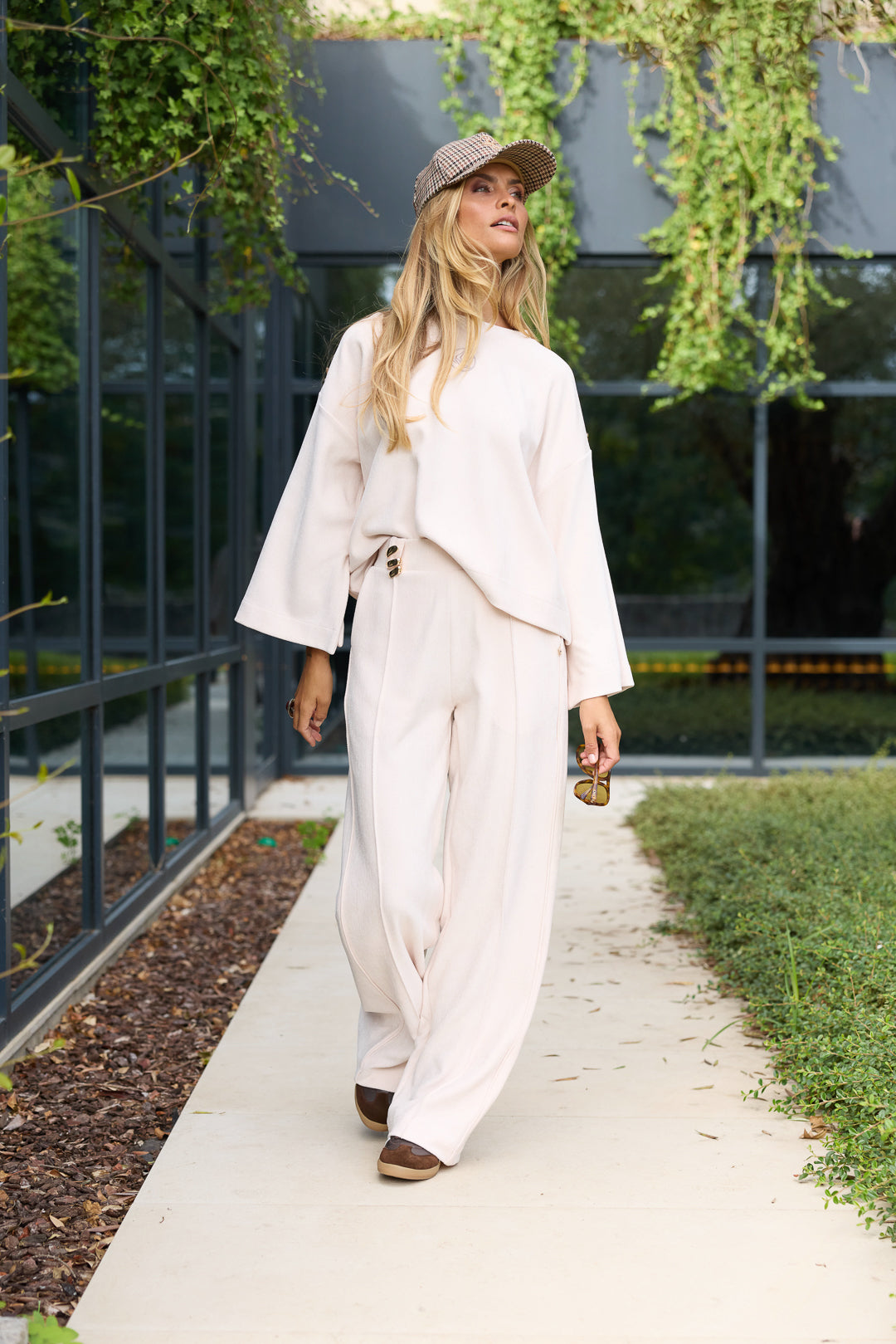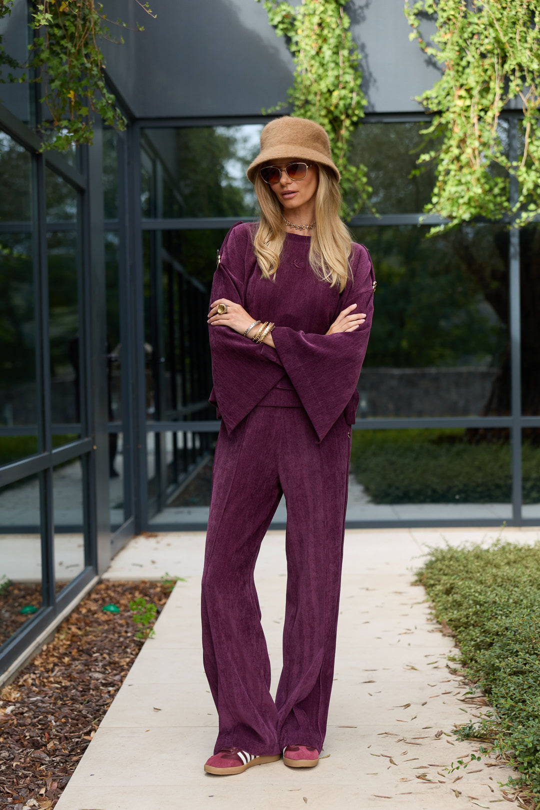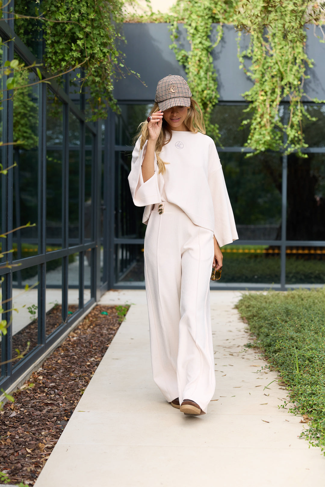 Calças cintura subida com cós elástico. Detalhe de costura marcada na frente. Pormenor de aplicação no cós em metal.