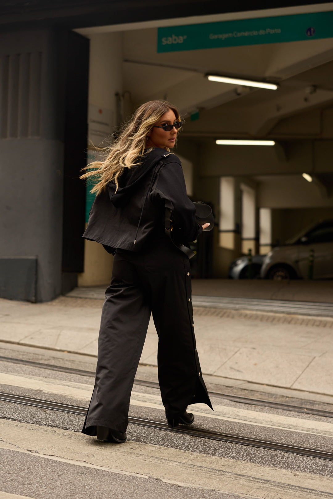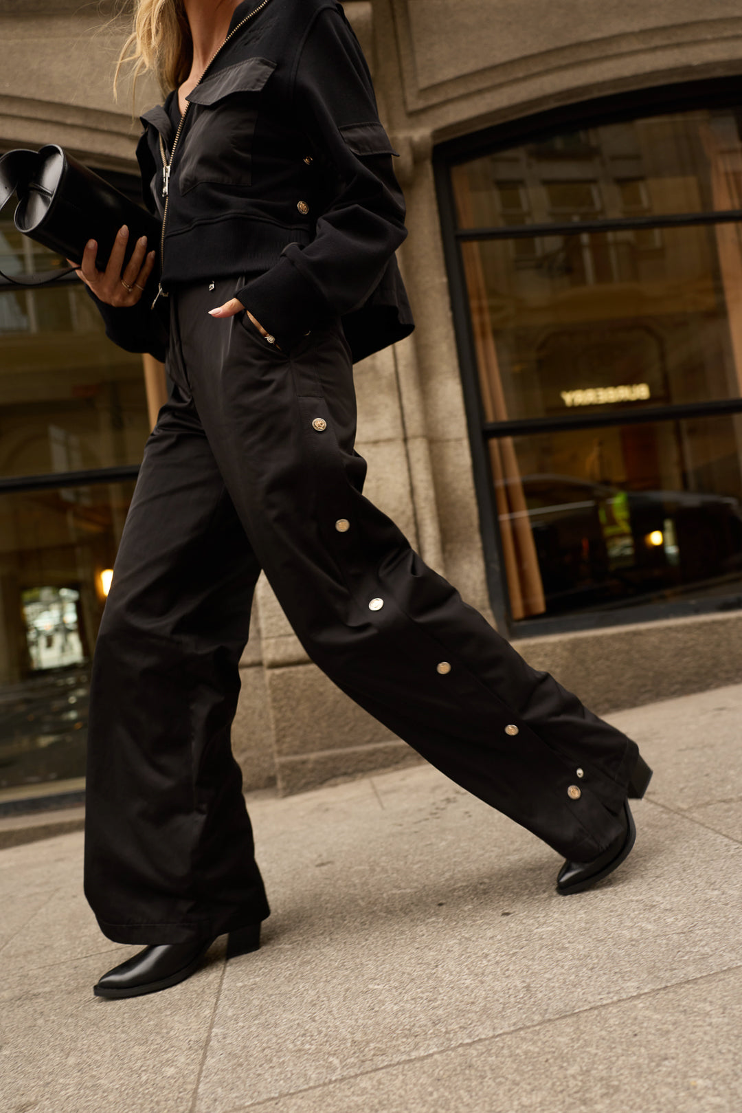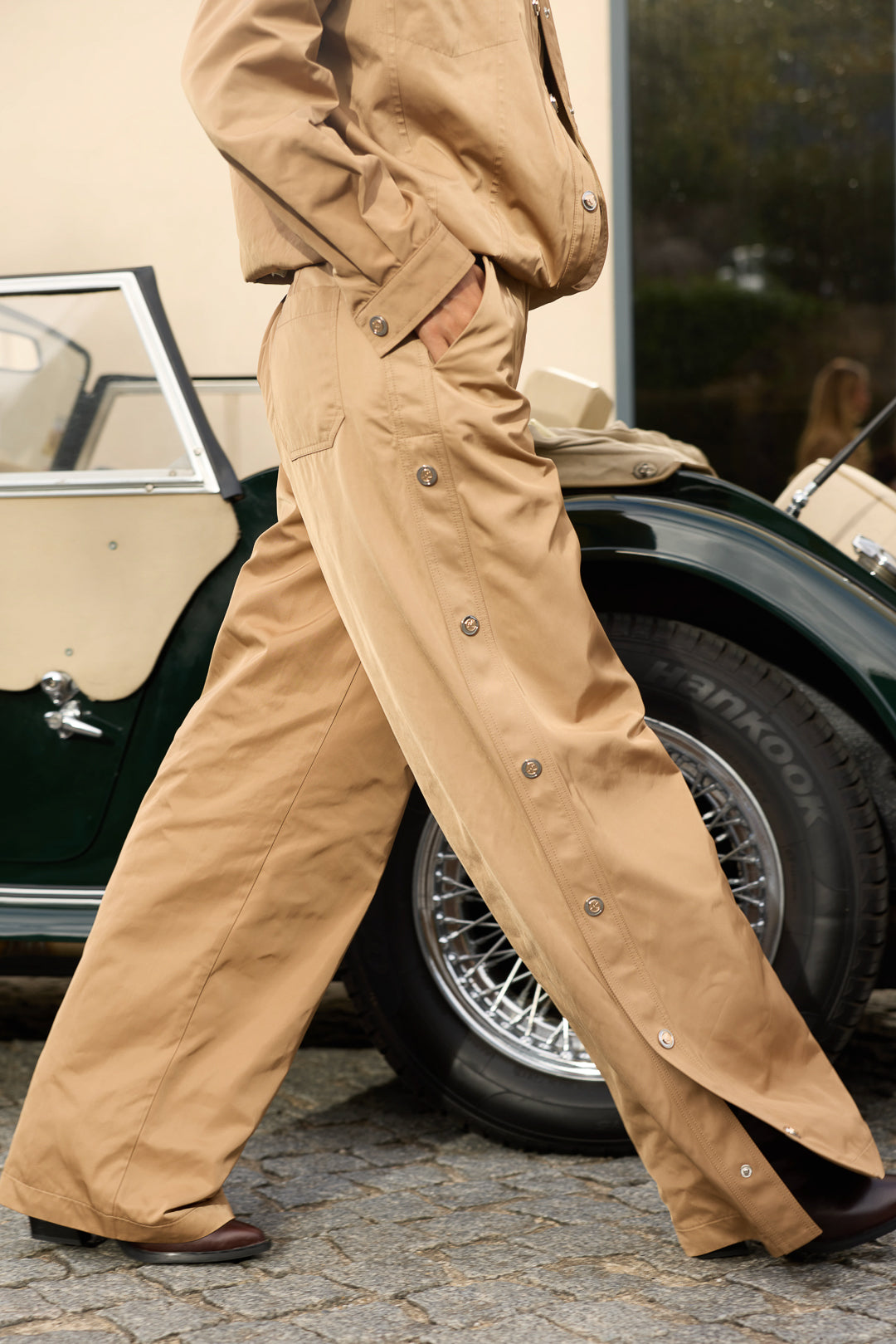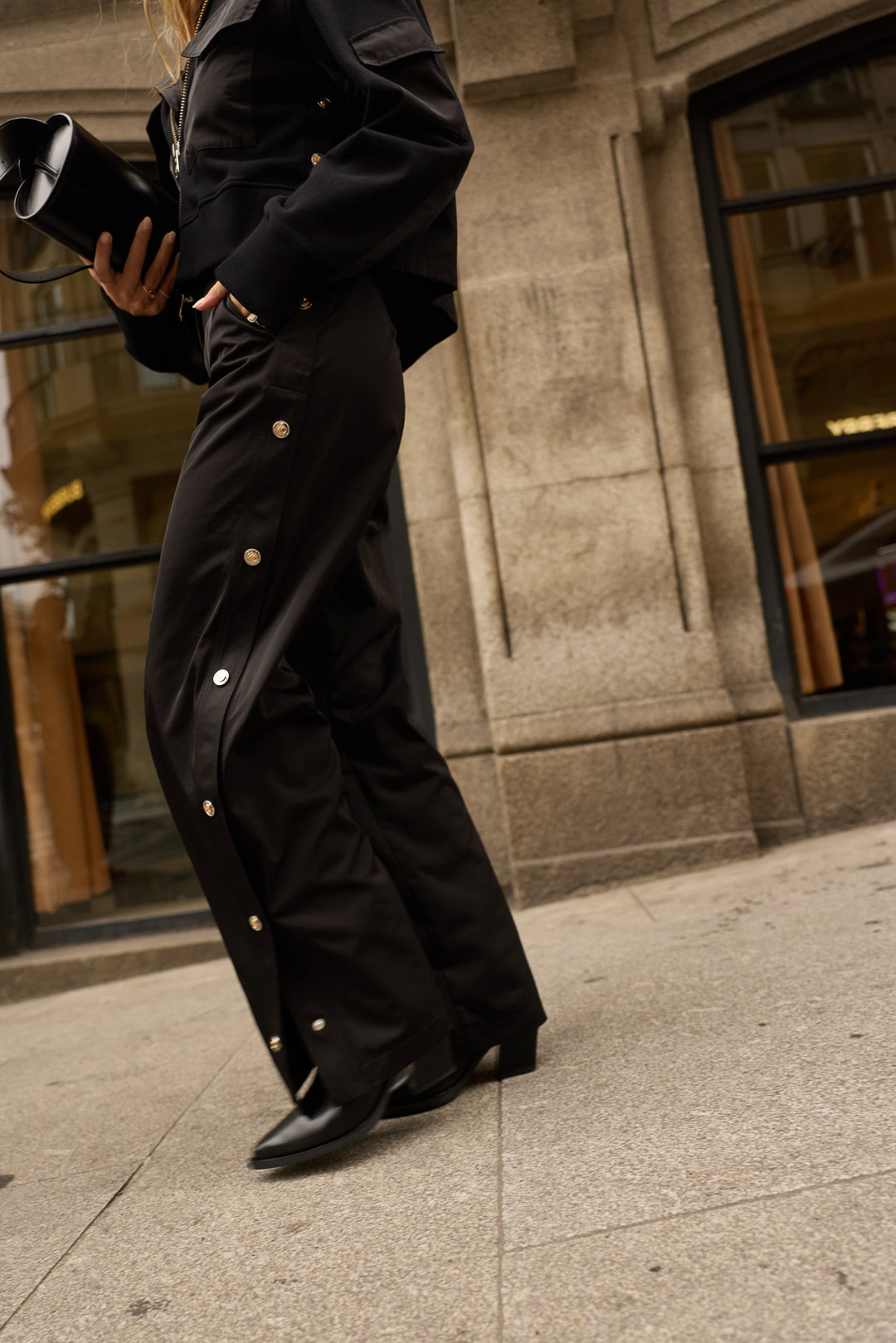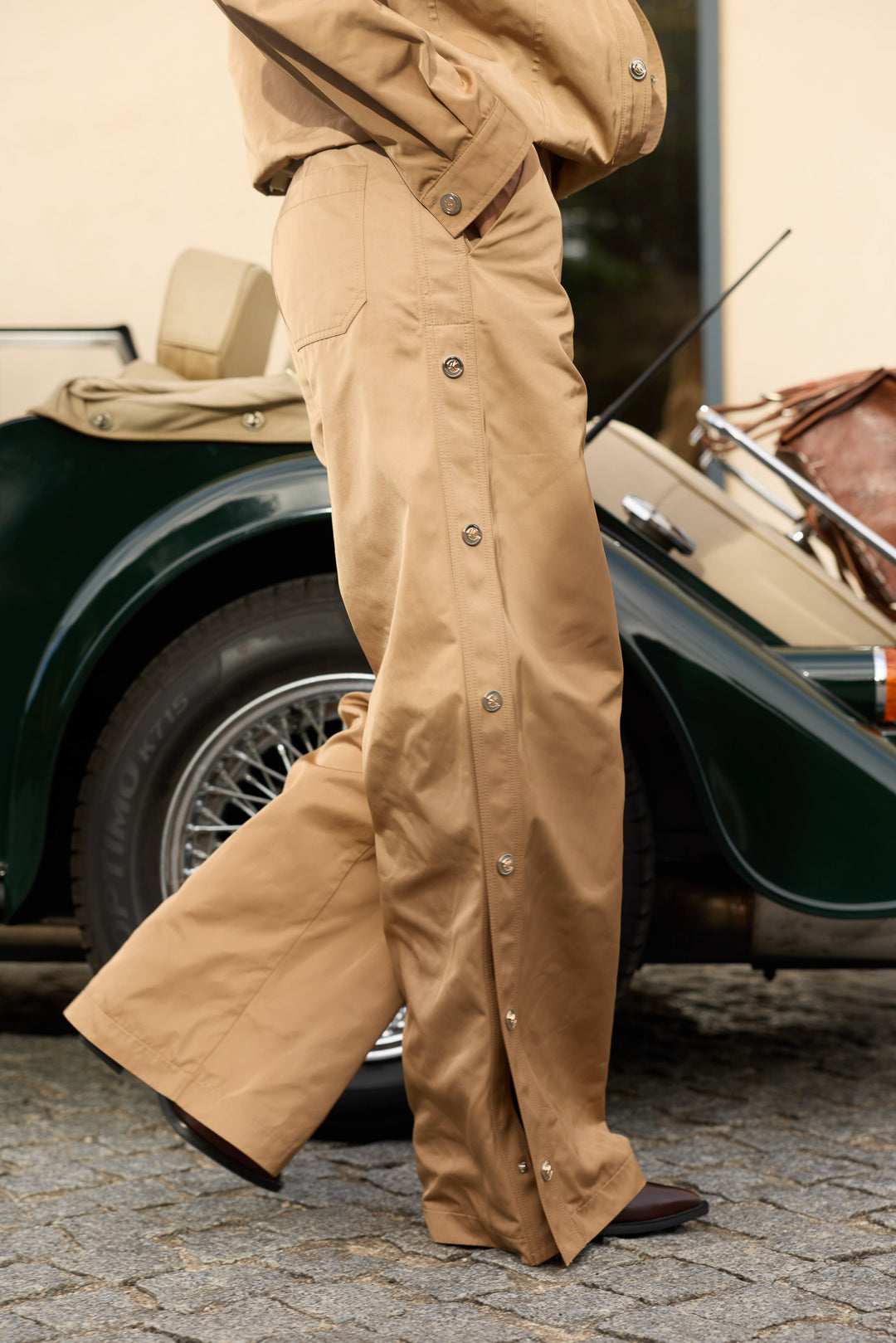 Calças de cintura subida. Perna larga com detalhe de fecho com molas de pressão. Tecido impermeável.