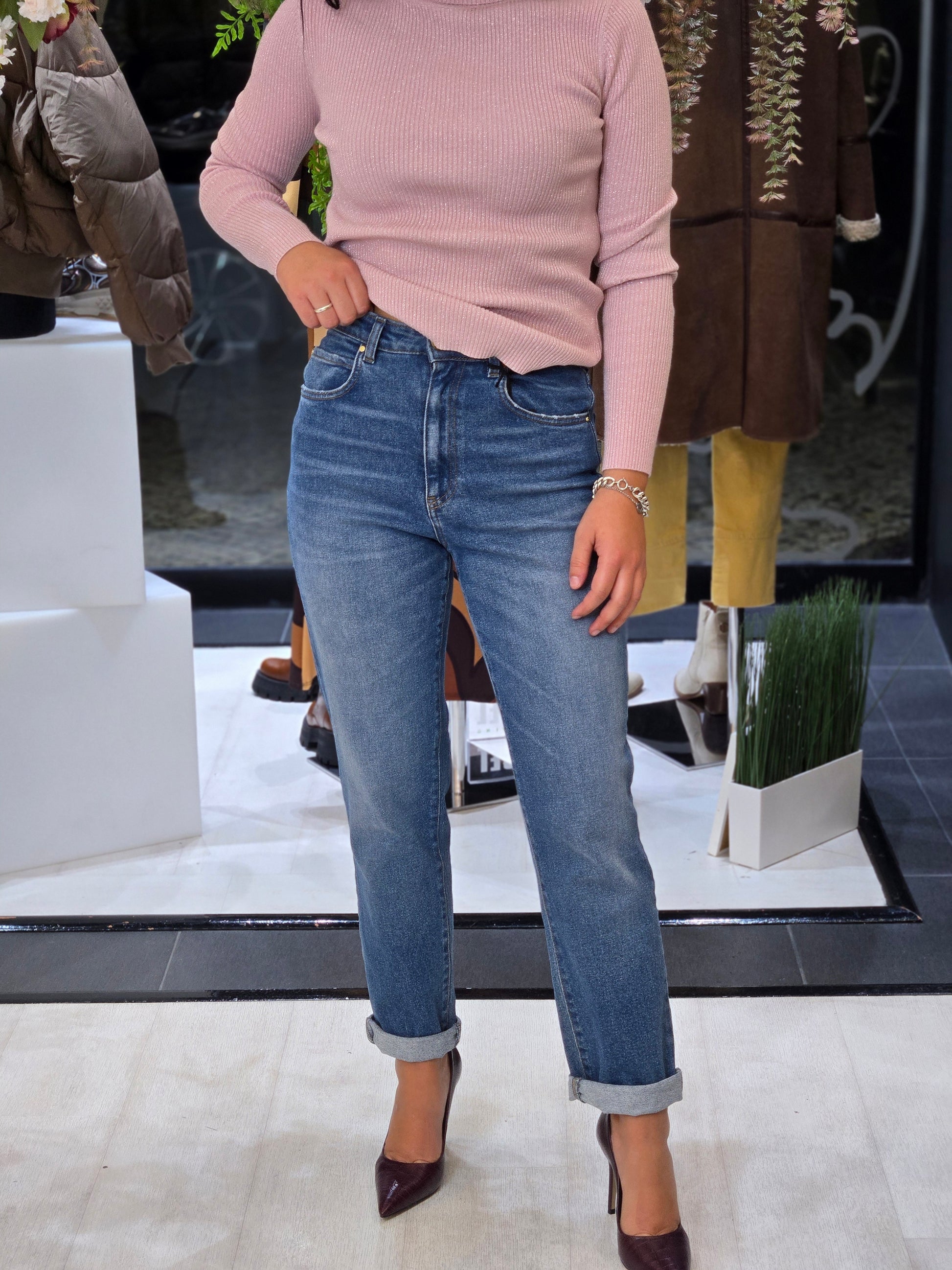 Calças de cintura subida com bolsos laterais e traseiros. Fecho frontal com fecho de correr e botão metálico.