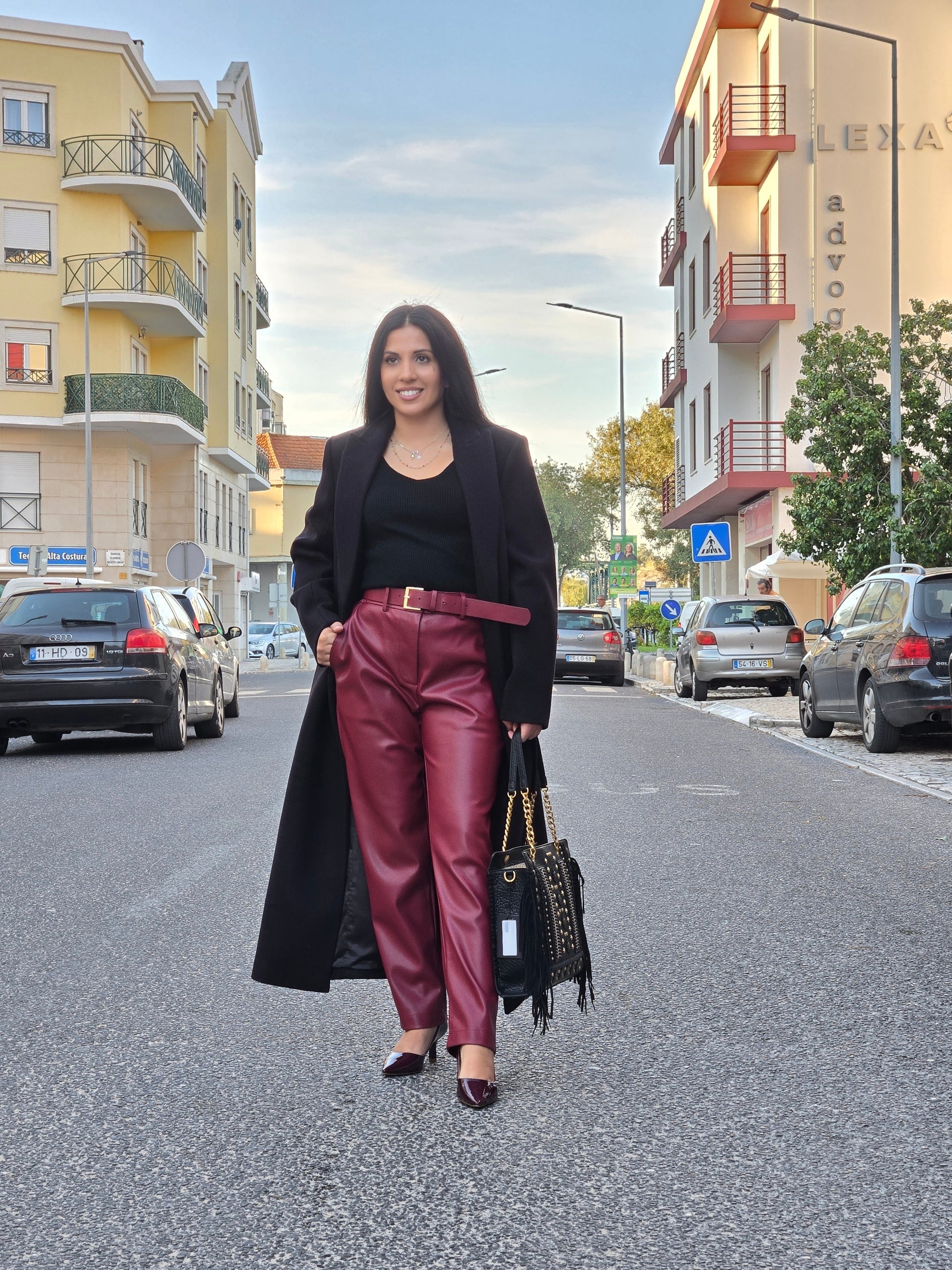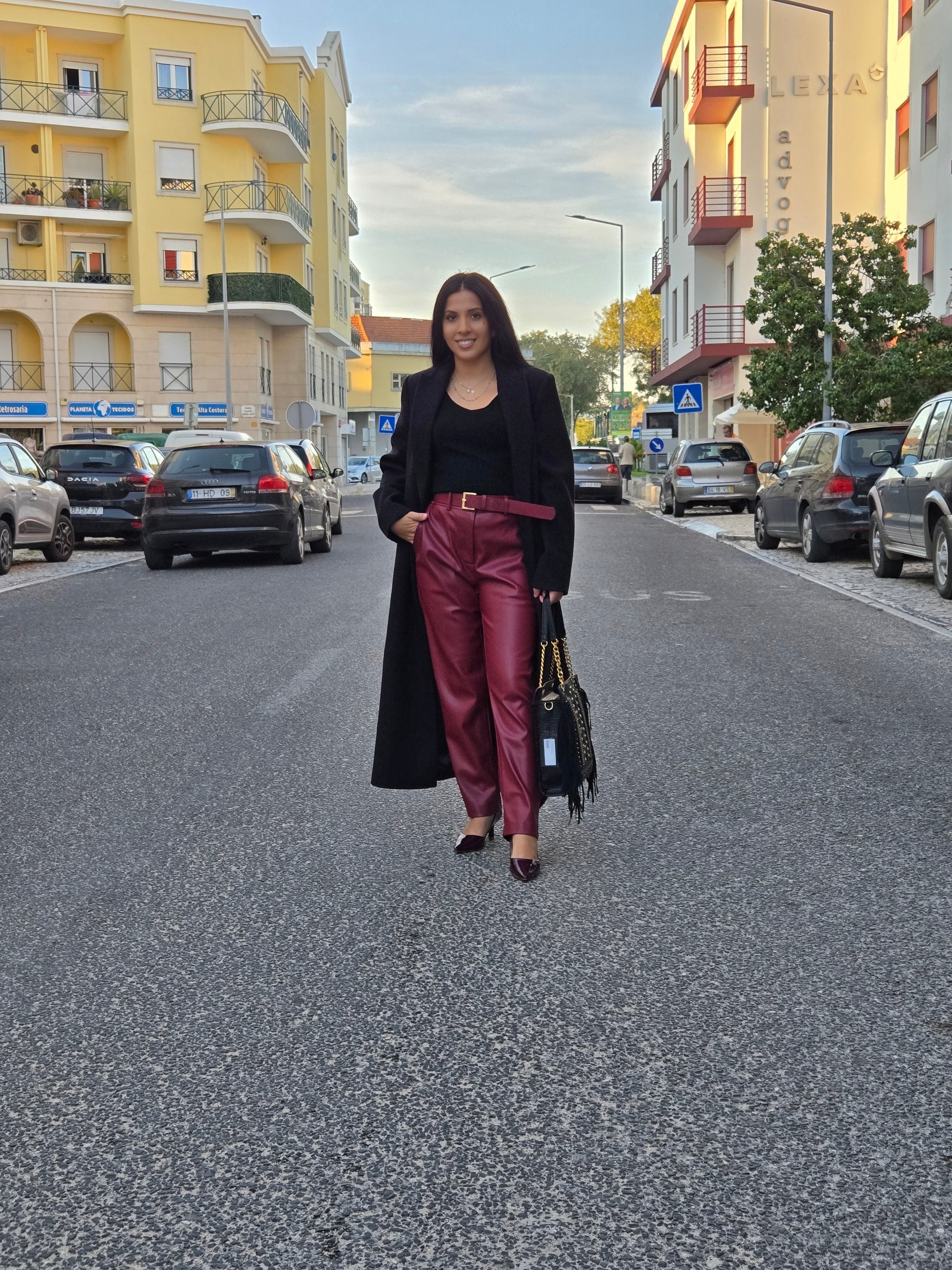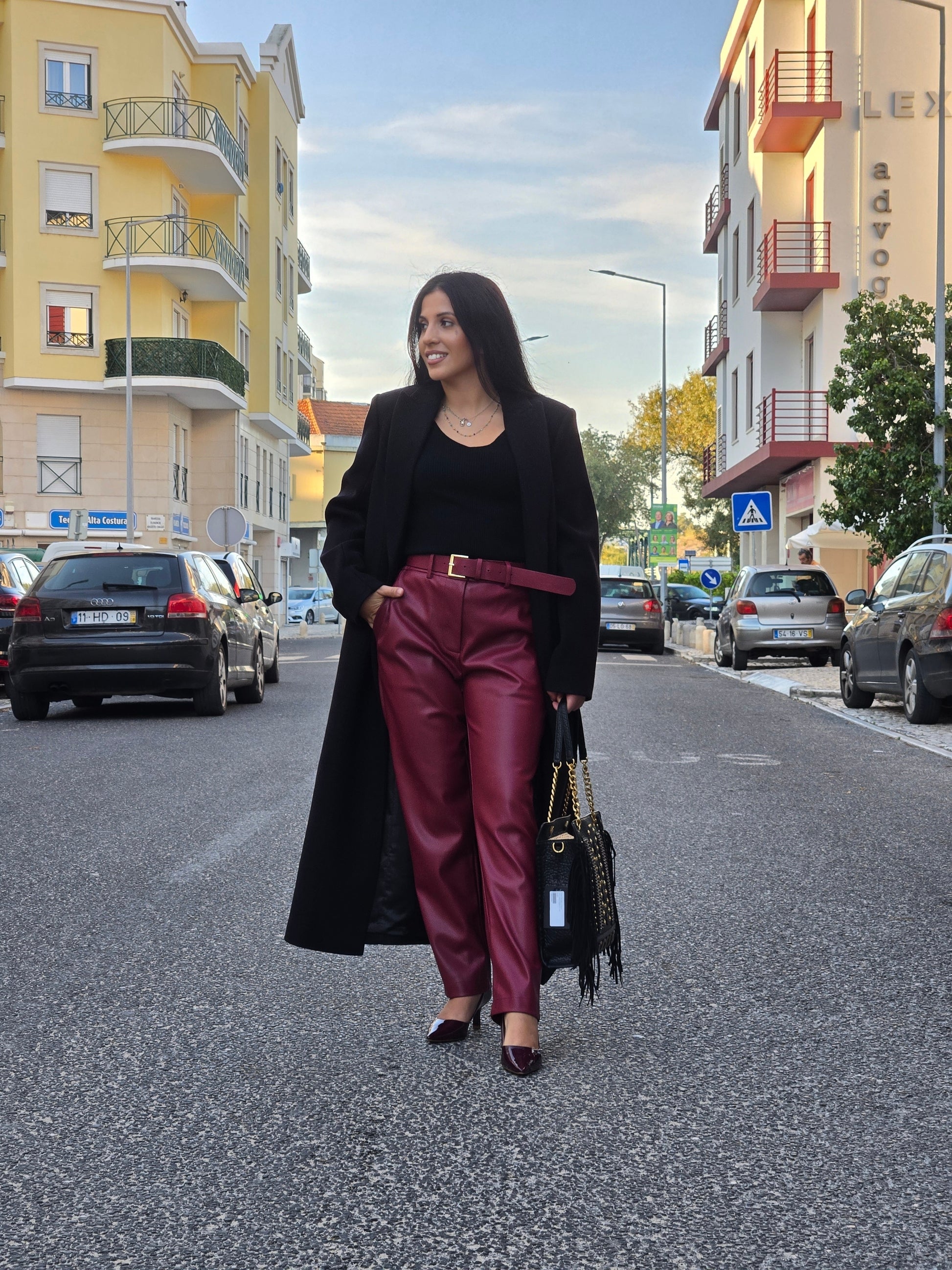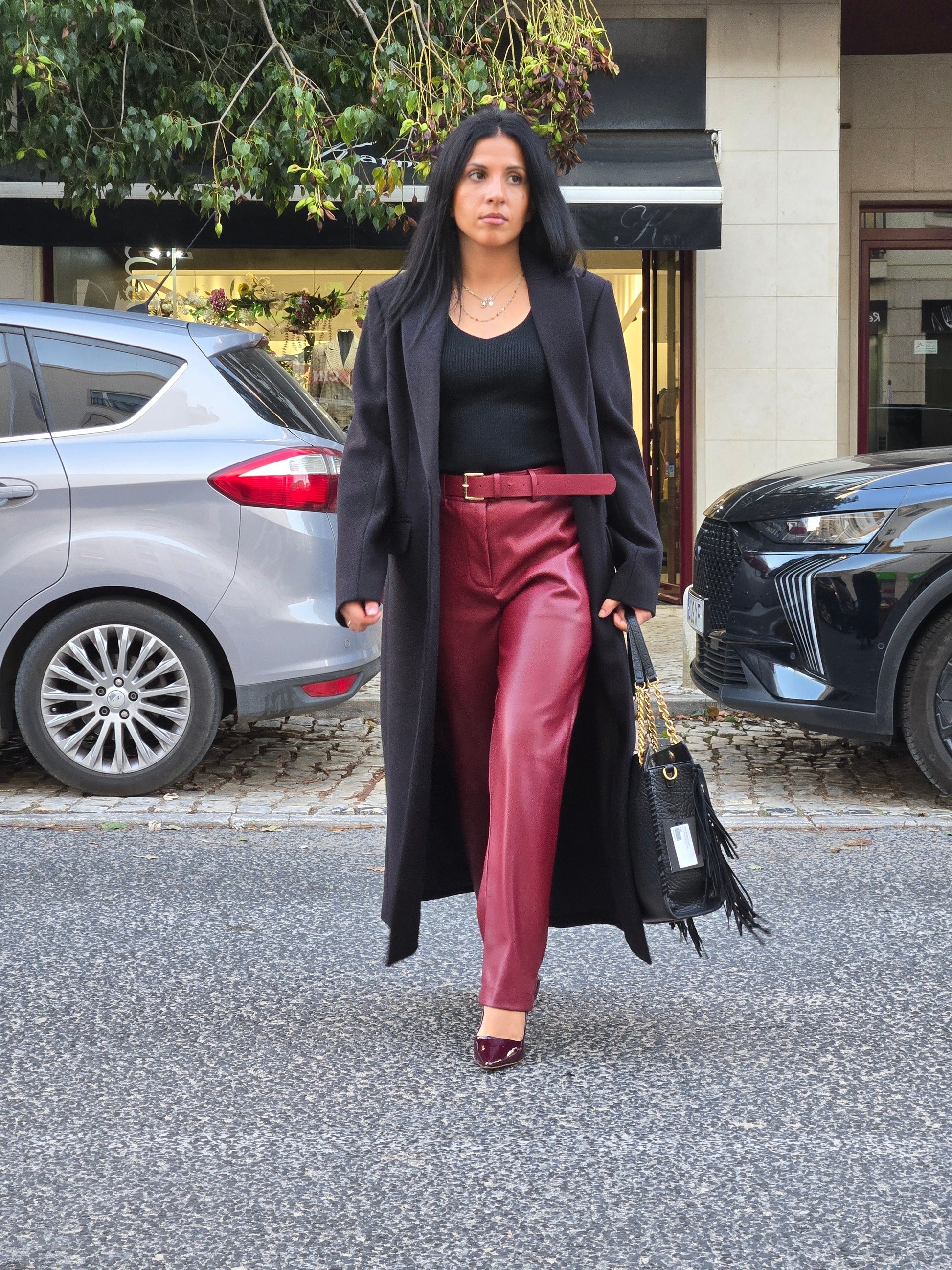 Calças de cintura com elastico parte trás e cinto. Bolsos laterais. Cintura com passadores. Fecho frontal com fecho de correr, botão forrado a combinar.