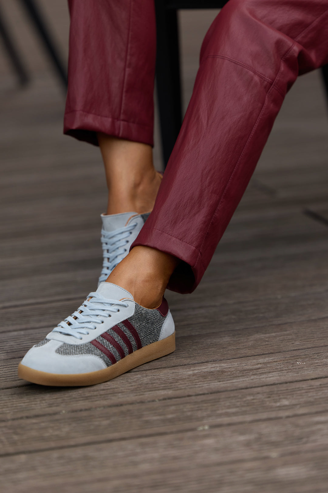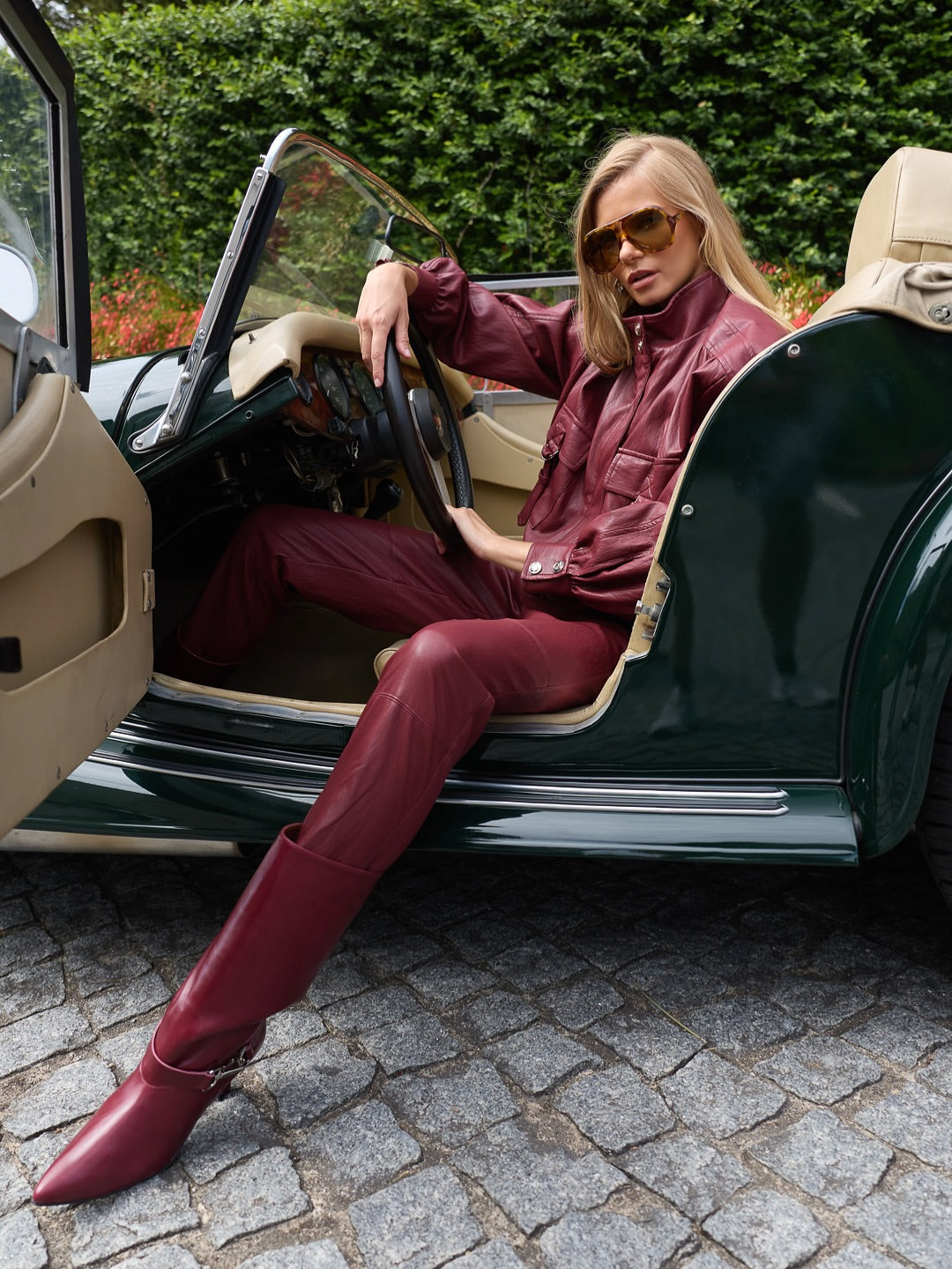 Calças de cintura subida com presilhas. Bolsos frontais. Fecho frontal com botão e fecho de correr.