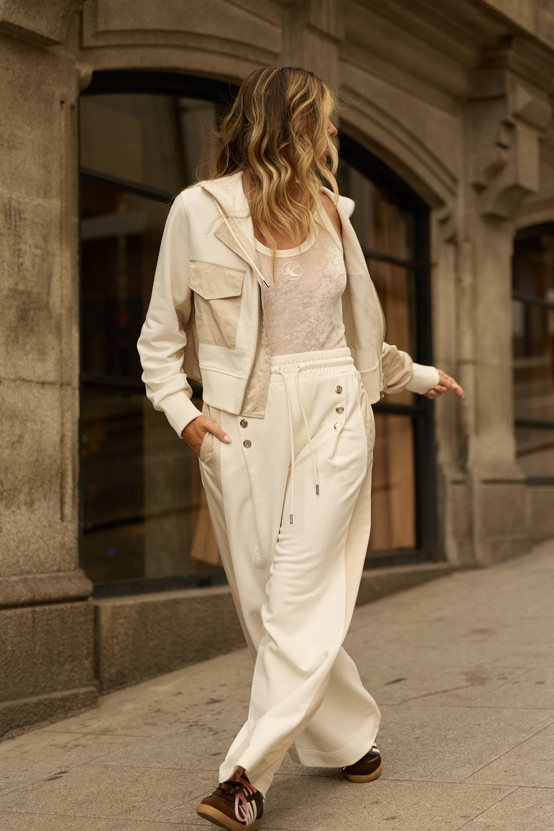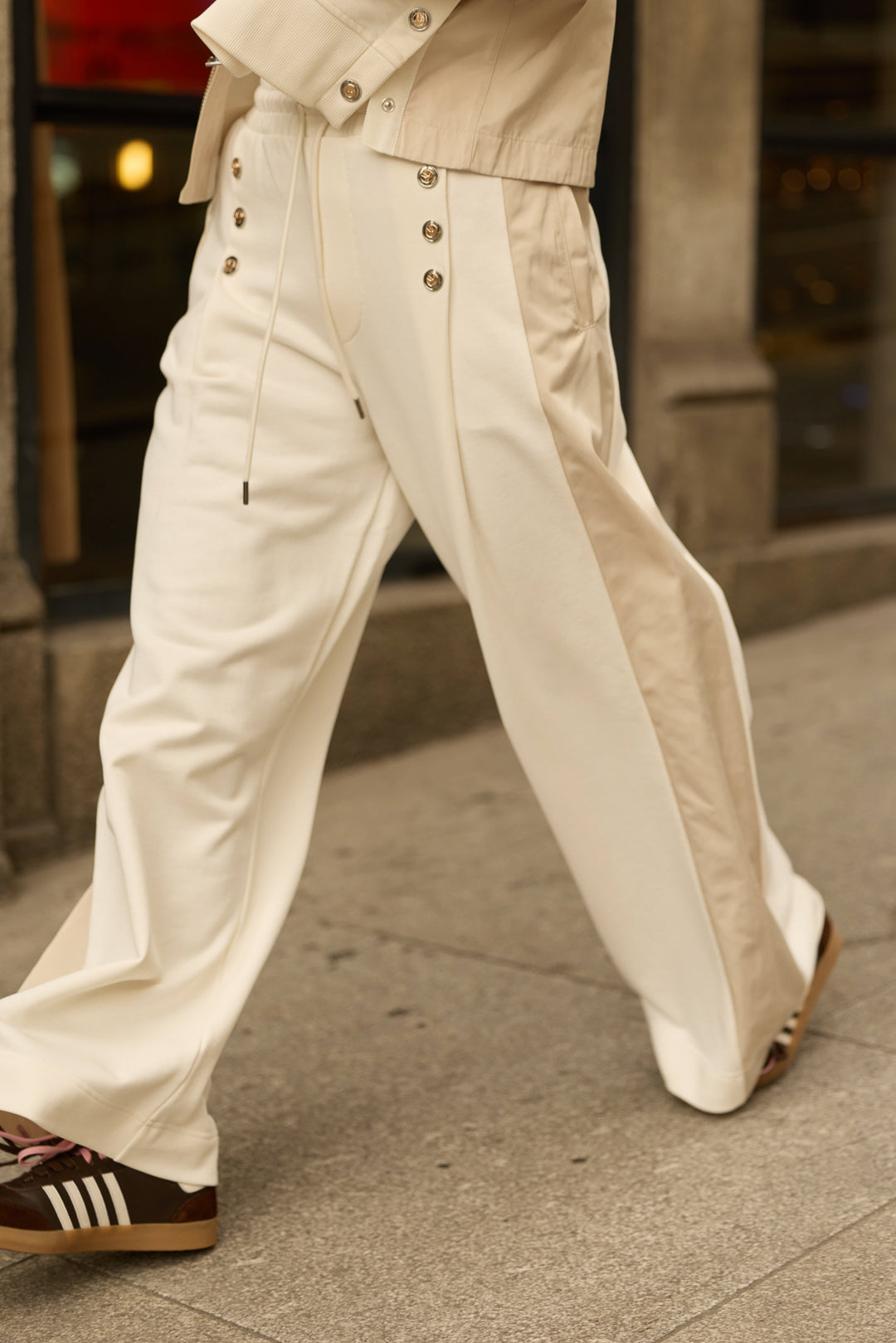 Calças de cintura subida com elástico na cintura e cordão. Prega marcada com botões. Bolsos laterais. Detalhe lateral de faixa em contraste. Perna larga.