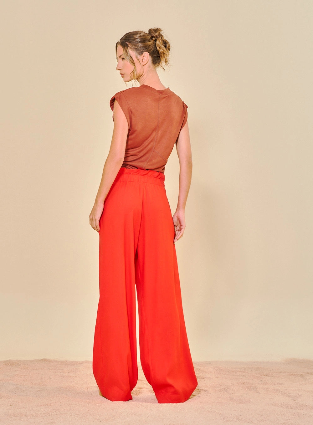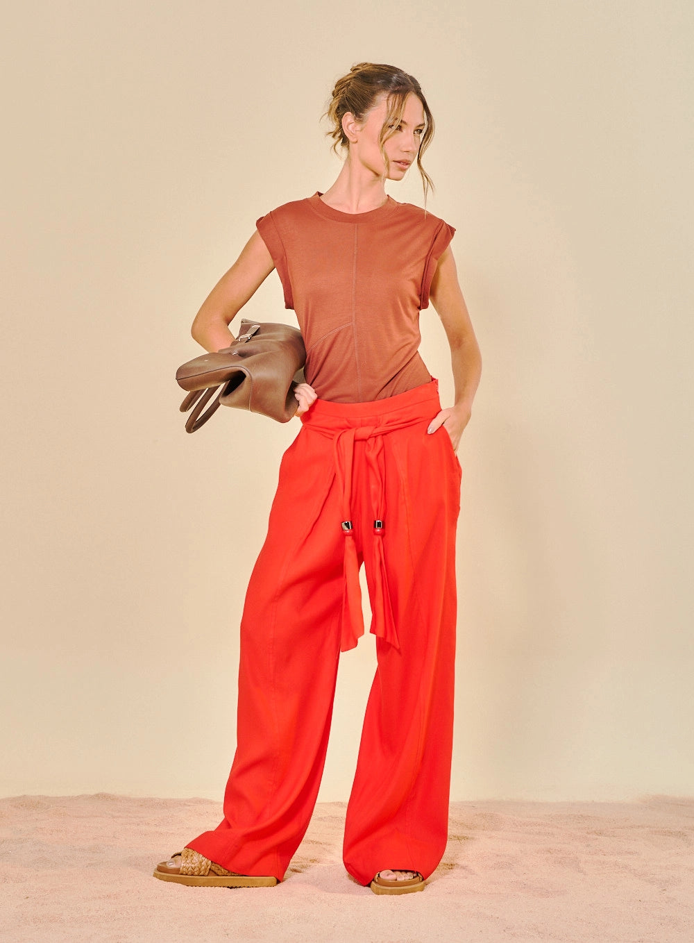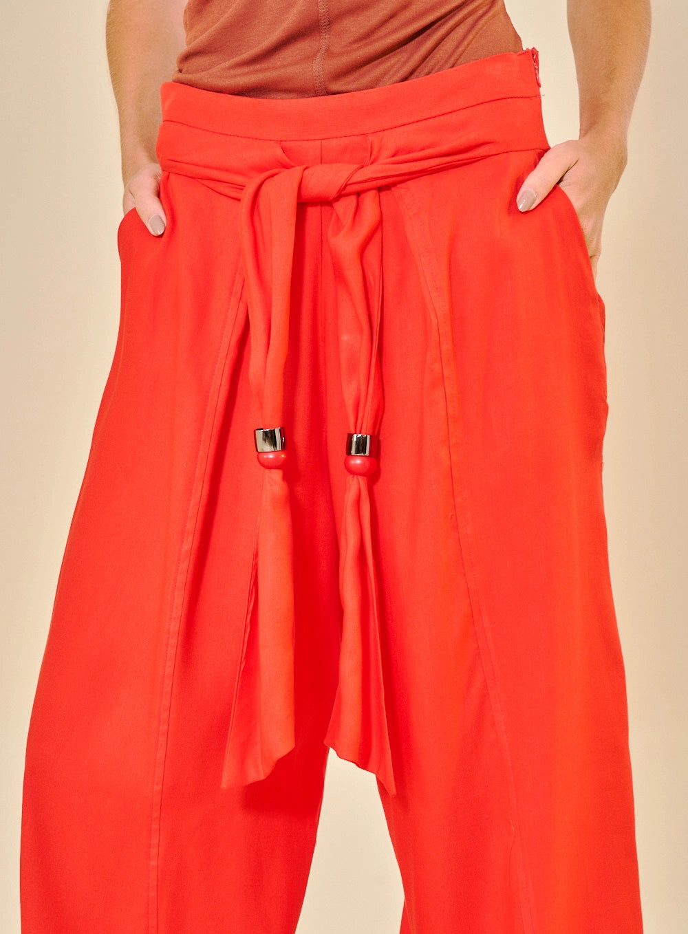 Calças amplas que combinam conforto e elegância. As pernas super fluidas proporcionam liberdade total de movimento, enquanto a cintura alta e o cós detalhado com faixa de aperto frontal criam um visual sofisticado e ajustável. O destaque especial são as ponteiras exclusivas handmade, que misturam metal e esferas coloridas, conferindo um acabamento artesanal único a cada peça.