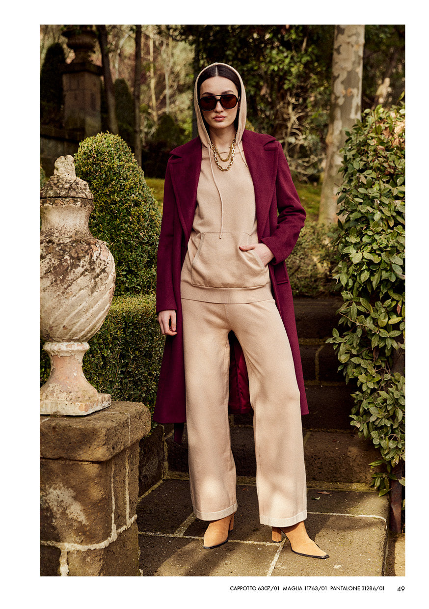 Calças de cintura subida confecionadas em tecido de malha. Cintura subida com cós elástico. Bainha com acabamento em contraste.