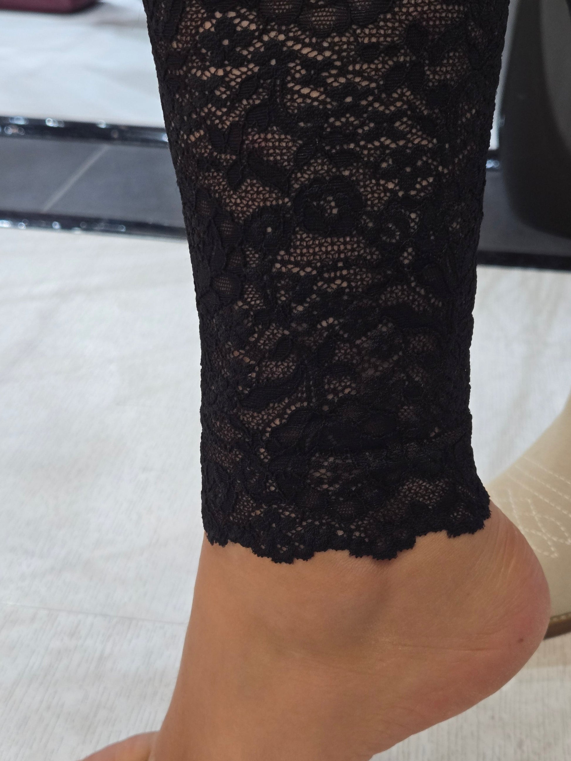 Calças tipo legging semitransparente confecionadas em tecido de renda suave. Cintura subida e elástica. Detalhe parte inferior.