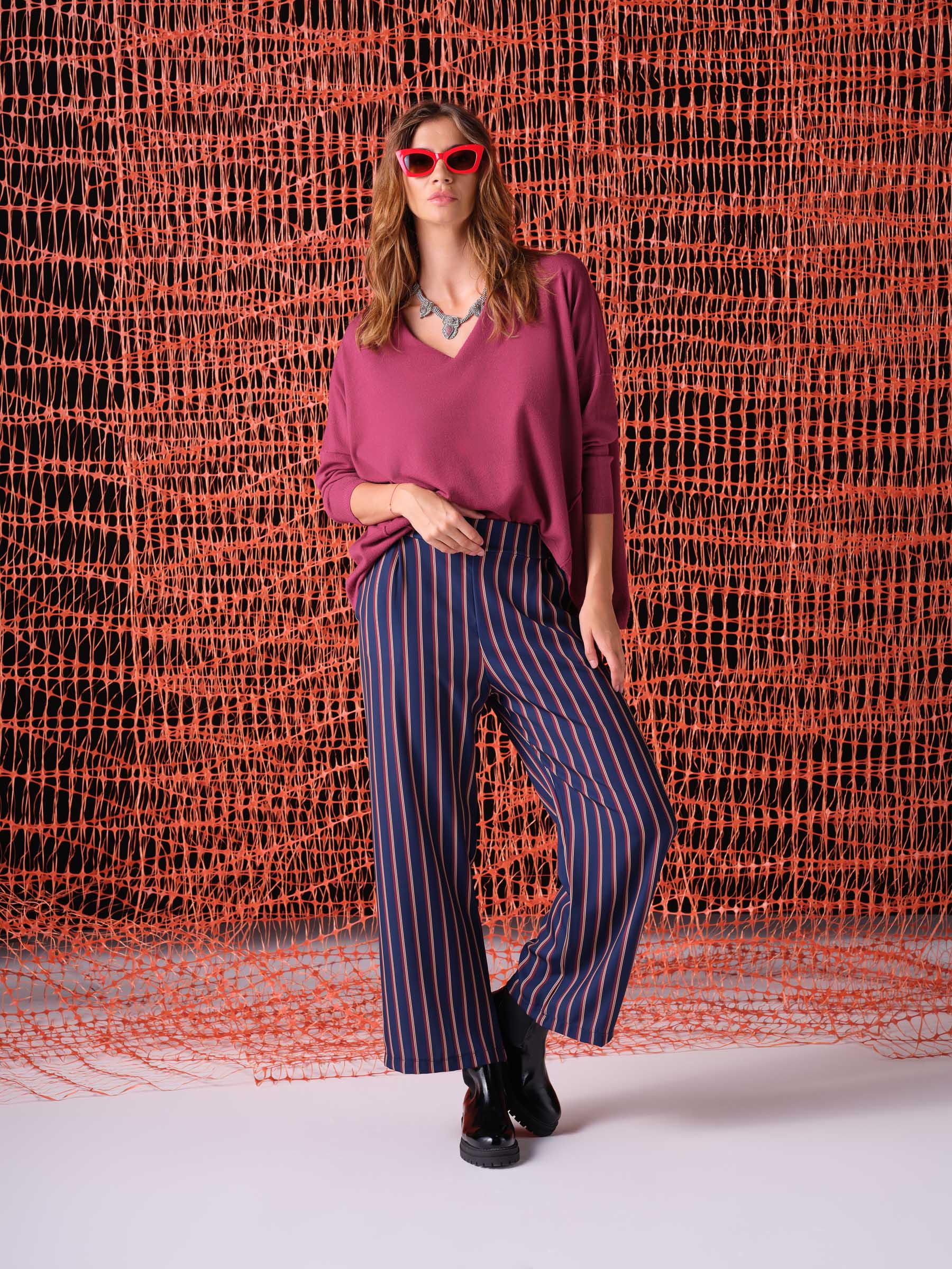 Calça listada de cintura subida. Bolsos laterais. Cintura elástica