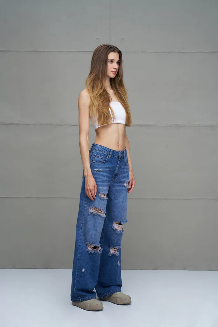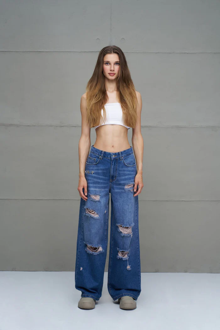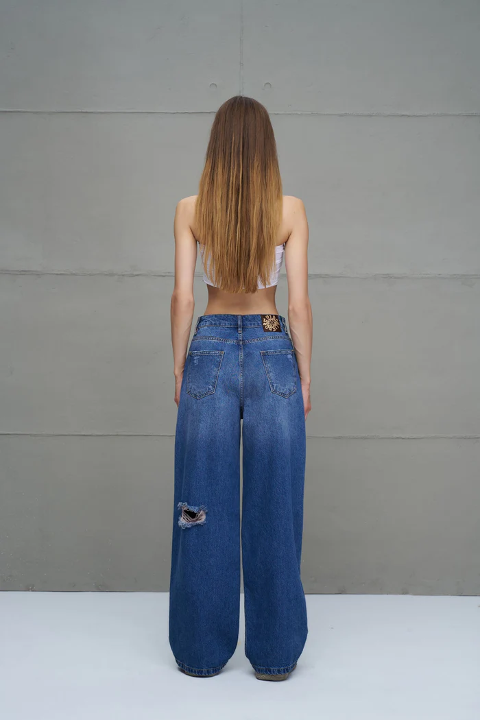 Calças Jeans baggy de cintura subida confecionados em denim de algodão. Cinco bolsos. Lavagem com efeito de rasgões nas pernas. Detalhe de rasgos. Fecho frontal com fecho de correr e botão metálico.