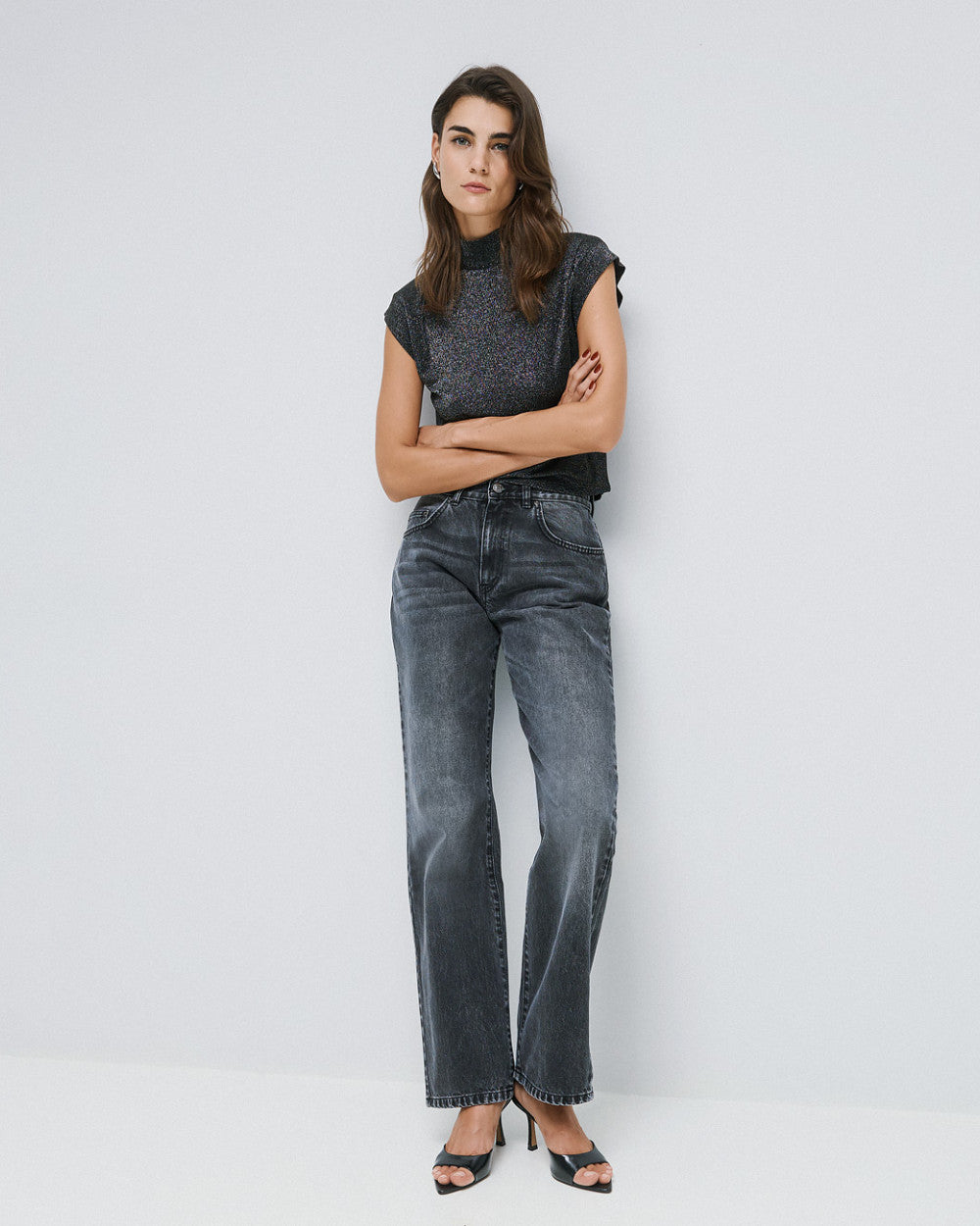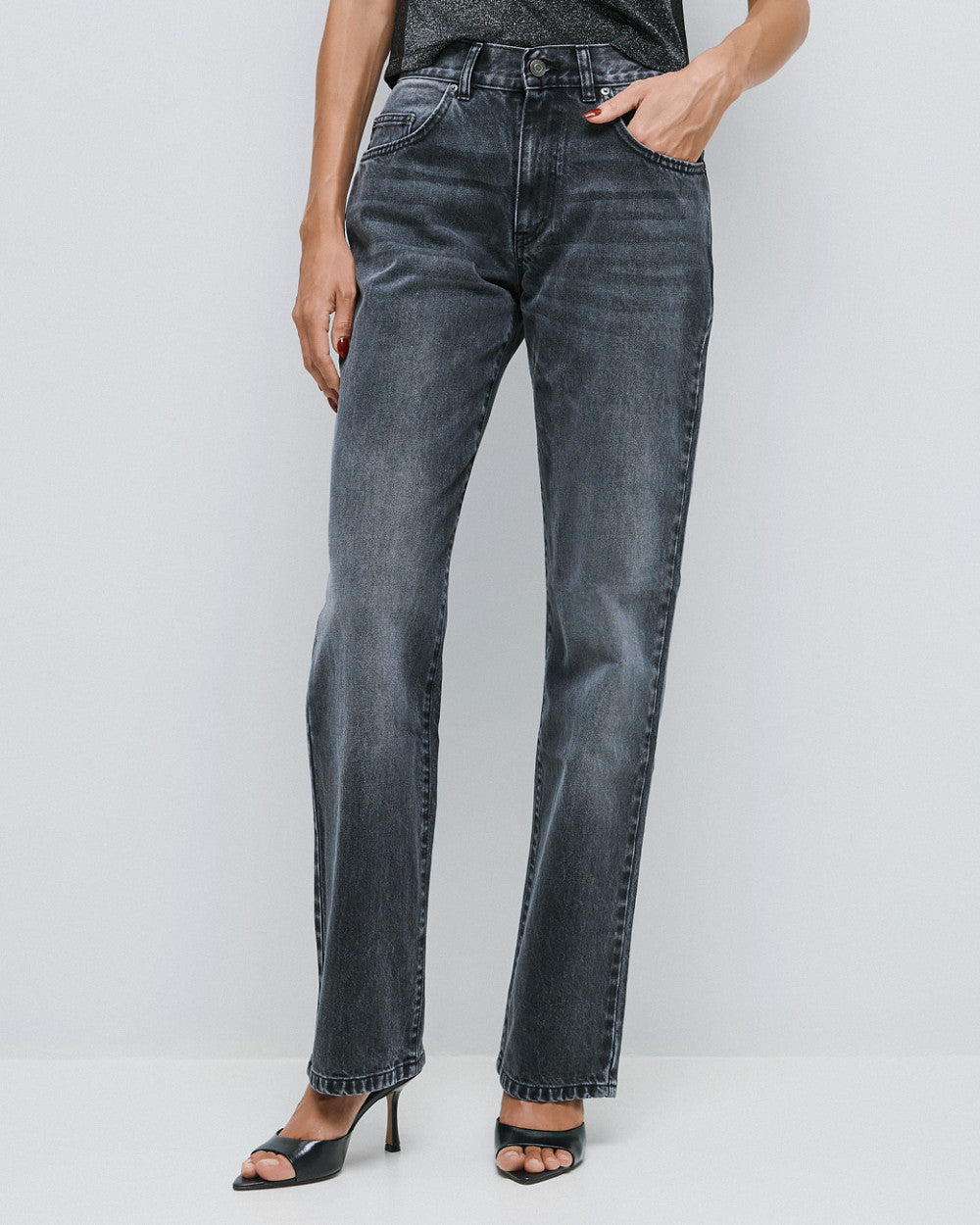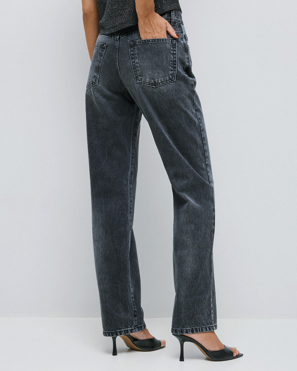 Calças de cintura média com efeito desbotado. Com bolsos laterais e traseiros. Fecho frontal com fecho de correr e botão metálico.
