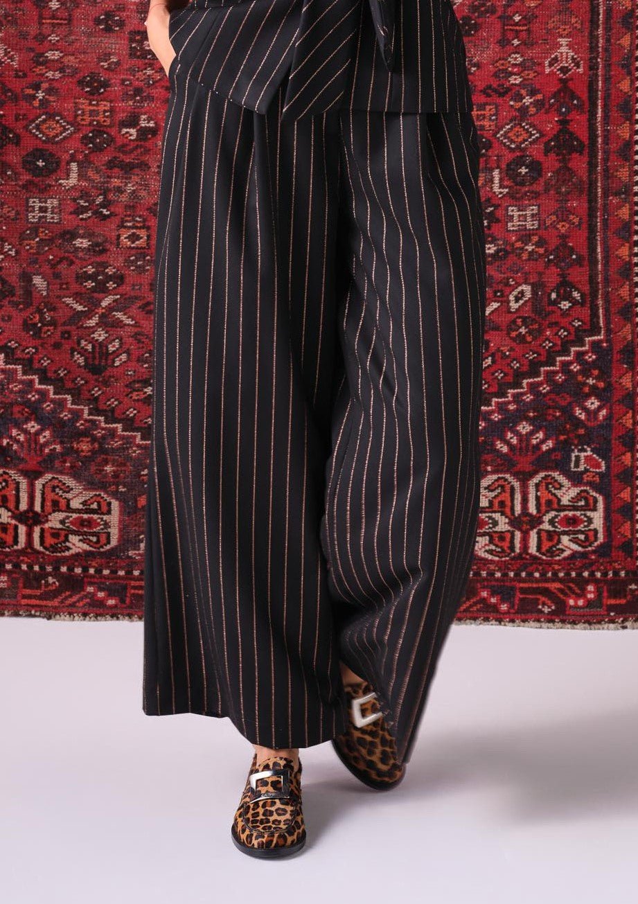 Calças de cintura subida com pregas. Pernas largas. Bolsos laterais e bolsos traseiros embutidos decorativos. Riscas do tom em rose gold em contraste. Fecho frontal com fecho de correr e botão.