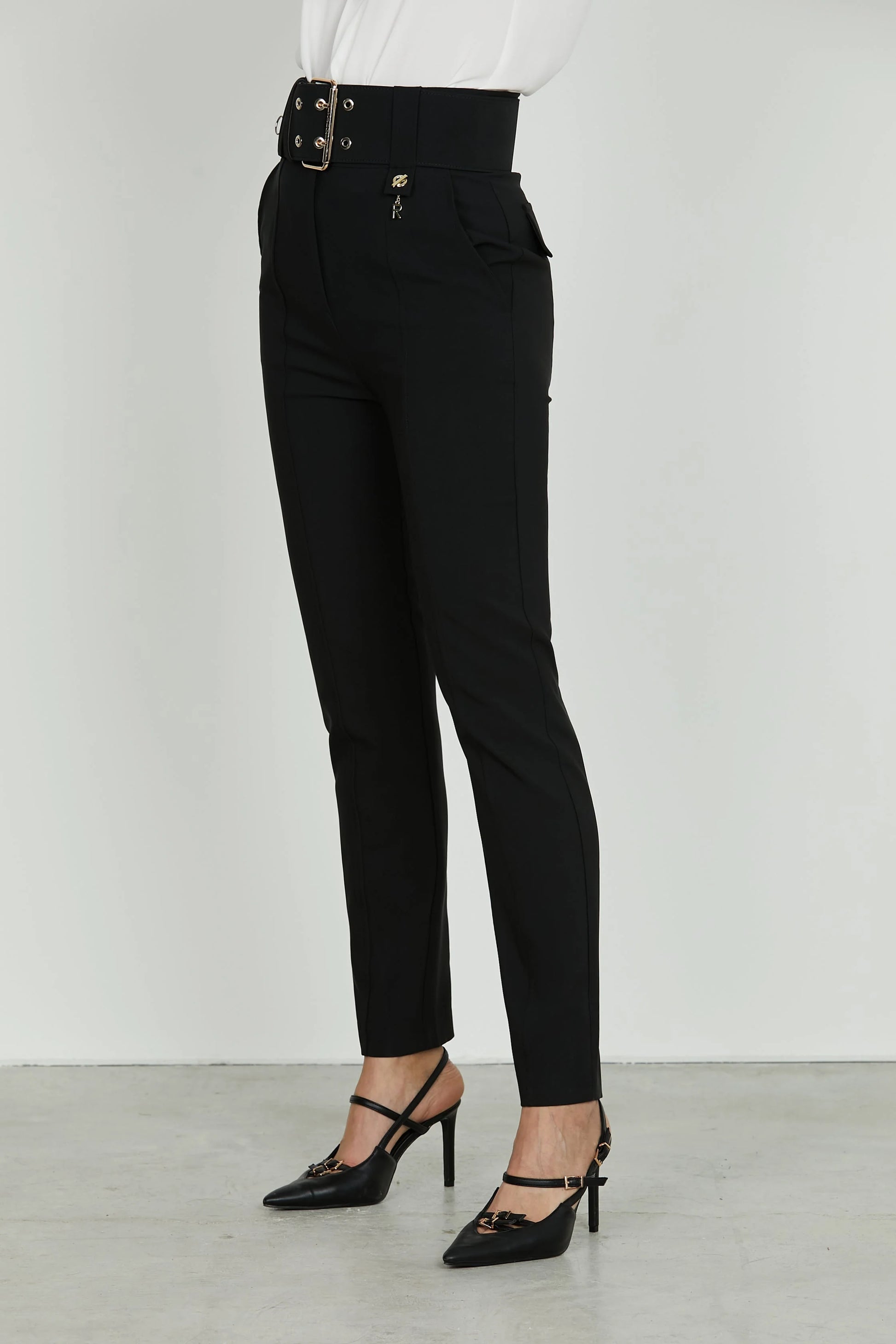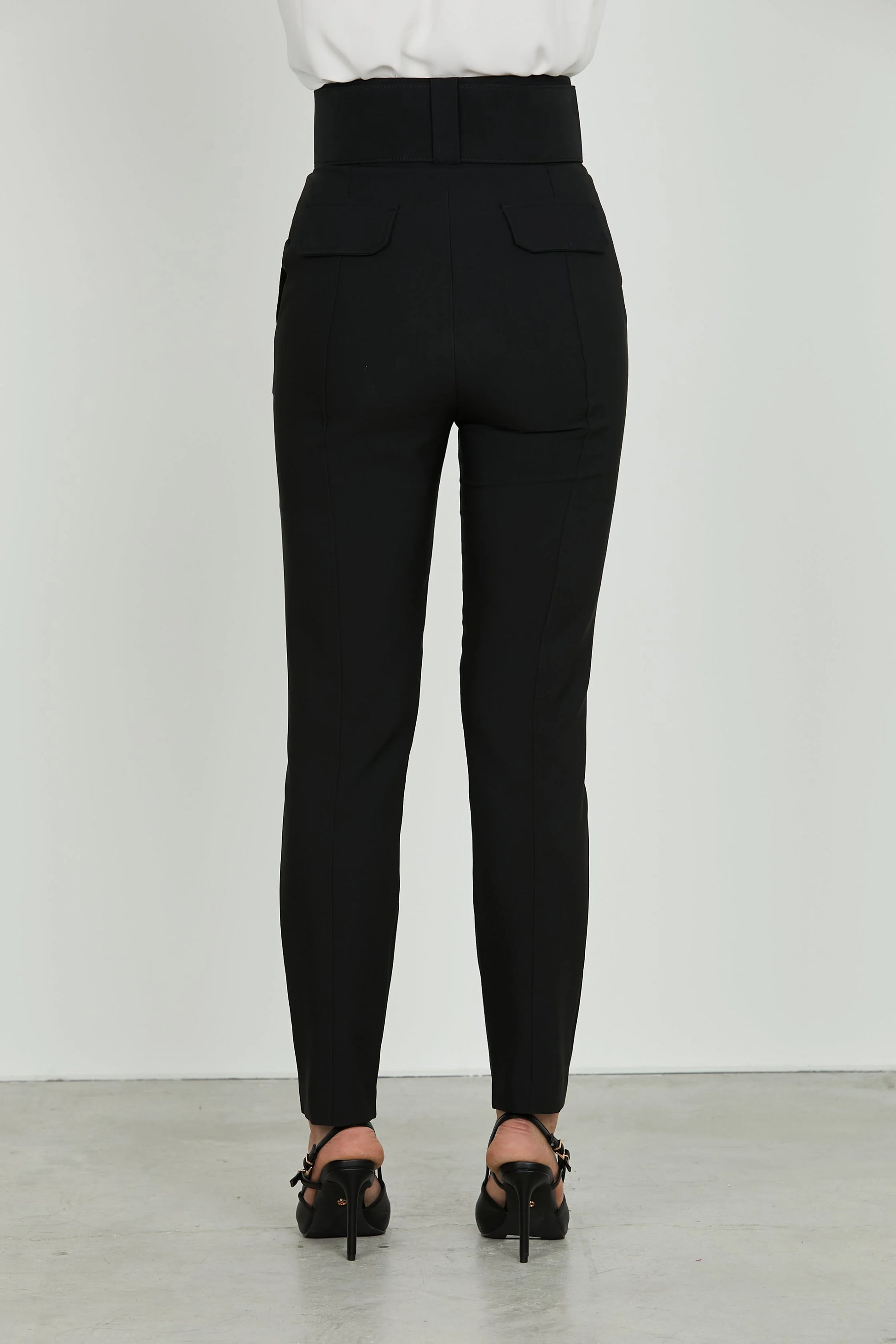 Calças de cintura subida com marcação frontal à frente. Bolsos frontais e falsos bolsos com aba atrás. Fecho frontal com fecho de correr. Cinto com fivela dourada do mesmo tecido.