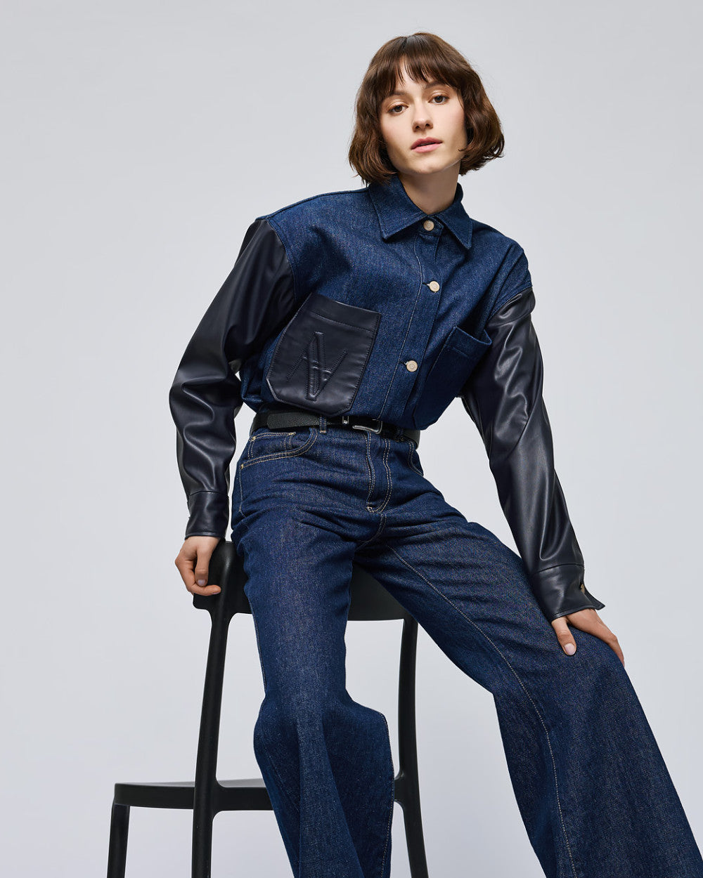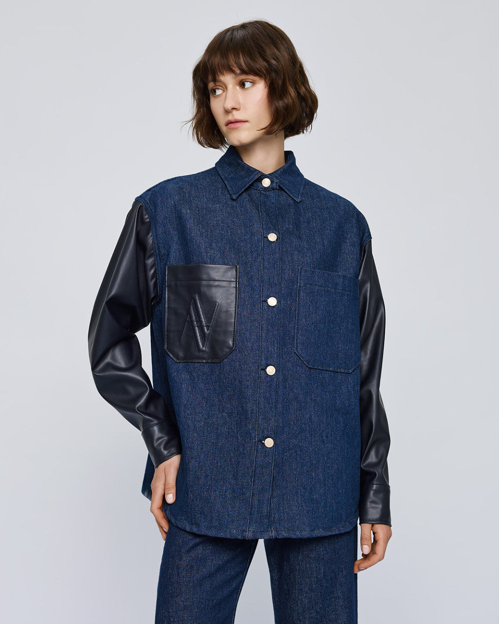 Camisa oversize com gola de abas e manga comprida em ecopele. Bolso frontal de chapa em ecopele. Fecho mediante botões.