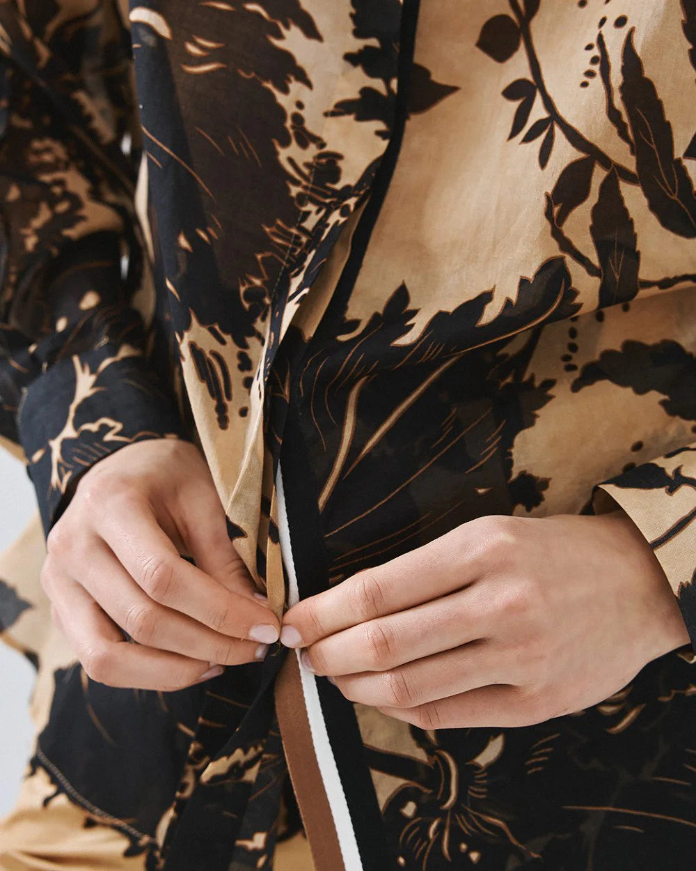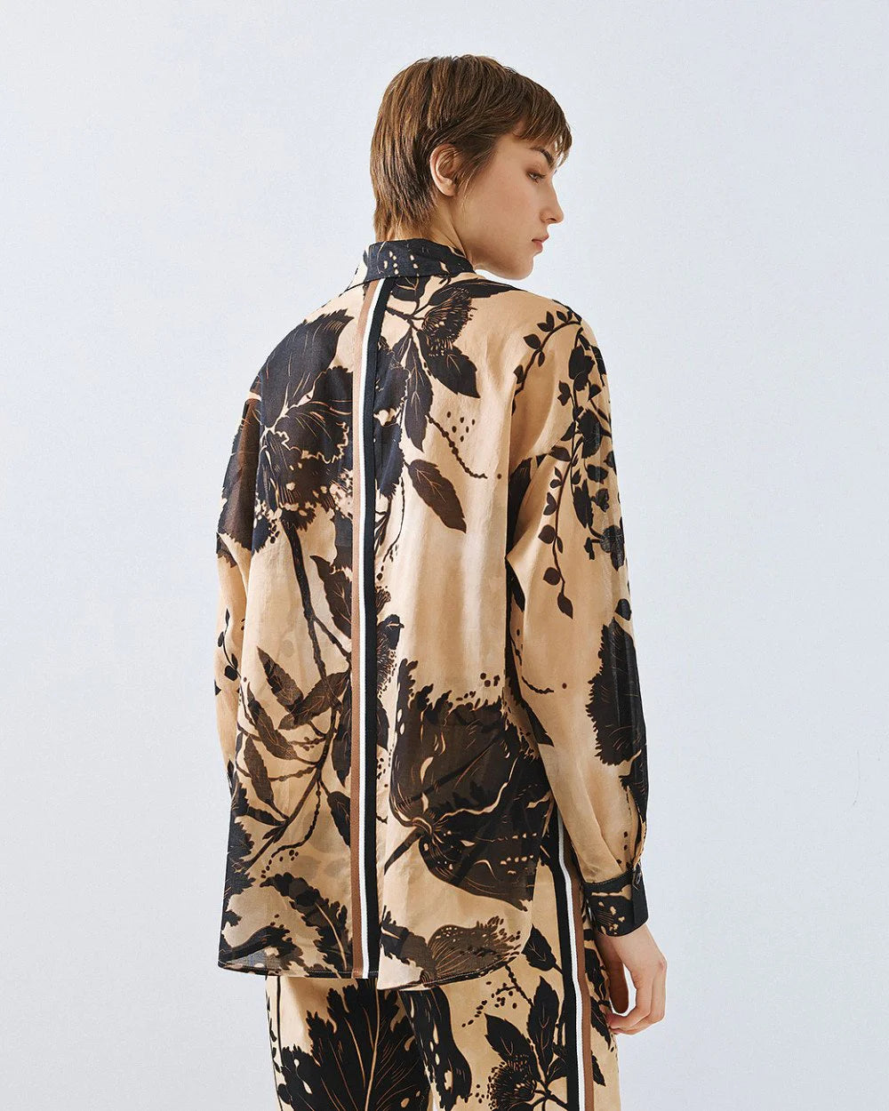 Camisa estampada com design floral que combina estilo e conforto. Apresenta gola de lapela e mangas compridas com punho ajustável. O fecho frontal com botões. Detalhe com faixa em contraste nas costas adiciona um toque sofisticado e diferenciador.