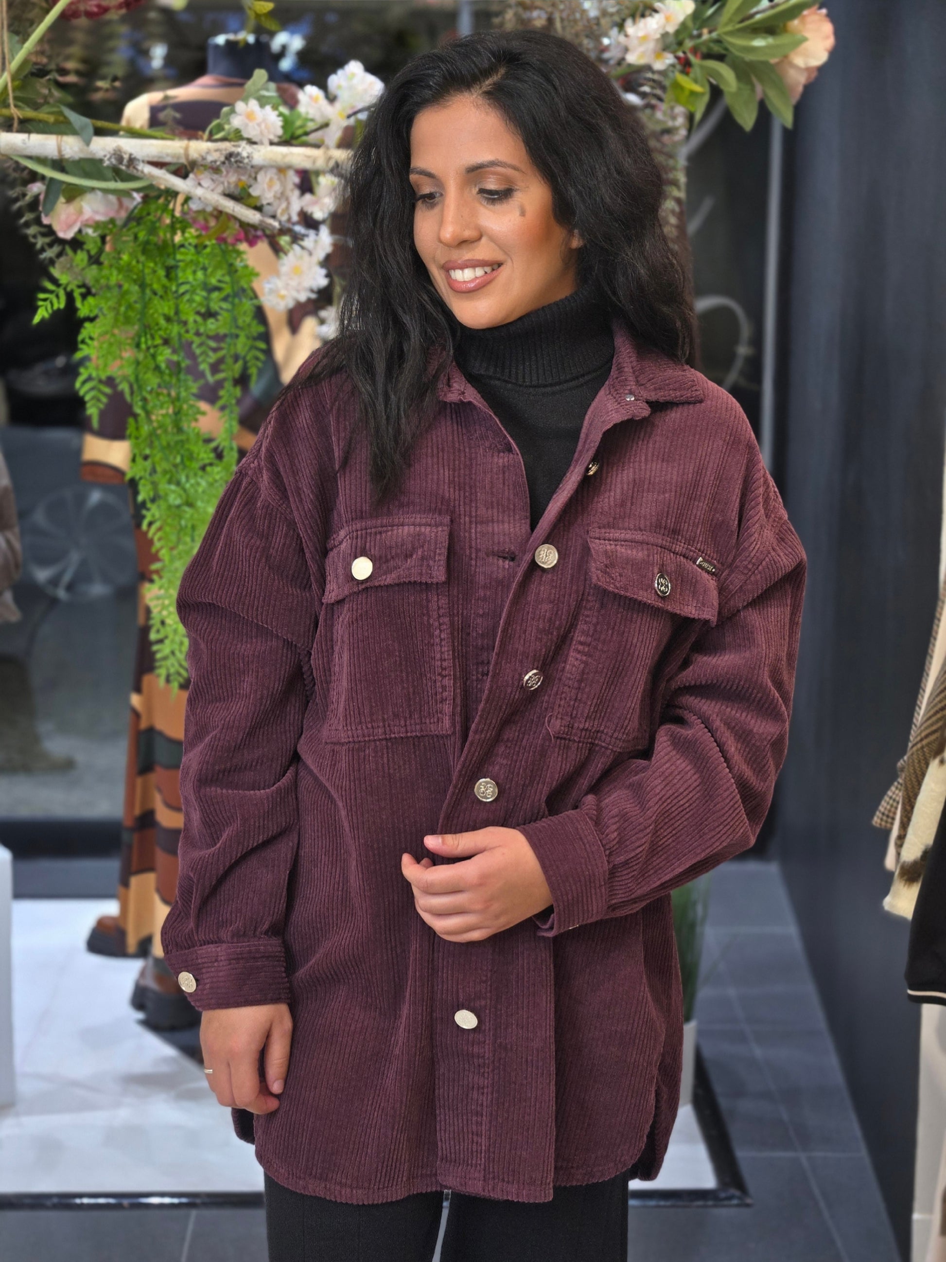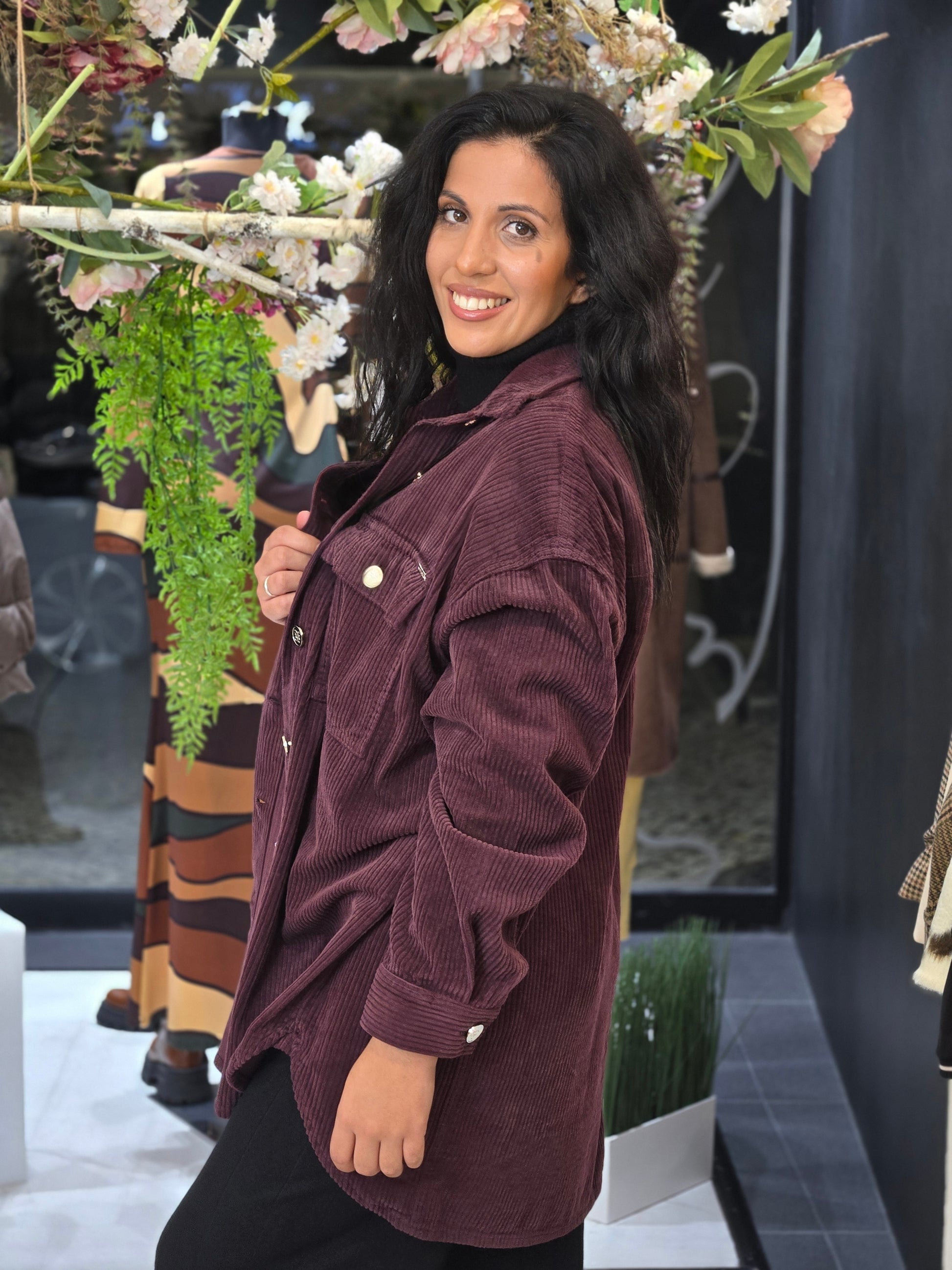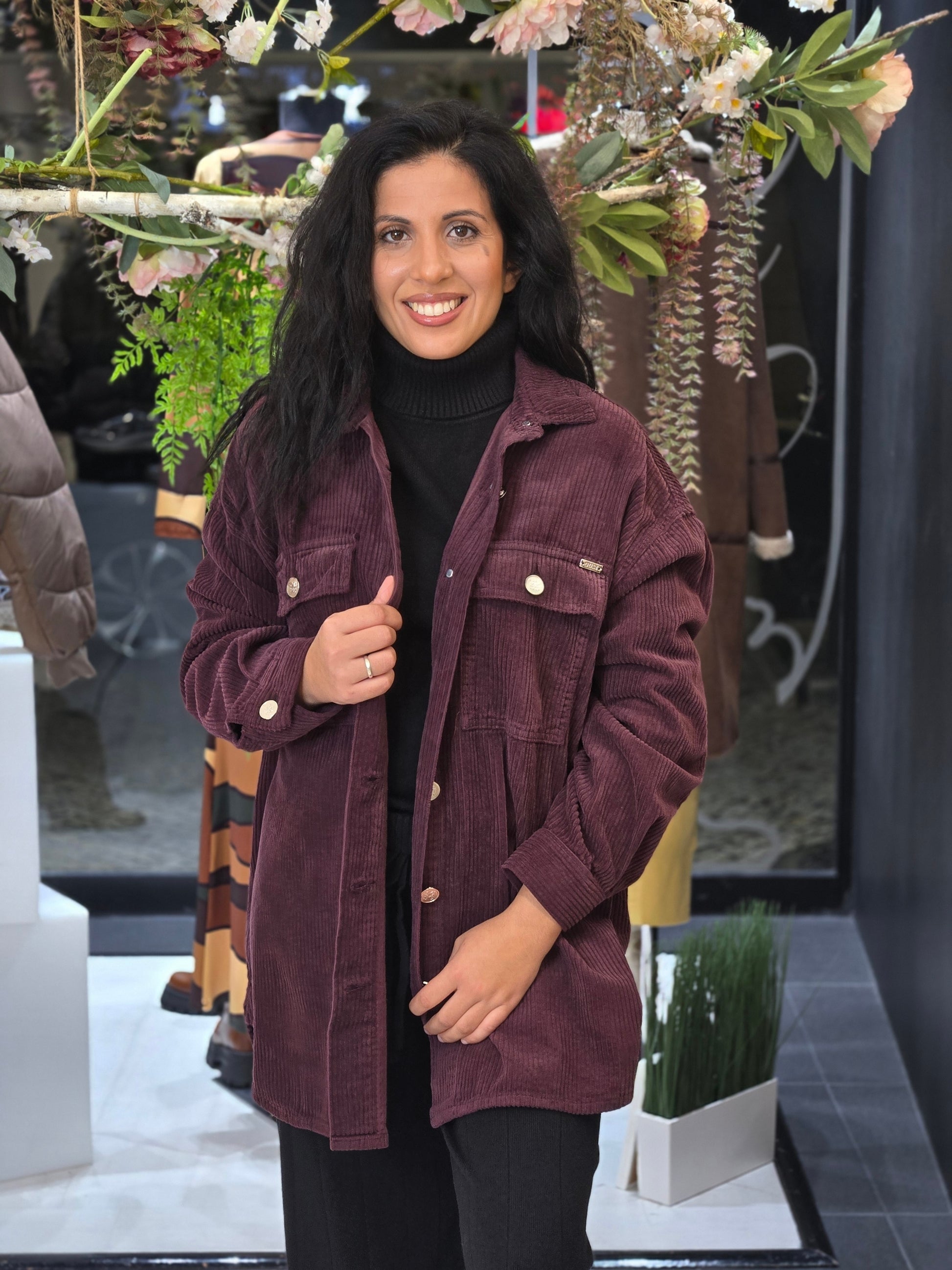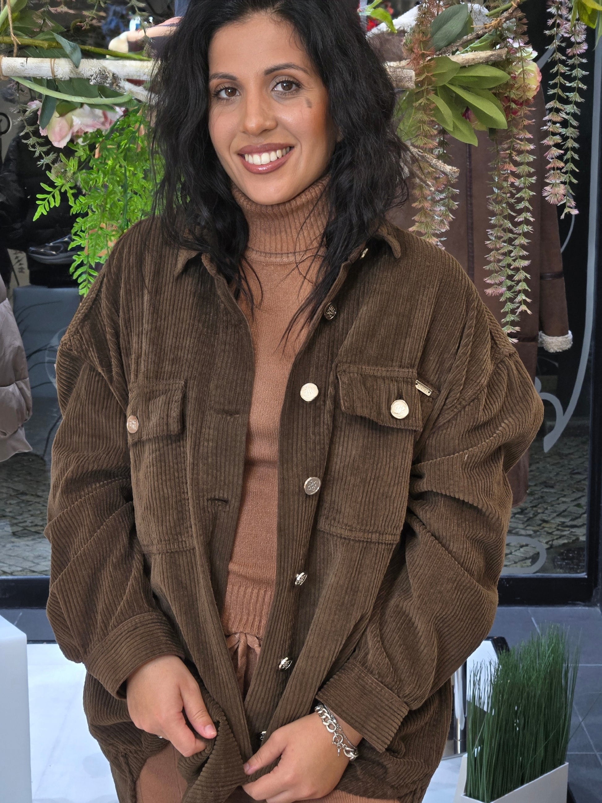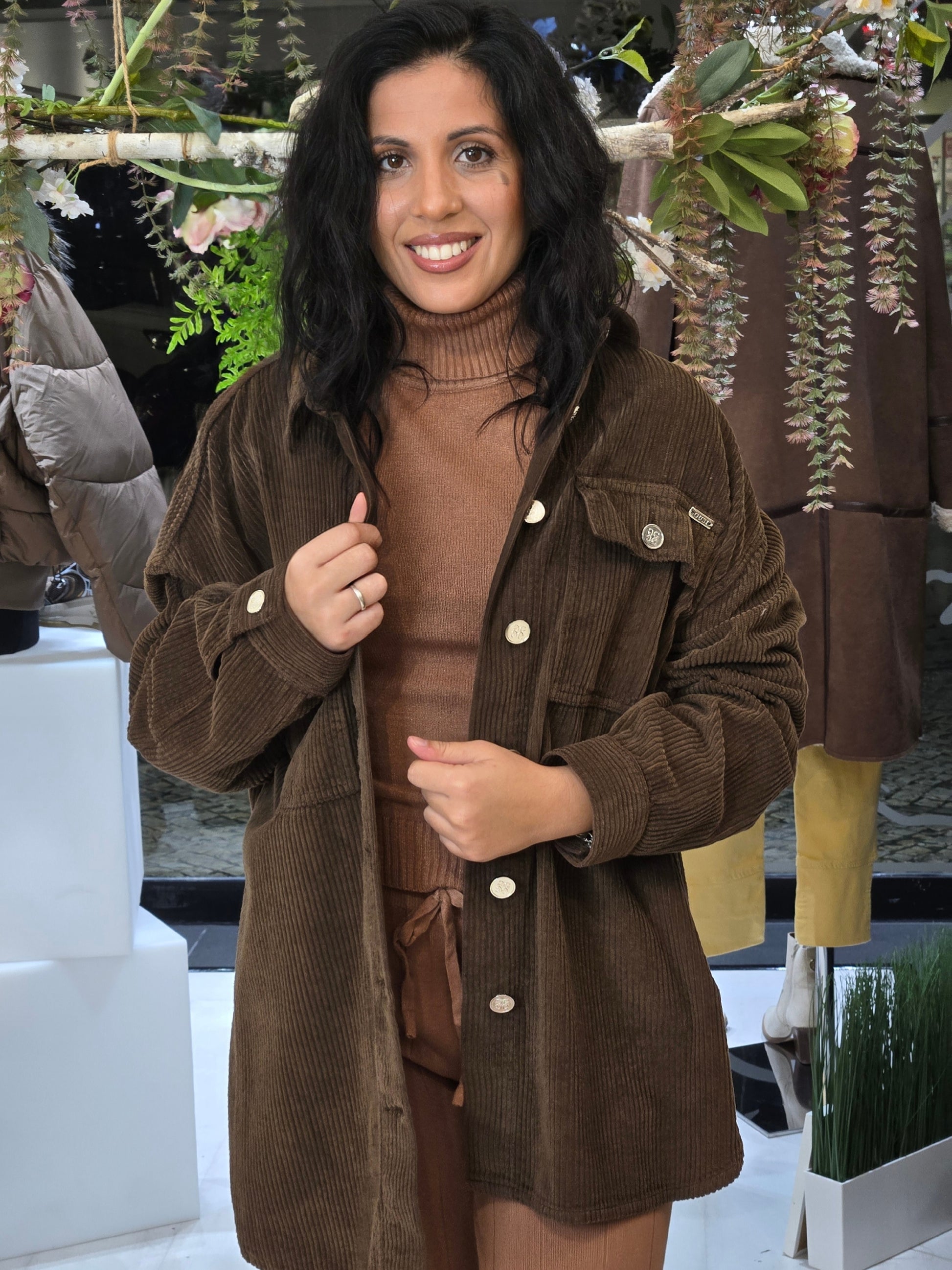 Camisa larga de gola de abas e manga comprida. Bolsos de chapa á frente com pormenor de botão. Bainha com aberturas laterais. Fecho frontal com botões metálicos.