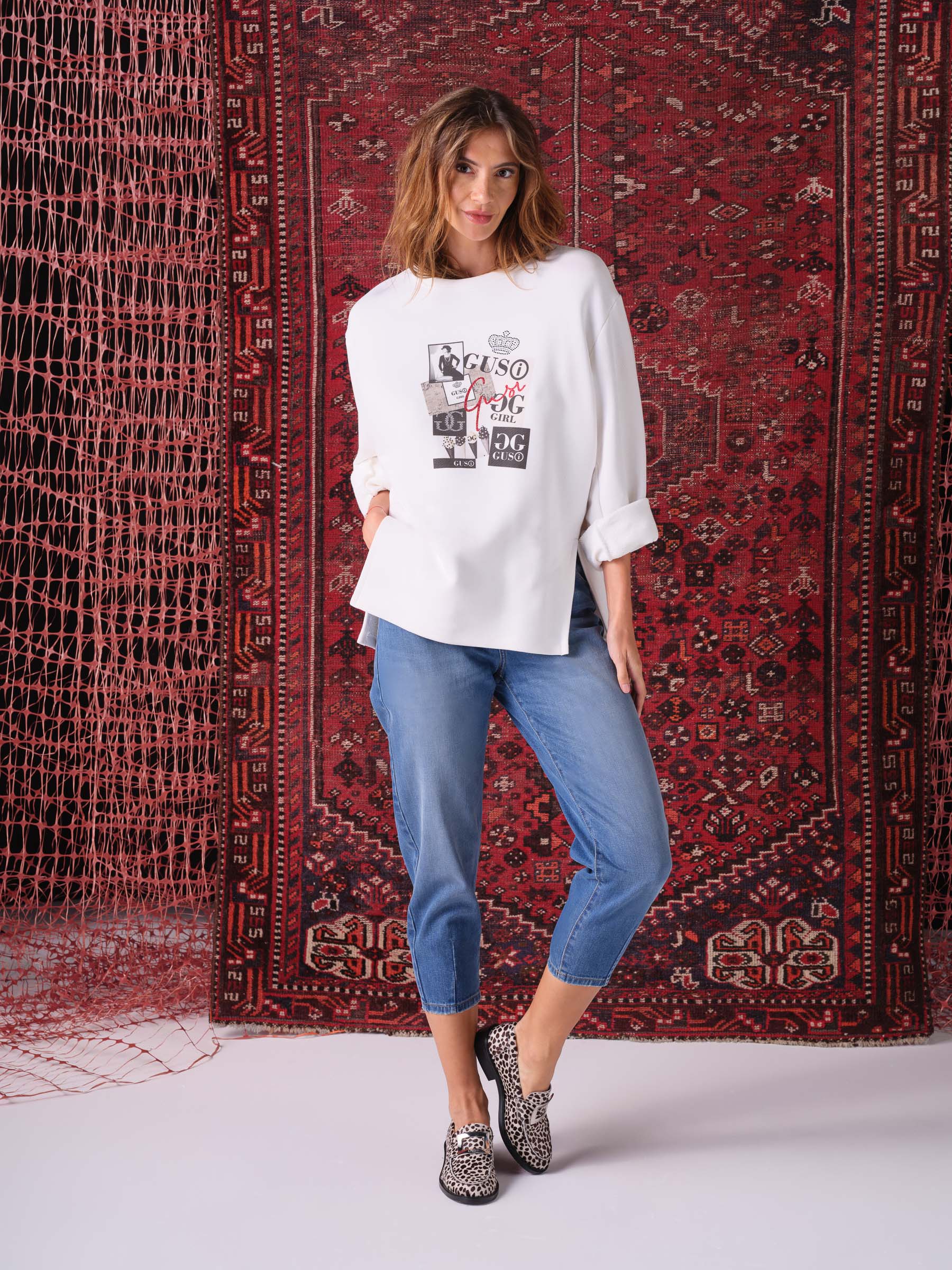 Camisola com decote redondo. Manga comprida sem marcação punho. Abertura lateral. Detalhe de estampa frontal.