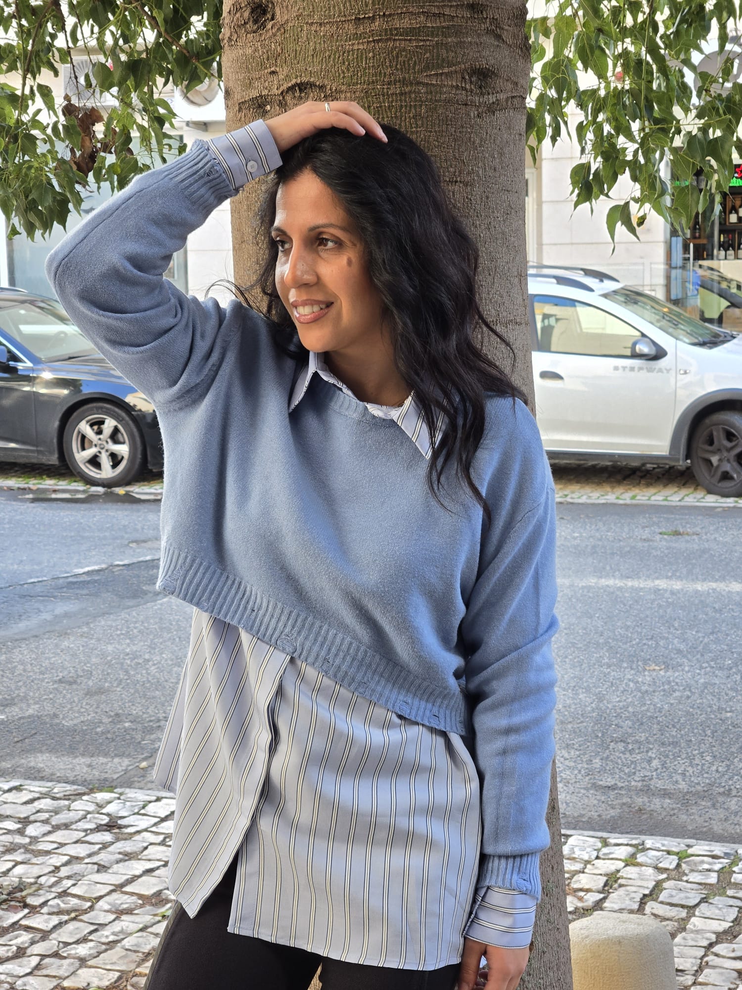Camisola com decote redondo e manga comprida. Acabamento canelado. Detalhe de rasgos nos punhos e acabamento.