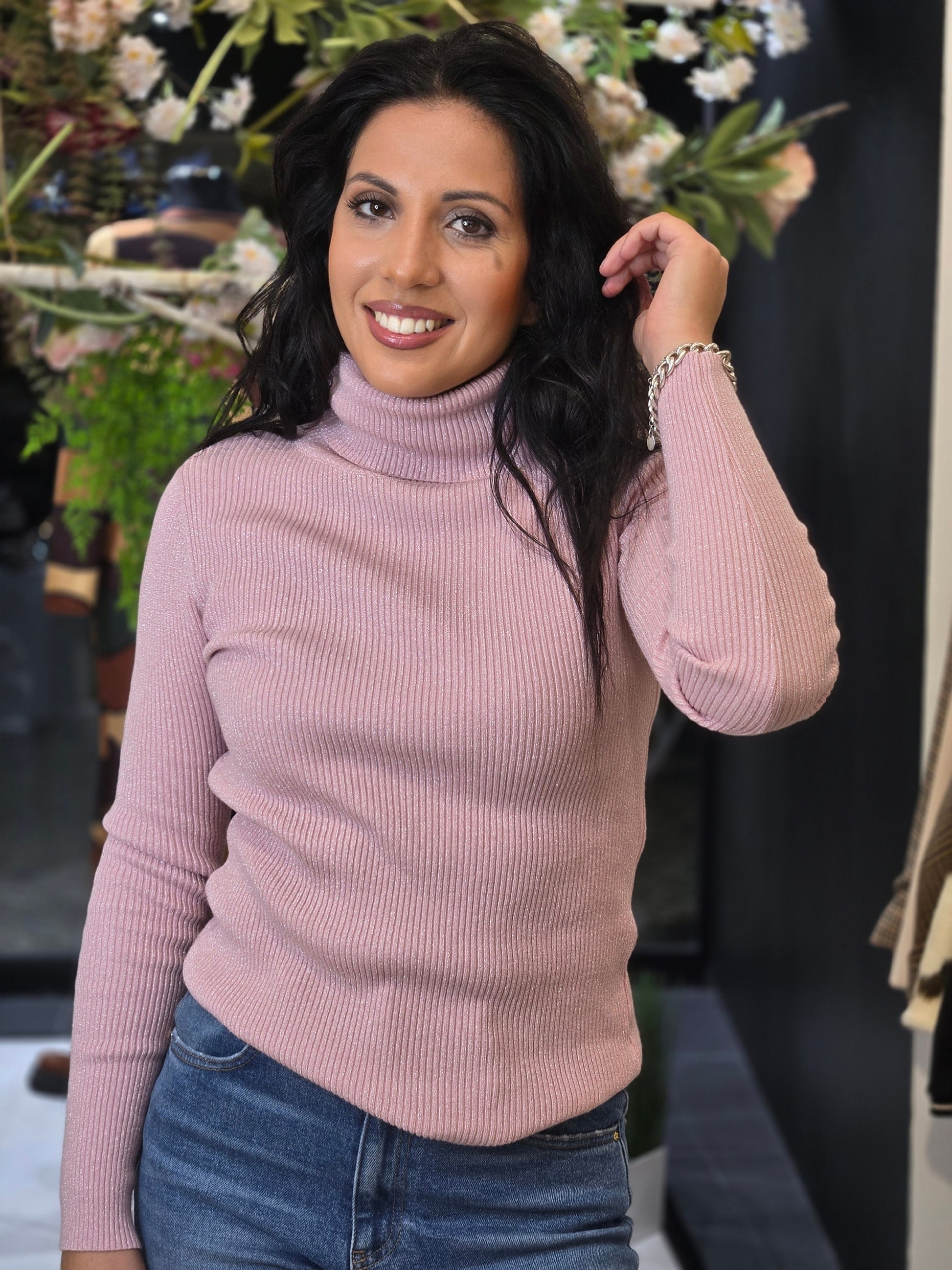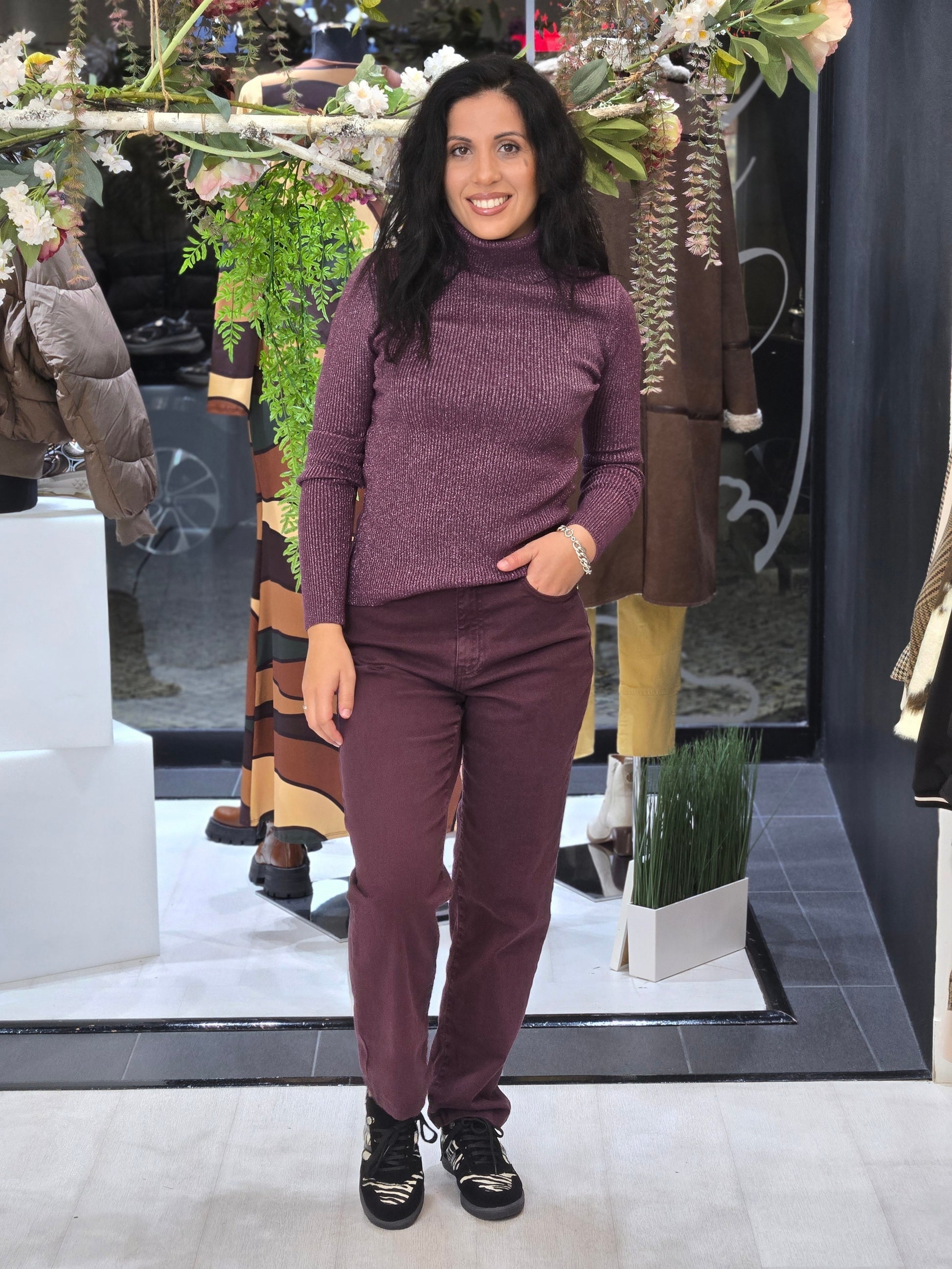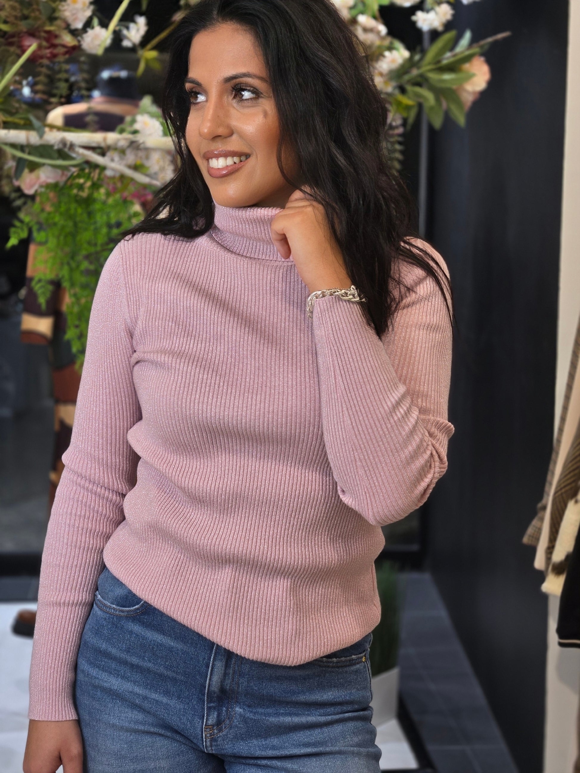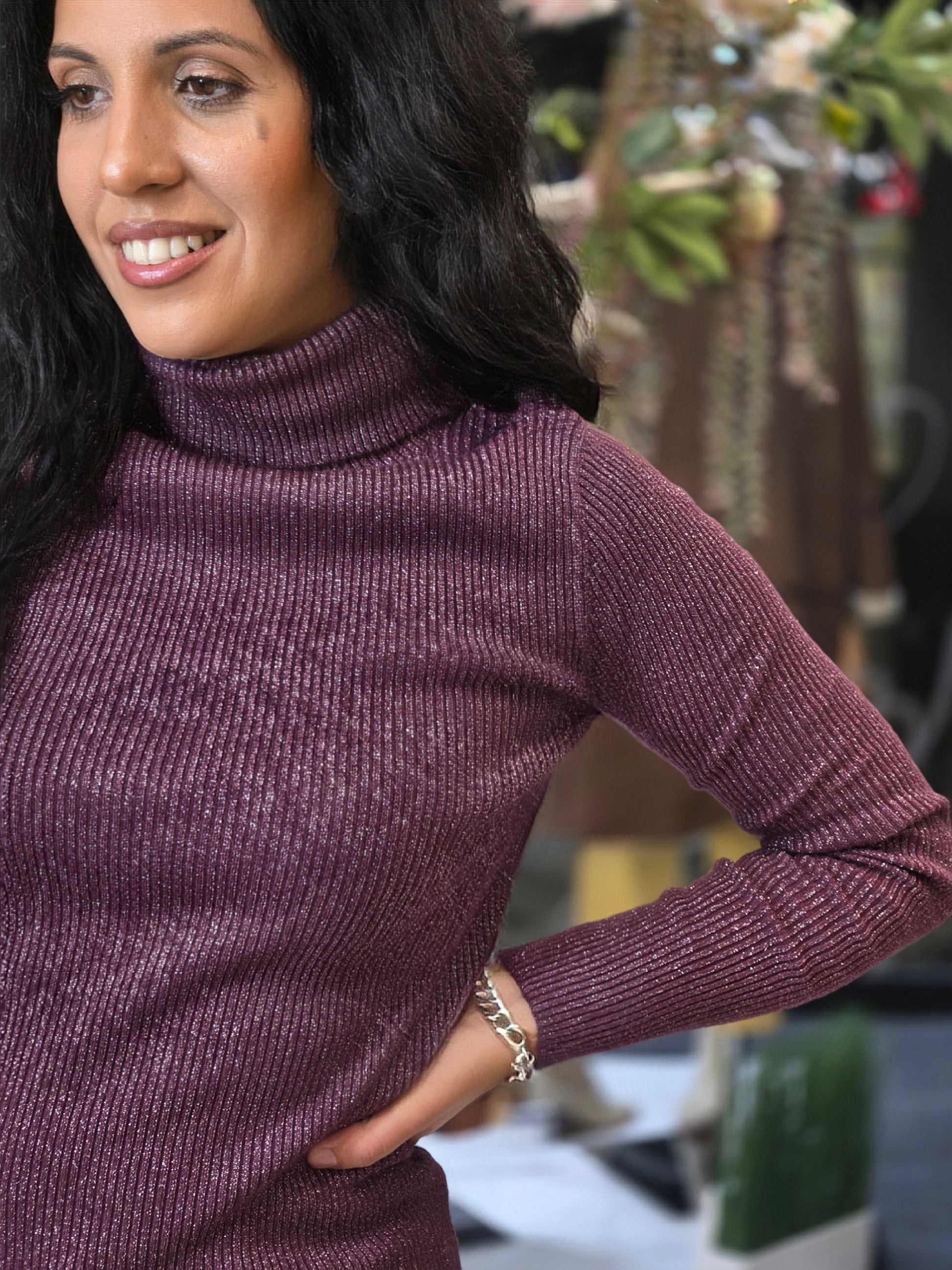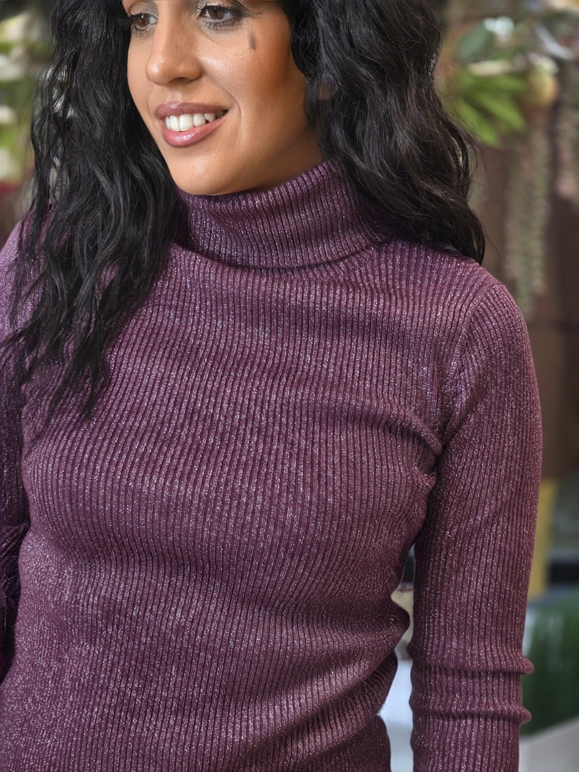 Camisola de gola alta de modelagem slim. Manga comprida. Detalhe de fios com brilho em contraste.