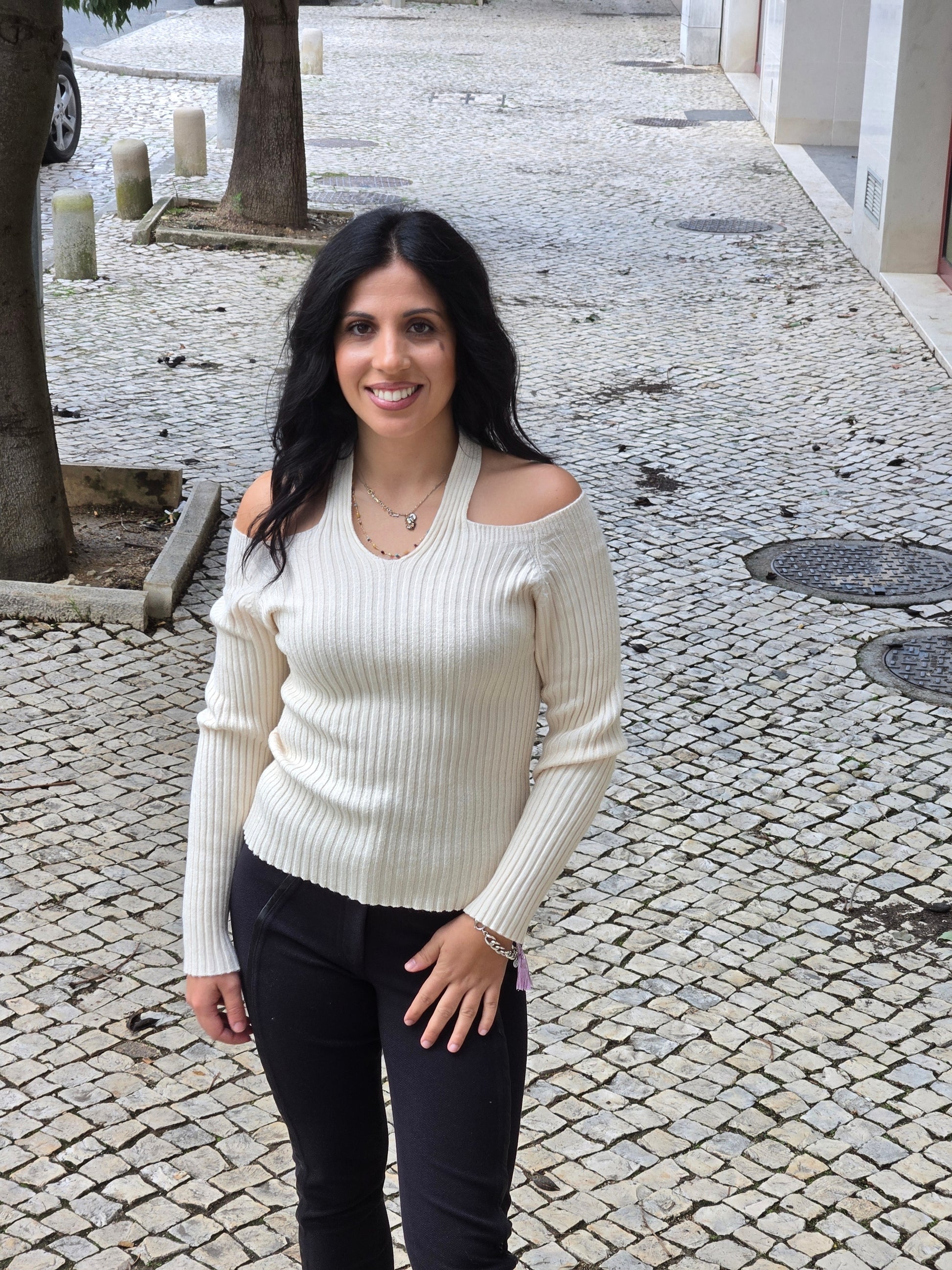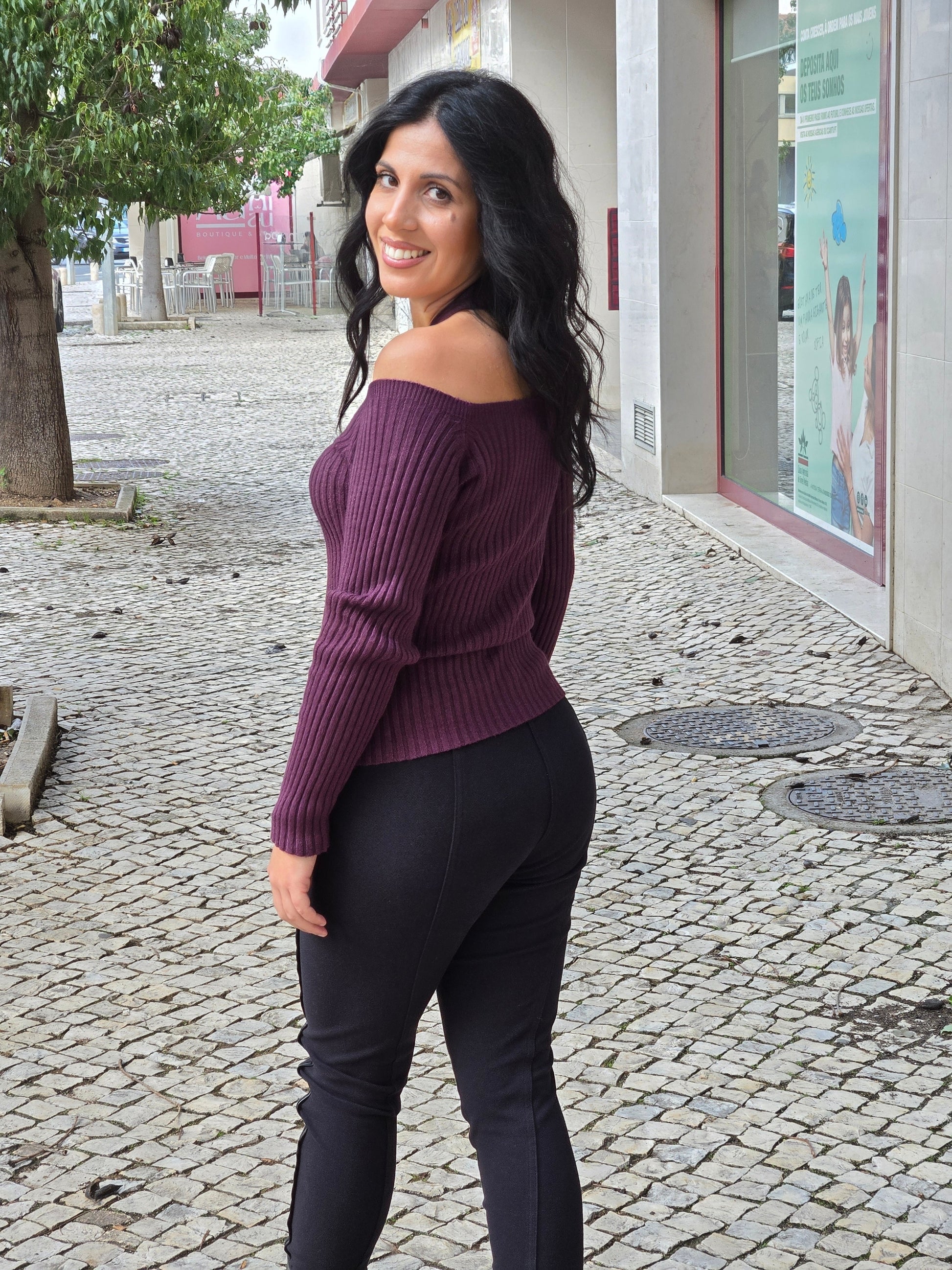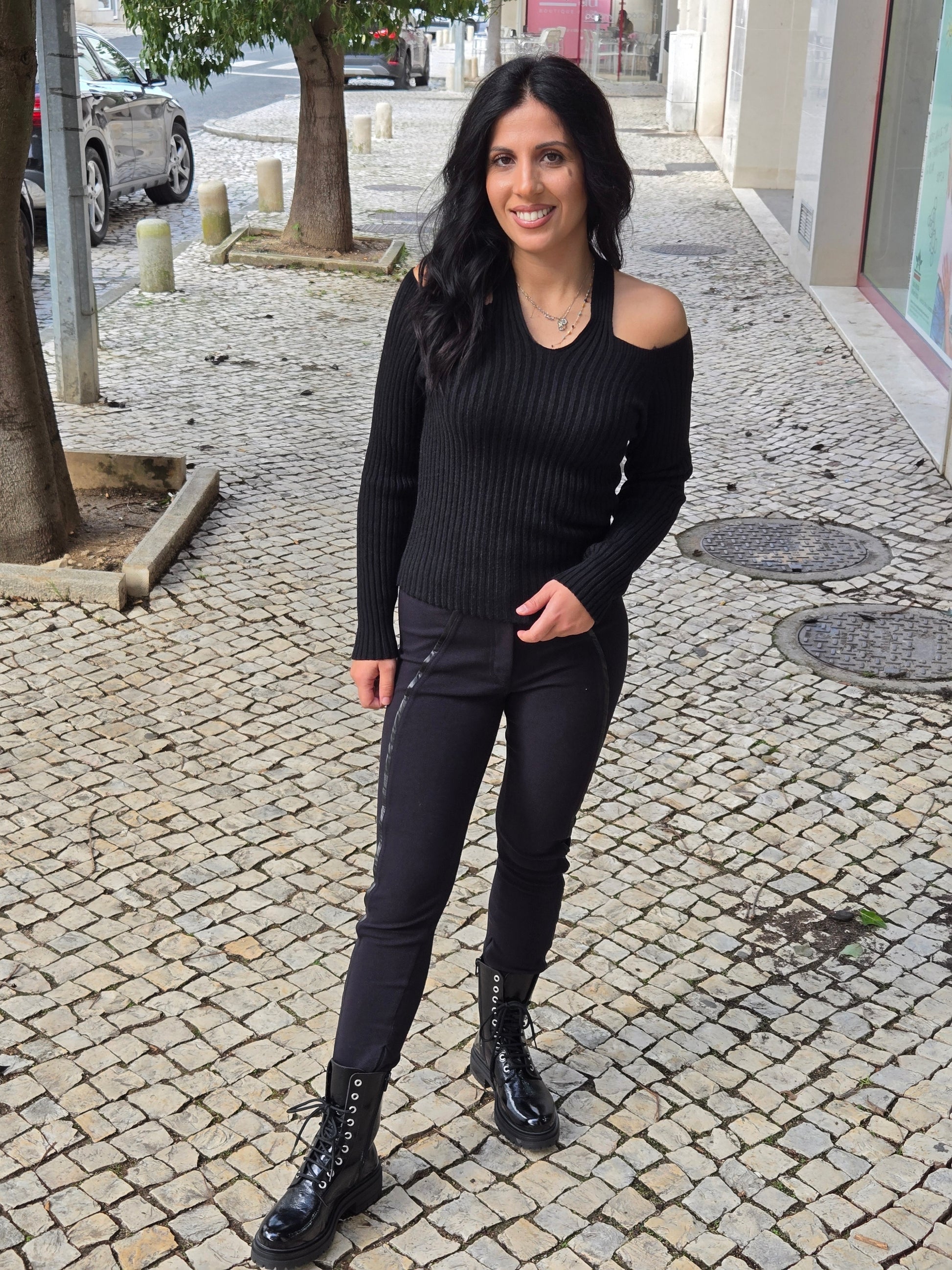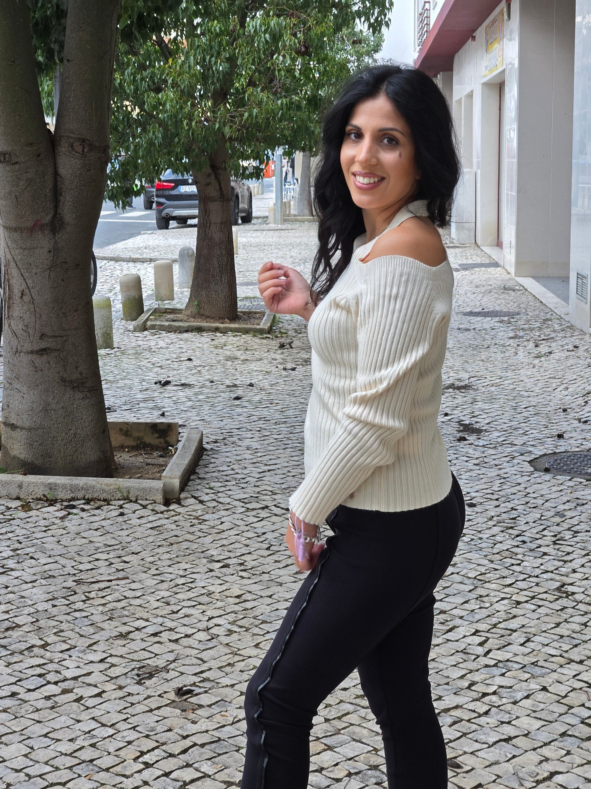 Camisola com decote em bico e mangas compridas. Detalhe de ombros descobertos.