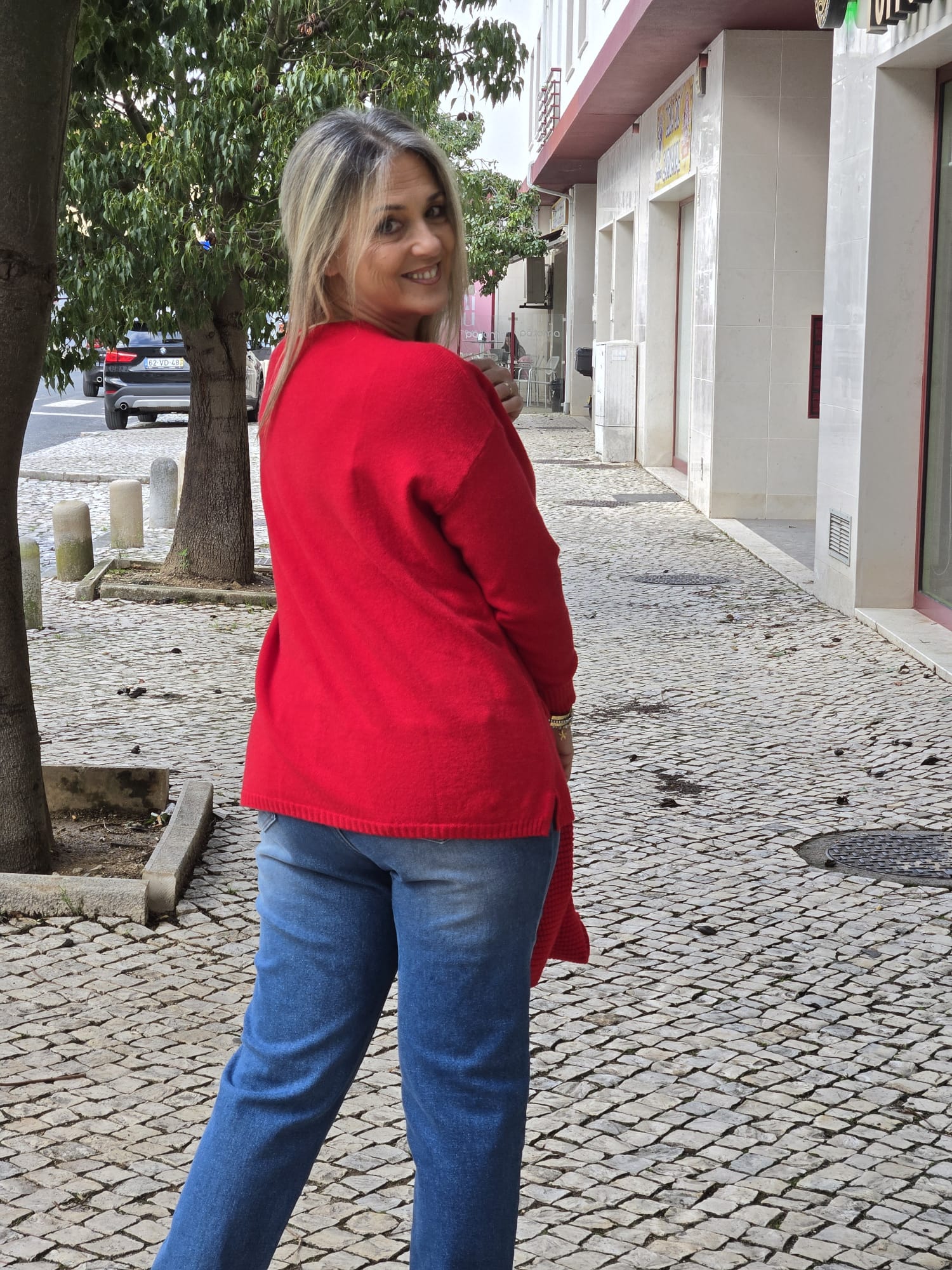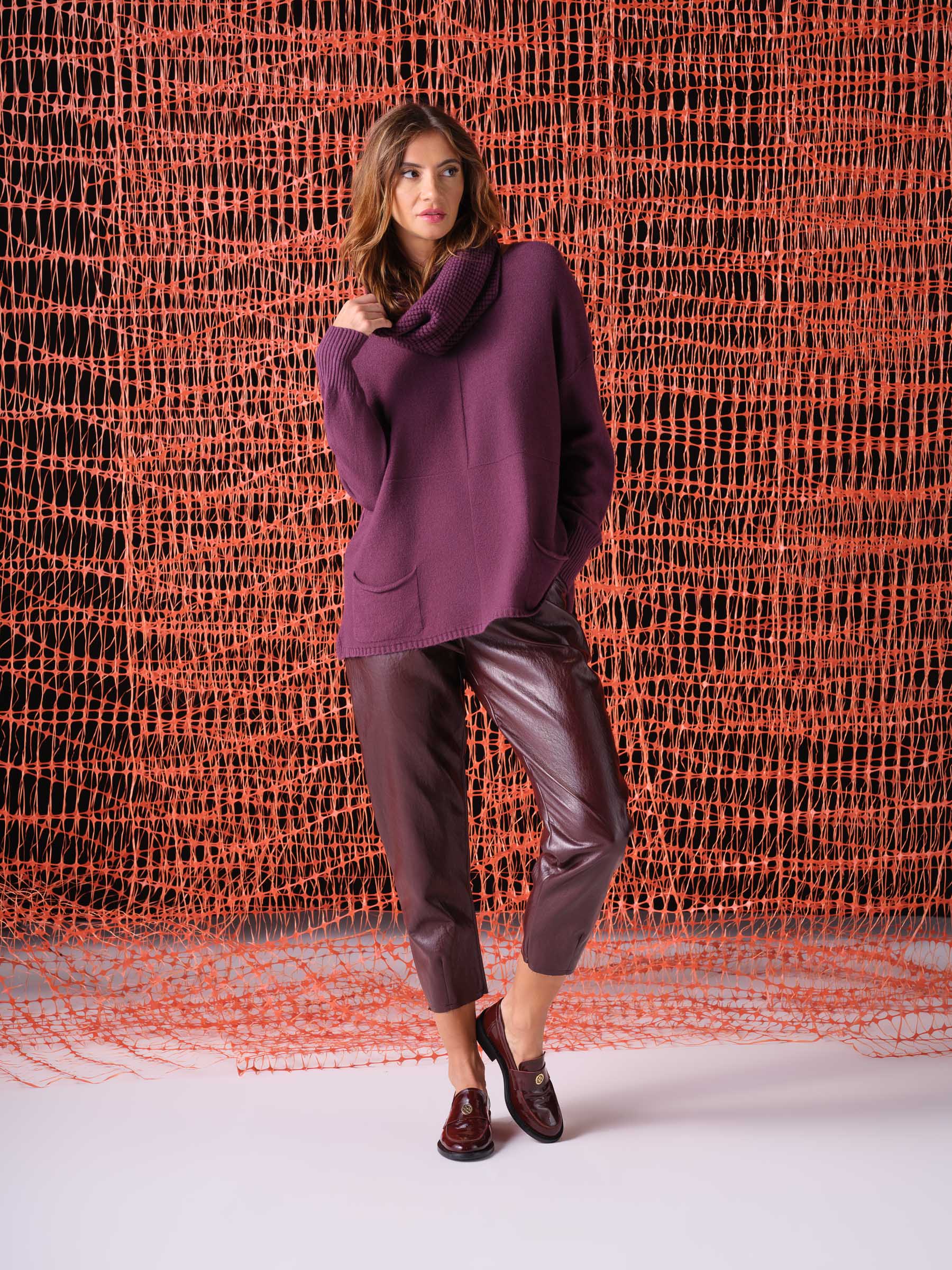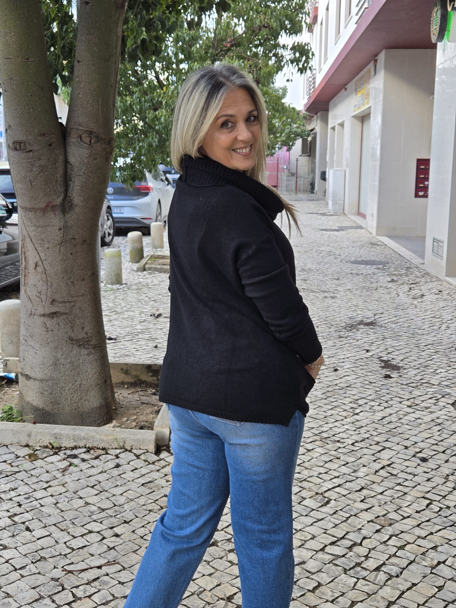 Camisola com decote redondo e gola amovivel. Detalhe de costuras marcadas na frente. Acabamentos com bolsos frontais.