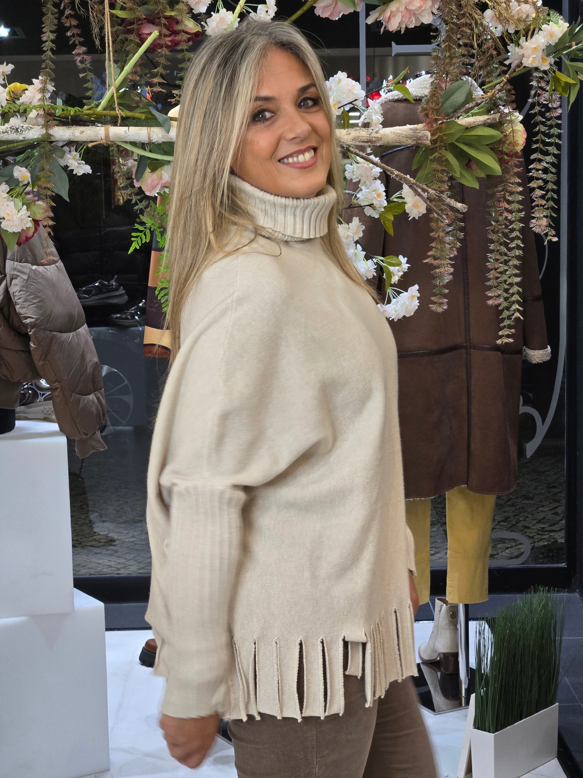 Camisola de malha lisa. Gola subida e manga comprida com ombro descaído. Efeito oversize. Acabamentos canelados. Detalhe de franjas parte inferior.