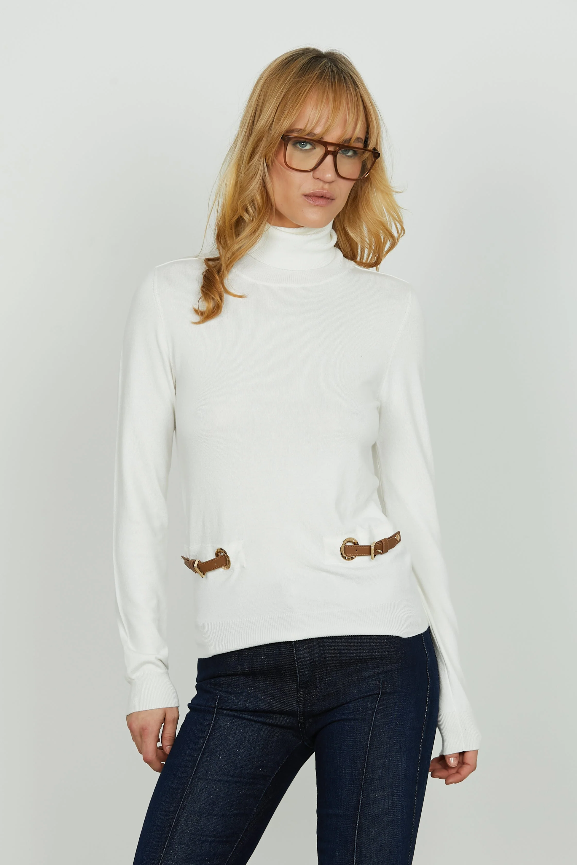 Camisola de malha com gola alta e manga comprida com terminação em nervura. Detalhe de presilhas na parte frontal.