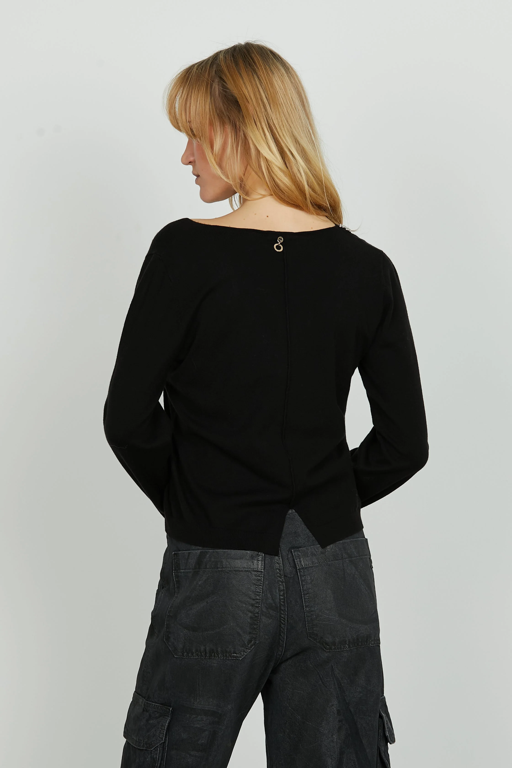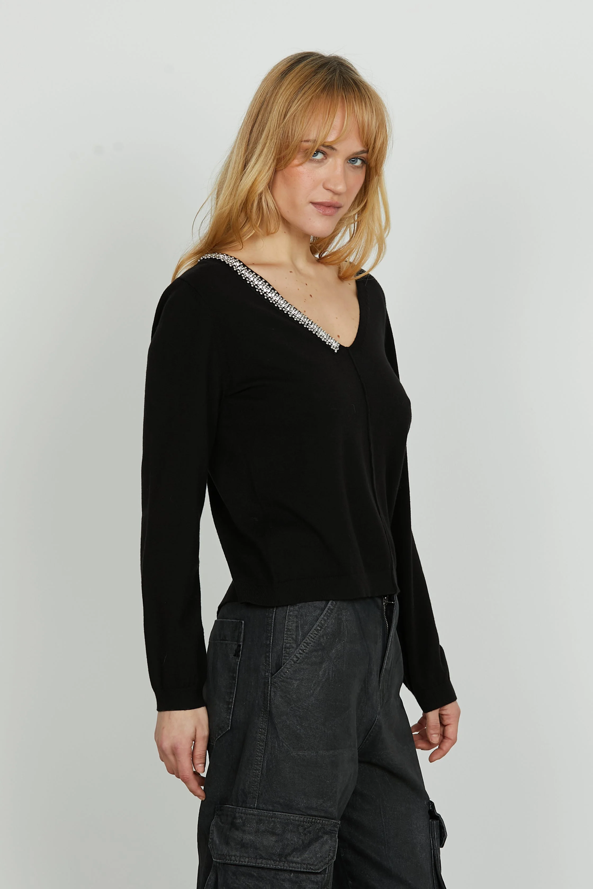 Camisola de malha com decote em V com manga comprida.