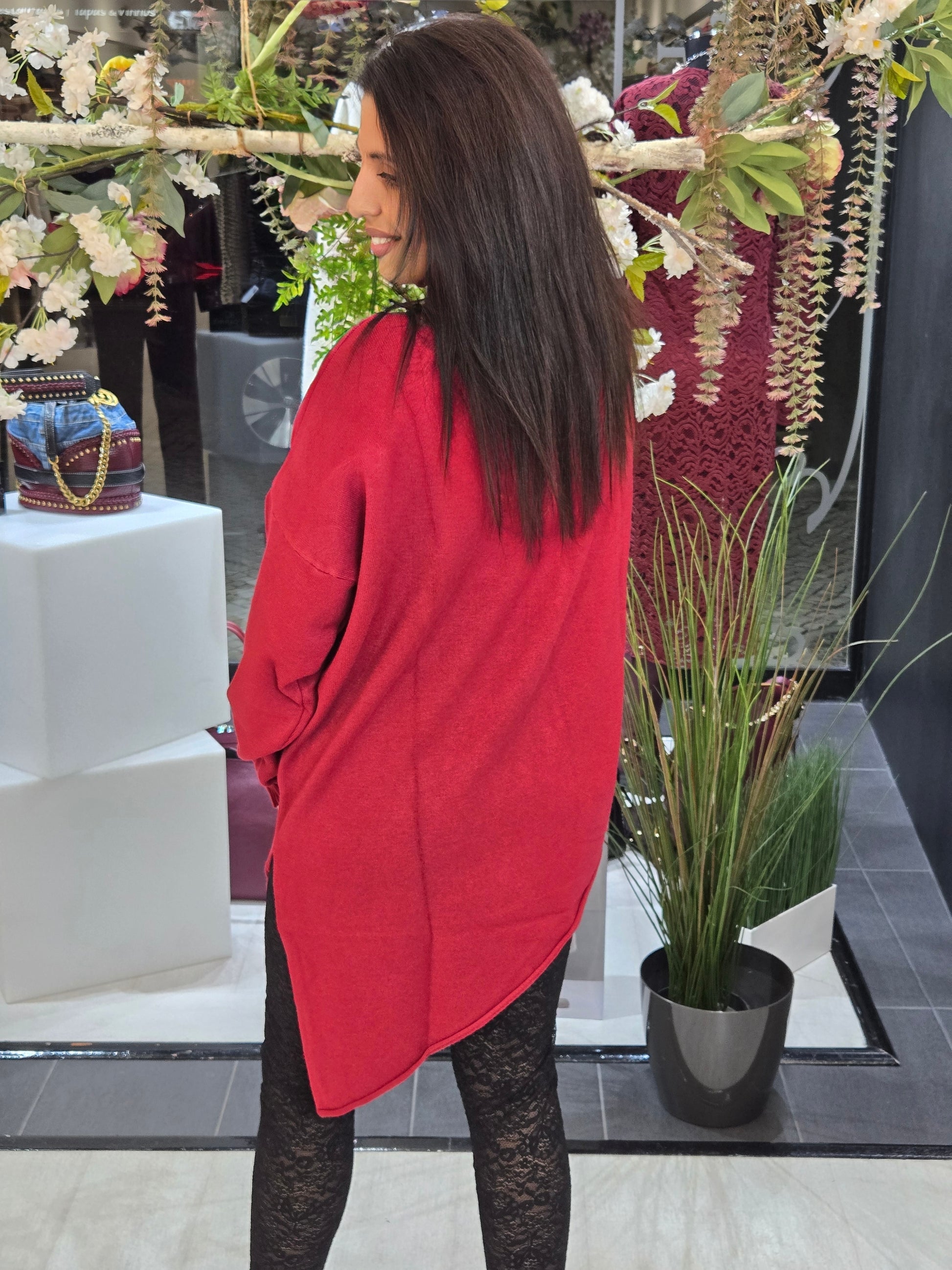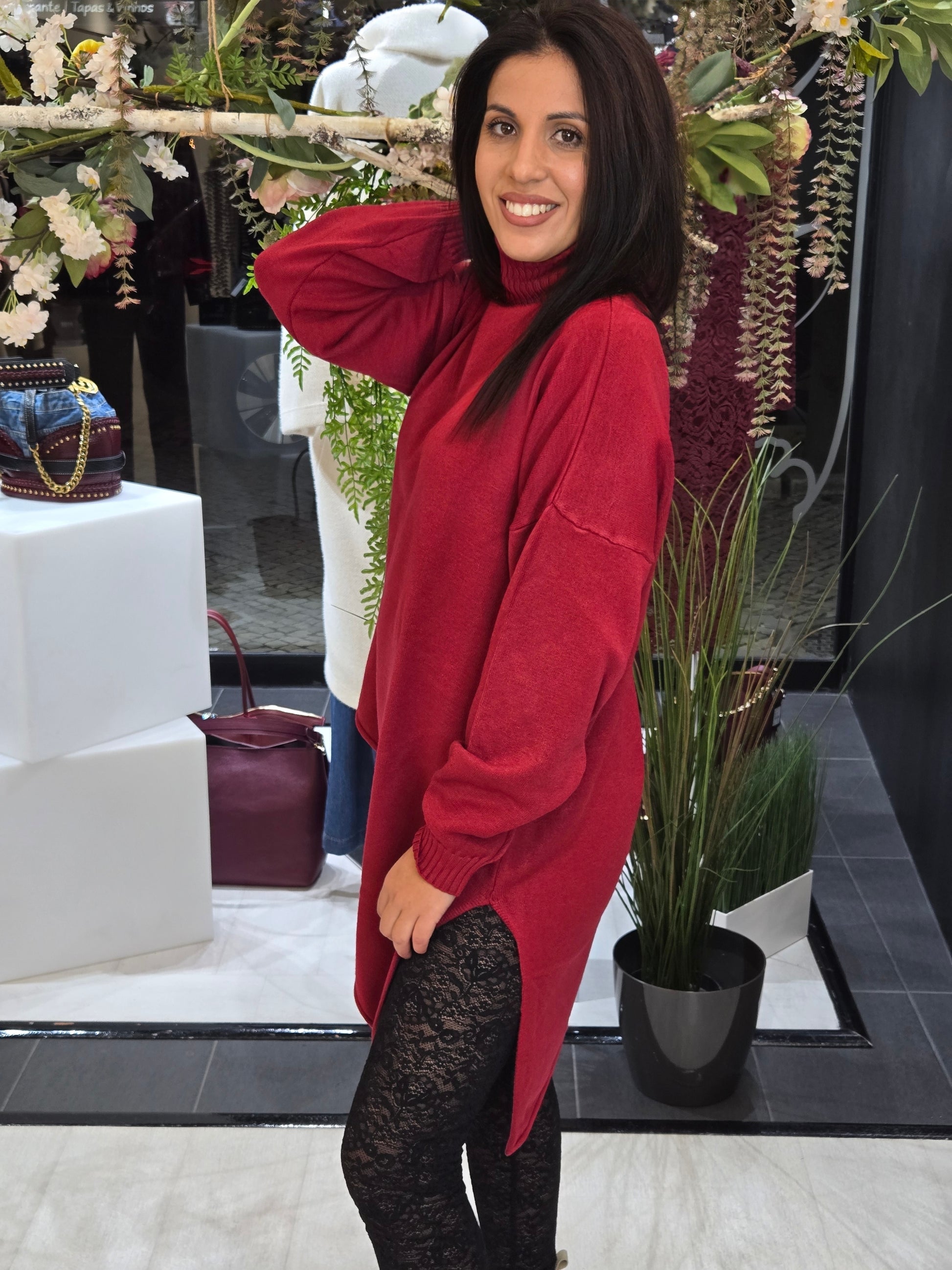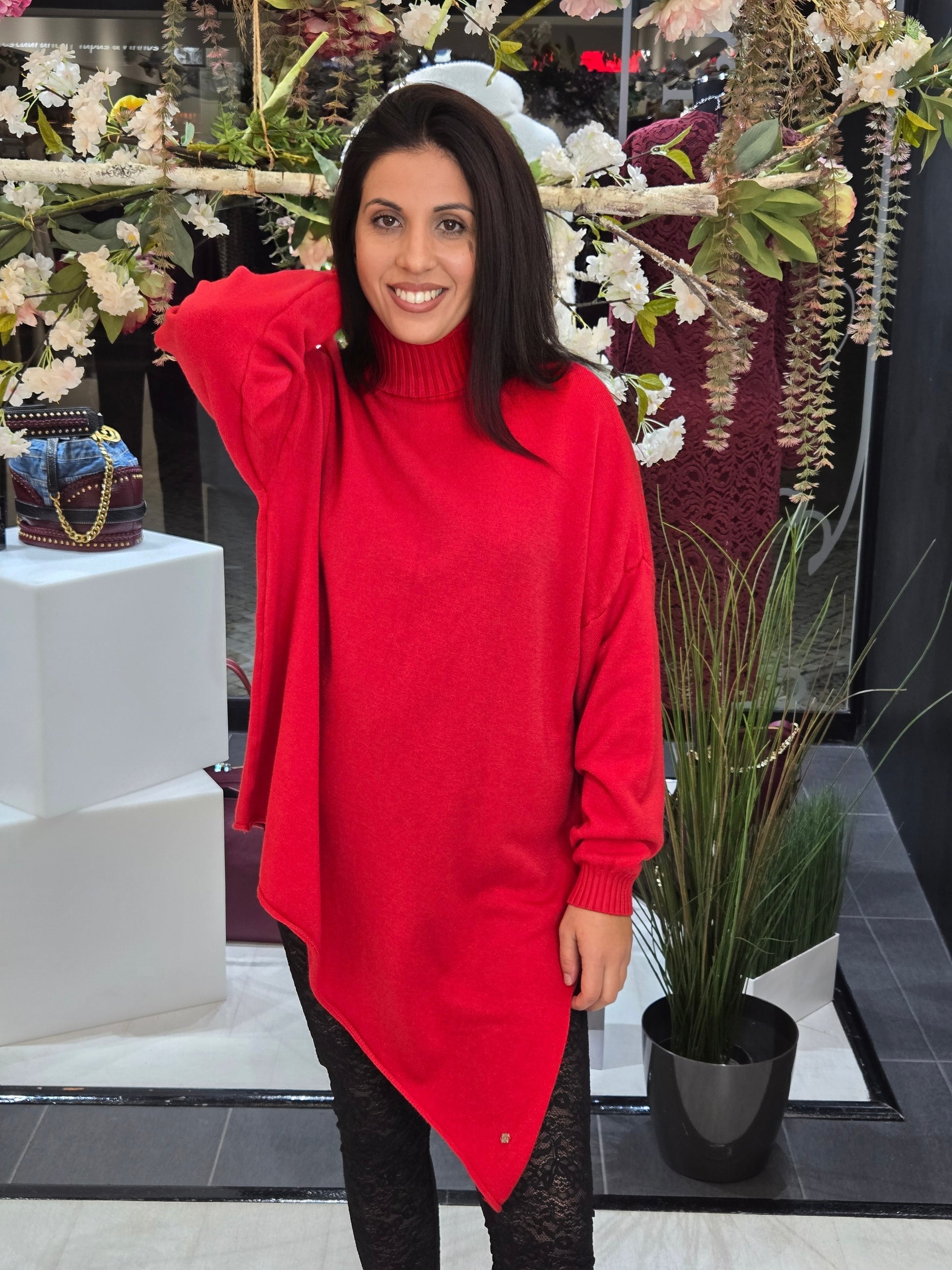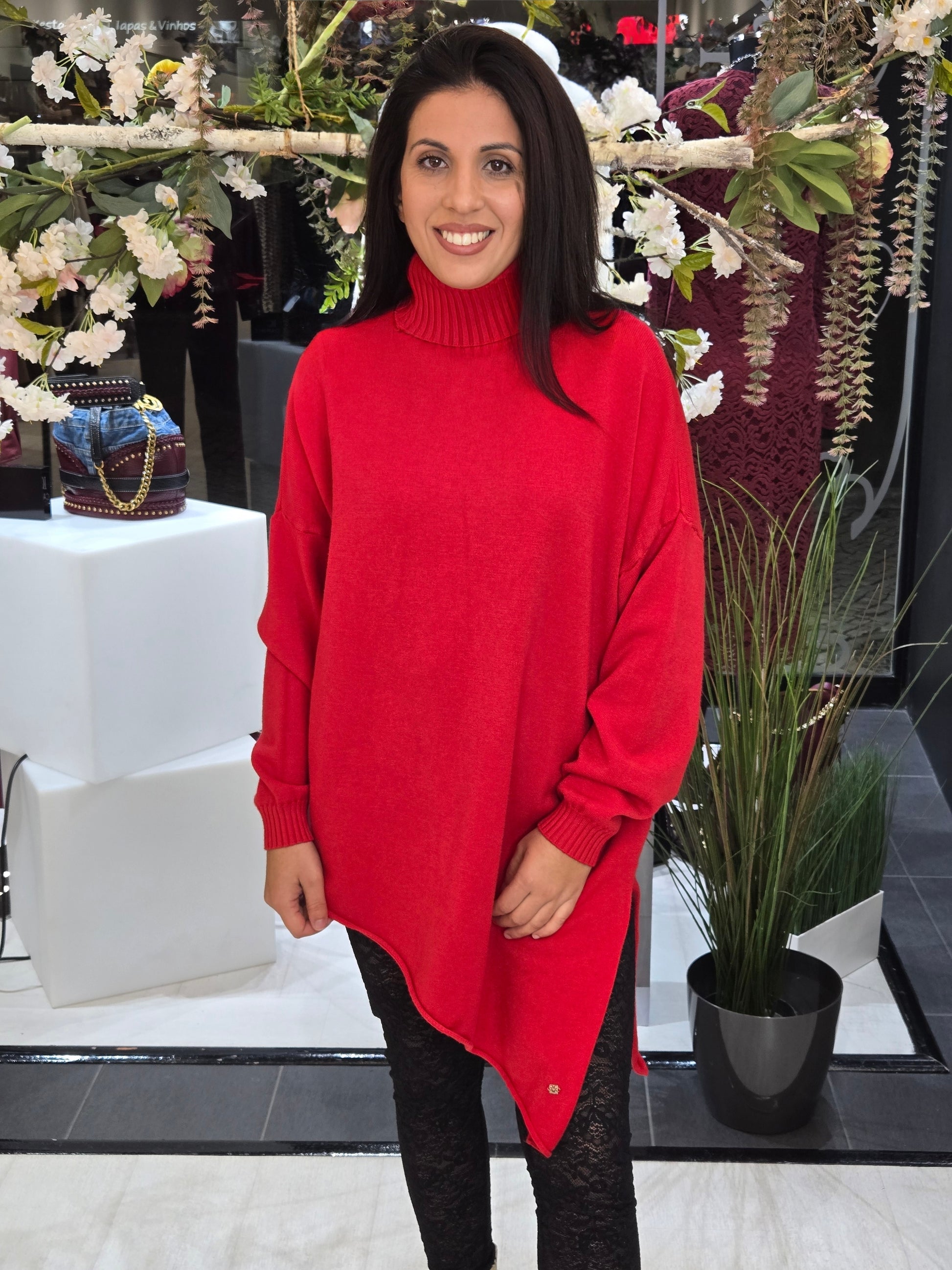 Camisola assimetrica de gola alta e manga comprida. Acabamentos em nervuras.
